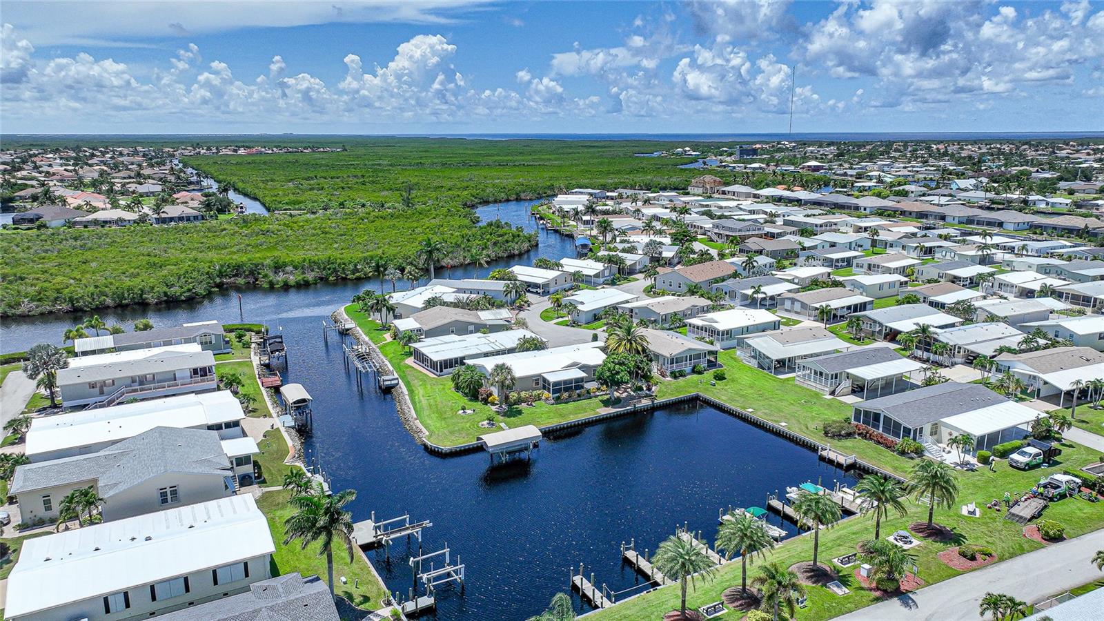 Bem-vindo ao seu pedaço de paraíso! SEM DANOS POR INUNDAÇÃO OU TEMPESTADE. Esta espaçosa casa modelo Palm Harbor, de 1.728 pés quadrados, à beira-mar, construída em 2007, está localizada no muito procurado condomínio fechado de propriedade de residentes de Windmill Village, em Punta Gorda. Oferecendo 3 quartos, 2 banheiros e uma variedade de recursos, esta casa fica em um terreno generoso e grande com acesso direto ao sereno Canal Tarpon. Entre para descobrir uma planta aberta com uma acolhedora sala de estar, área de jantar e uma cozinha lindamente decorada. A casa possui drywall e sancas por toda parte, criando uma atmosfera polida e refinada. Em 2023, a casa foi atualizada com um novo telhado e novo revestimento de vinil para maior tranquilidade. A cozinha é o sonho de qualquer chef, com um impressionante backsplash de azulejos decorativos, eletrodomésticos de aço inoxidável, amplos armários e piso de cerâmica para fácil manutenção. Uma grande despensa garante muito espaço de armazenamento. A lavanderia fica ao lado da cozinha e tem espaço para um freezer horizontal. O amplo quarto principal acomoda facilmente uma cama king-size e possui um enorme closet de 5,5 x 7,5, oferecendo muito espaço de armazenamento. O banheiro principal da suíte é um refúgio luxuoso com azulejos decorativos, pias duplas e um chuveiro múltiplo com seis chuveiros - perfeito para o máximo relaxamento. O segundo e terceiro quartos são de tamanho generoso e podem acomodar confortavelmente uma cama queen-size, com amplo espaço no armário para combinar. Aprecie a vista tranquila da beira-mar a partir de sua varanda fechada de 16 x 18, um local perfeito para seu café da manhã ou coquetel à noite. Este espaço climatizado está equipado com uma unidade mini-split de 18.000 BTU, proporcionando conforto durante todo o ano e novo carpete macio. Para quem precisa de armazenamento extra, esta casa oferece! No interior, você encontrará muito espaço de armazenamento e, para ainda mais espaço, a garagem para 2,5 carros (24' de profundidade x 22' de largura) é totalmente fechada, oferecendo amplo espaço para seus veículos e outros pertences. Pesque no seu cais ou faça uma viagem ao porto ou ao Golfo. Windmill Village oferece uma gama completa de comodidades para apoiar um estilo de vida social ativo, incluindo duas marinas privadas, uma rampa para barcos, armazenamento de trailers, poços de ferradura, shuffleboard, bocha, bilhar, quadras de pickleball cobertas e um grande centro comunitário com uma variedade dos clubes. O recém-construído Pavilhão junto à piscina aquecida é um local ideal para reuniões e eventos. Observe que o preço de compra não inclui as ações e títulos de compra de US$ 20.285, que serão reembolsados na revenda.
