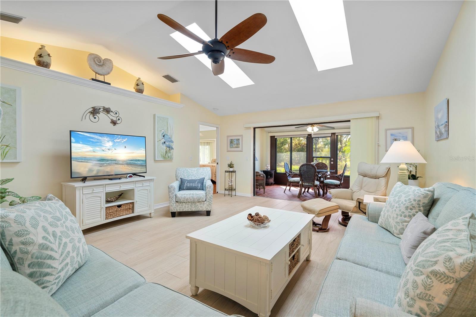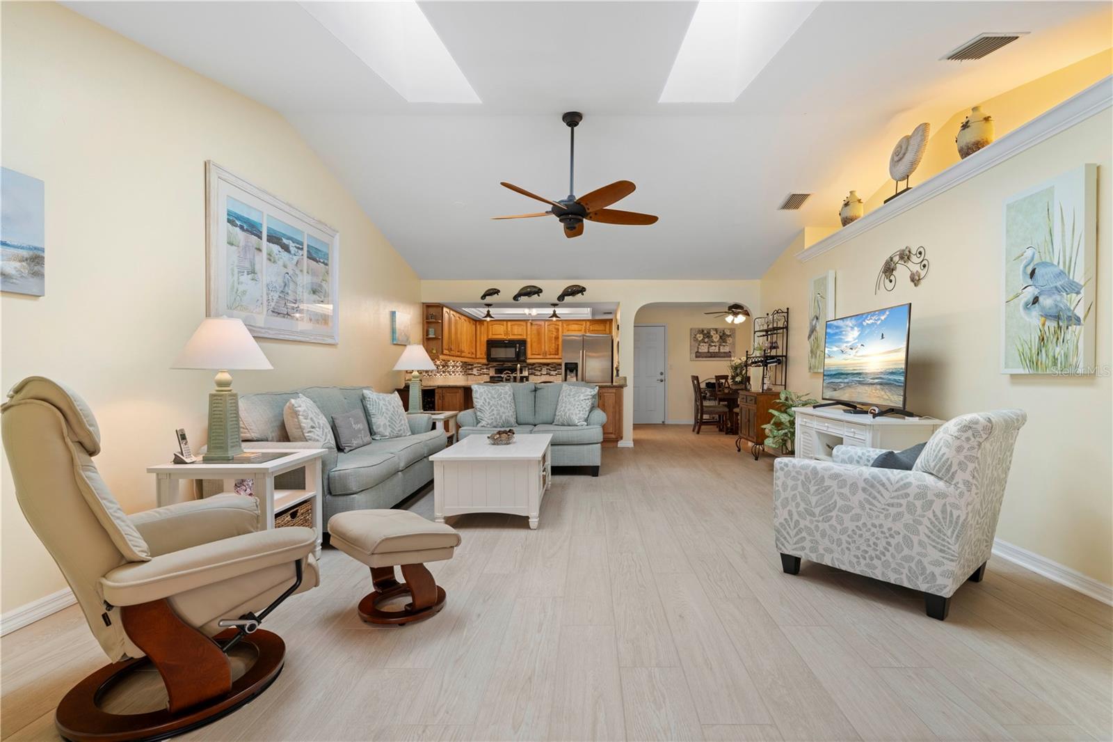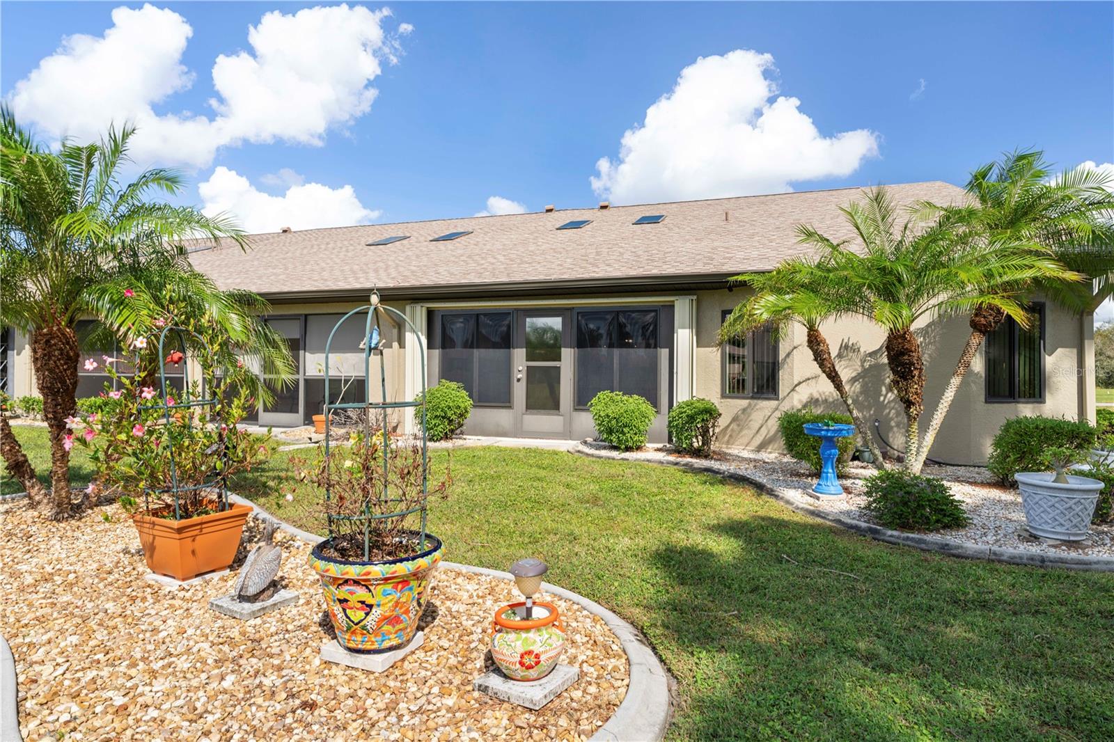 Turn-Key, unidade final da Pine View Villas em Heart of Deep Creek com Gerador de Casa e Proteção de Hurricane-Confira esta espaçosa villa de unidade final com garagem de 2 carros anexada em Pine View Villas, uma comunidade de mais de 55 anos em Deep Creek. O condomínio possui piso plano aberto e brilhante com cozinha atualizada, sala grande, área de jantar formal e lanai fechado. Os detalhes arquitetônicos incluem tetos de catedral, clarabóias e prateleira de exibição iluminada em Great Room, além de pisos atualizados por toda parte, incluindo pisos de ladrilhos de porcelana, com aparência de madeira na área principal da área de estar e pisos laminados com aparência de madeira nos quartos. A cozinha possui balcões de granito e armários de madeira, além de aparelhos atualizados, sob iluminação do gabinete e uma barra de café da manhã que abre para a grande sala. O layout modificado inclui dois quartos grandes, além de um escritório em casa/den anexo à suíte master. Ambos os quartos oferecem banheiros atualizados e privados. Lanai de ladrilhos tem vista para o espaço de verdura parecido com um parque atrás do condomínio. Uma porta de tela retrátil do outro lado da garagem combinada com uma entrada exibida e a Lanai Open permite a maravilhosa brisa cruzada quando aberta. O condomínio foi meticulosamente mantido e está em condição de mudança. Proteção de furacões fornecida por uma mistura de janelas de impacto, obturador rolante e obturador de acordeão externo em Lanai. Inclui um gerador de 12kW de 12kW de combustível duplo (propano e gás) com conexão na garagem. Novo aquecedor de água, novembro de 2024. Itens de chave em venda incluídos na venda-a maioria dos móveis, conjunto de utensílios de 8 peças com pratos, xícaras, copos e vários utensílios, além de roupas de cama e toalhas. Mobiliário Listagem disponível mediante solicitação. As comodidades do condomínio incluem uma piscina no solo com spa anexada. Deep Creek é uma comunidade crescente e restrita de ações que possui um campo de golfe semi-privado, playground, quadra de tênis, quadra de basquete e quilômetros de calçadas. Viva o sonho da Flórida aqui. Marque uma consulta hoje.