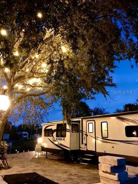 Este RV Resort é especial, assim como esta oportunidade de possuir com orgulho um dos locais mais bonitos na água que leva ao Rio Kissimmee e ao Lago Kissimmee. Este belo local fica no lado oeste do curso de água, considerado o lado sombreado. Quando estiver no Rancho no verão você entenderá porque é tão importante ter sombra. O lote 436 possui um carvalho muito grande que oferece sombra a partir das 10h30 quando você está sentado no pátio elevado com vista para o canal. O lote foi construído profissionalmente para ostentar uma parede de pedra que foi necessária quando a área original foi alongada em aprox. 6 pés para permitir uma área externa muito maior. Há uma parede de 4 pés de altura que envolve a área de cozinha. Existem 3 postes de coluna com luzes de abacaxi e luzes penduradas no alto do carvalho. As luzes externas estão acesas para um ambiente noturno maravilhoso. Do lado de fora, você sai do pátio e desce os degraus até o cais e o paredão. O paredão é composto por painéis de metal, não o antigo paredão de madeira original. há eletricidade e água no cais. É um ótimo lugar para sair e fazer piquenique, pescar, etc.