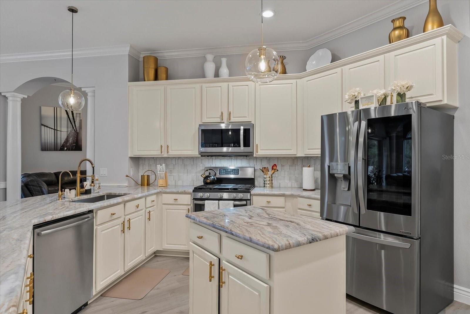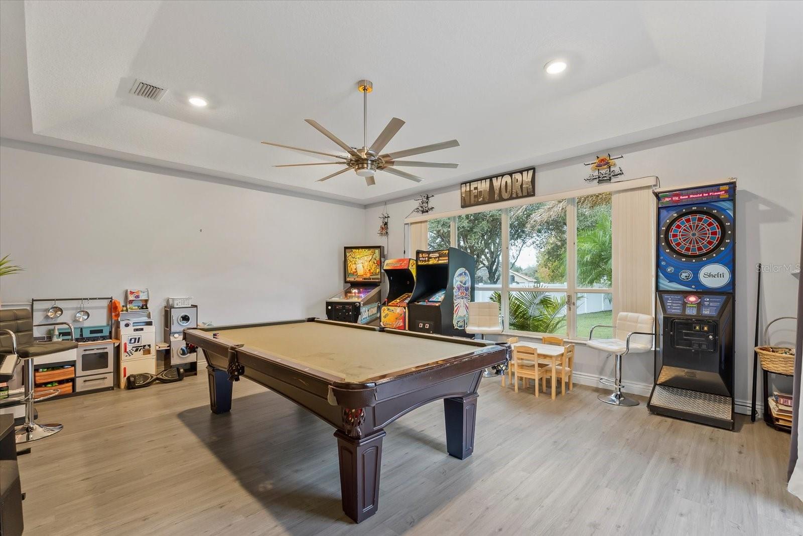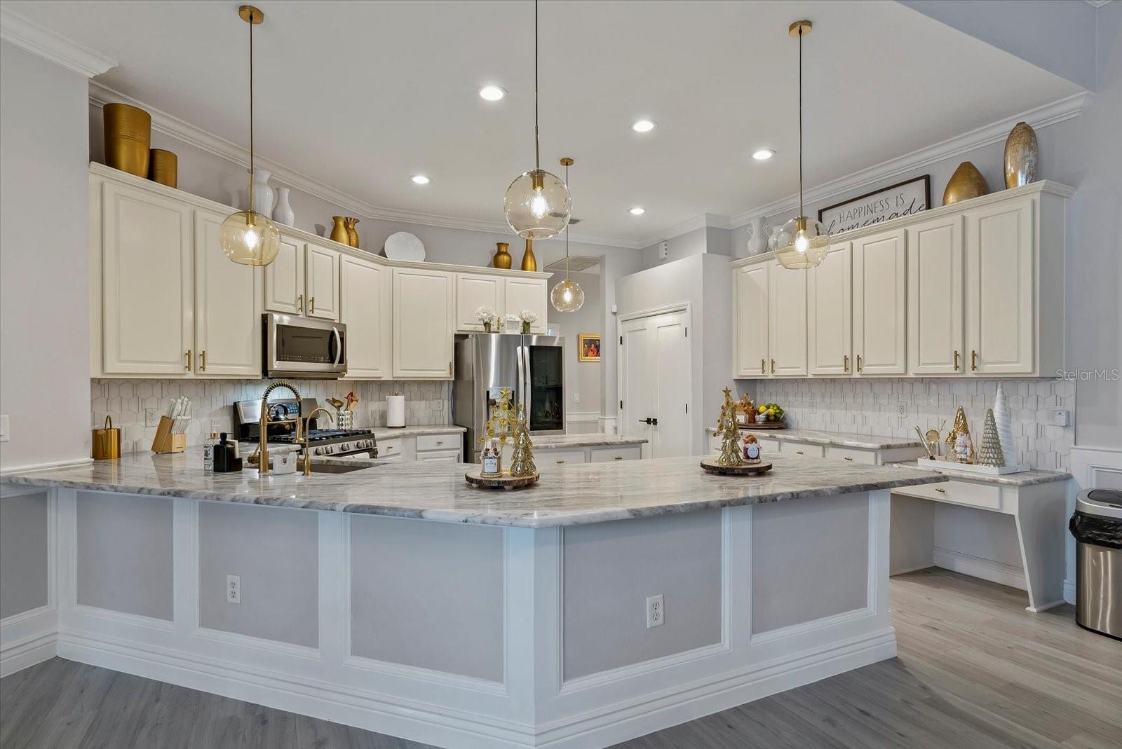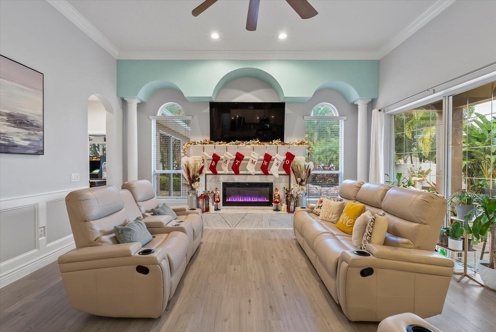 Esta casa de Creekside completamente atualizada oferece conveniência e charme em um condomínio fechado, minutos de lojas, restaurantes, parques e escolas de primeira linha. Esta casa foi elegantemente remodelada com muitos sinos e assobios extras pelo atual construtor/proprietário. Com interiores brilhantes e bem conservados, ele possui um impressionante apelo ao meio-fio e portas duplas de vidro com chumbo de grande tamanho. No interior, um grande hall de entrada divide as áreas formais de estar e jantar, com portas francesas levando a um escritório/covil de fora. Apresentando madeira costeira de tábuas de vinil de luxo em toda a casa contribui para uma sensação moderna de ponta com muita luz. A cozinha foi completamente remodelada há 2 anos, possui armários de madeira maciça, bancadas de pedra de quartzito, backsplash de telha de mármore, amplo armazenamento e utensílios de aço inoxidável, incluindo uma faixa de gás. A cozinha se conecta perfeitamente a uma espaçosa sala de família com luz natural abundante e acesso a um grande quintal cercado privado em mais de meio hectare, completo com uma extensa Lanai em forma de "L". O quarto principal oferece um teto de bandeja, espaço generoso no armário e uma suíte com uma vaidade dupla, chuveiro separado e banheira de jardim. O layout dividido de três vias fornece privacidade para os quartos secundários. An impressive bonus room / game room at the rear floods with natural light and showcases numerous upgrades, including 5" baseboards, upgraded lighting, architectural details, ample closet space, large windows, and high ceilings. The back yard is a tropical Florida oasis with extensive upgrades including heated lagoon pool with built in spa, rock waterfall, expansive patio area, large covered lanai, and outdoor kitchen with two XL Construído em grelha. Felizmente, Half Acre+ Yard é um ótimo espaço para a família e os animais de estimação desfrutarem.