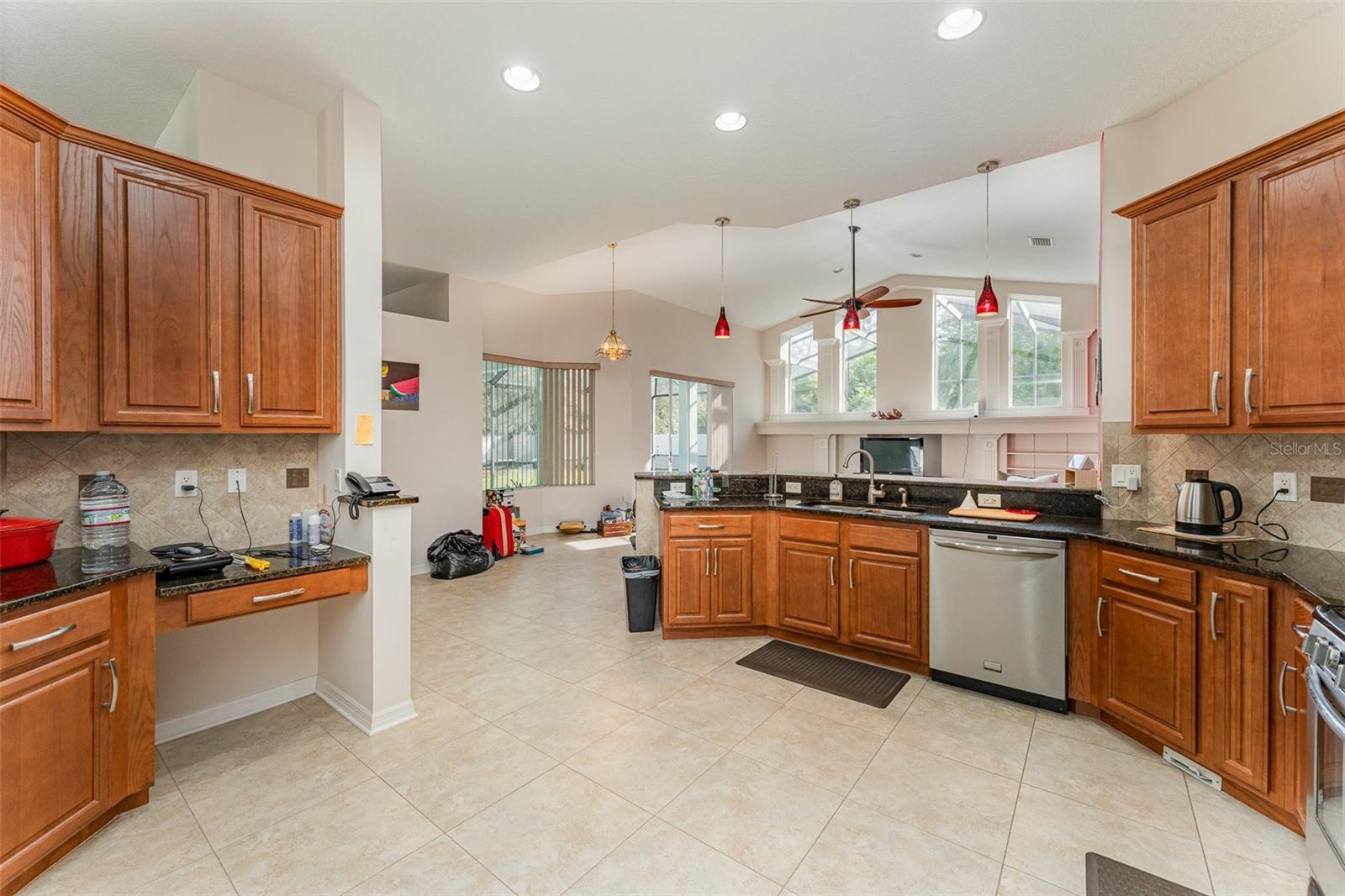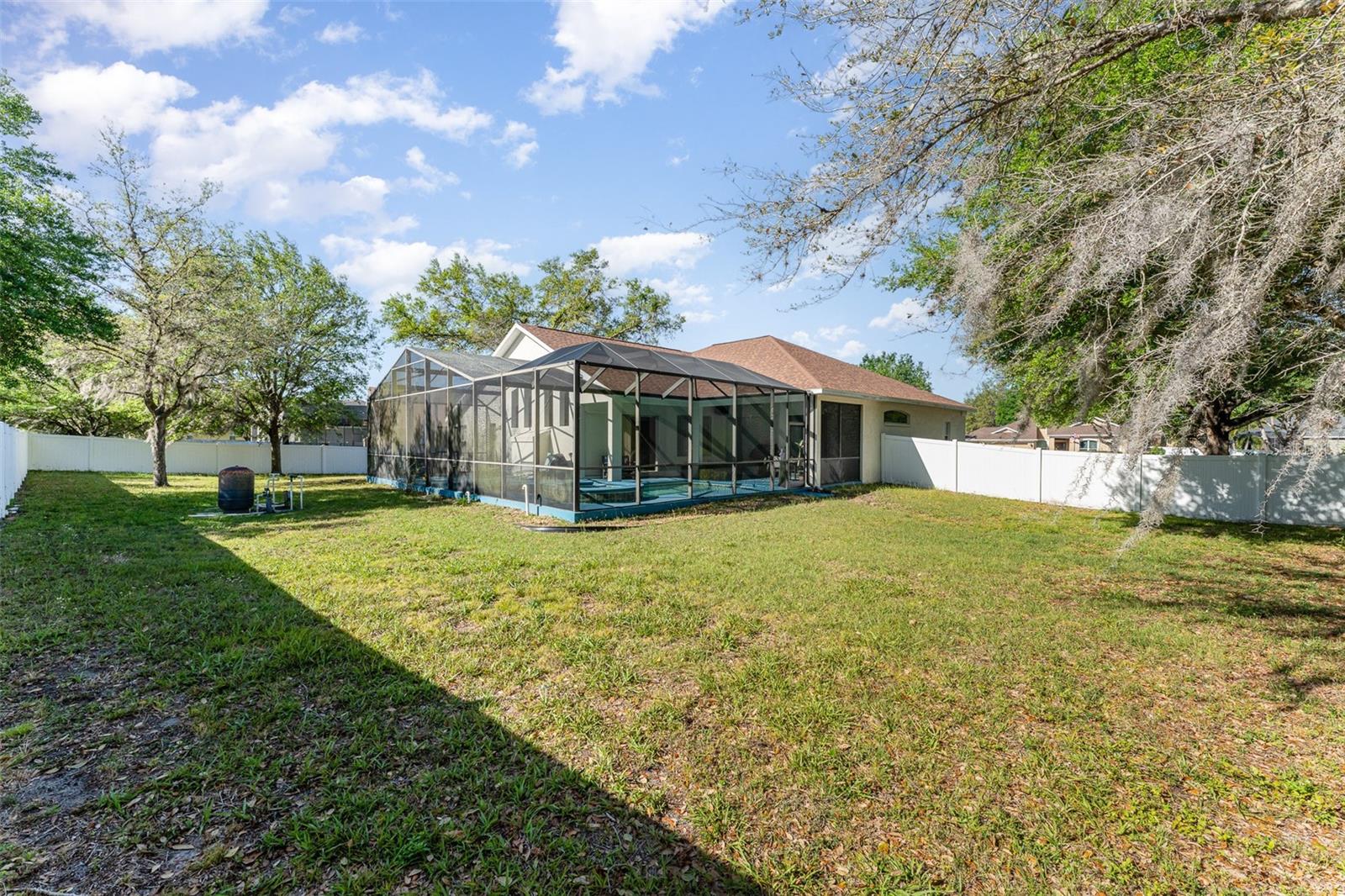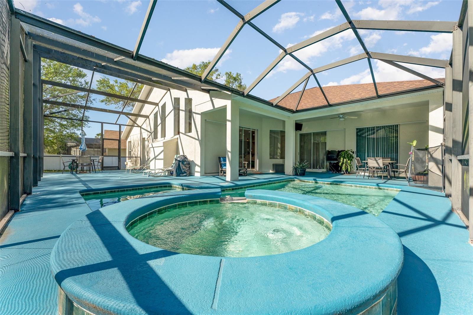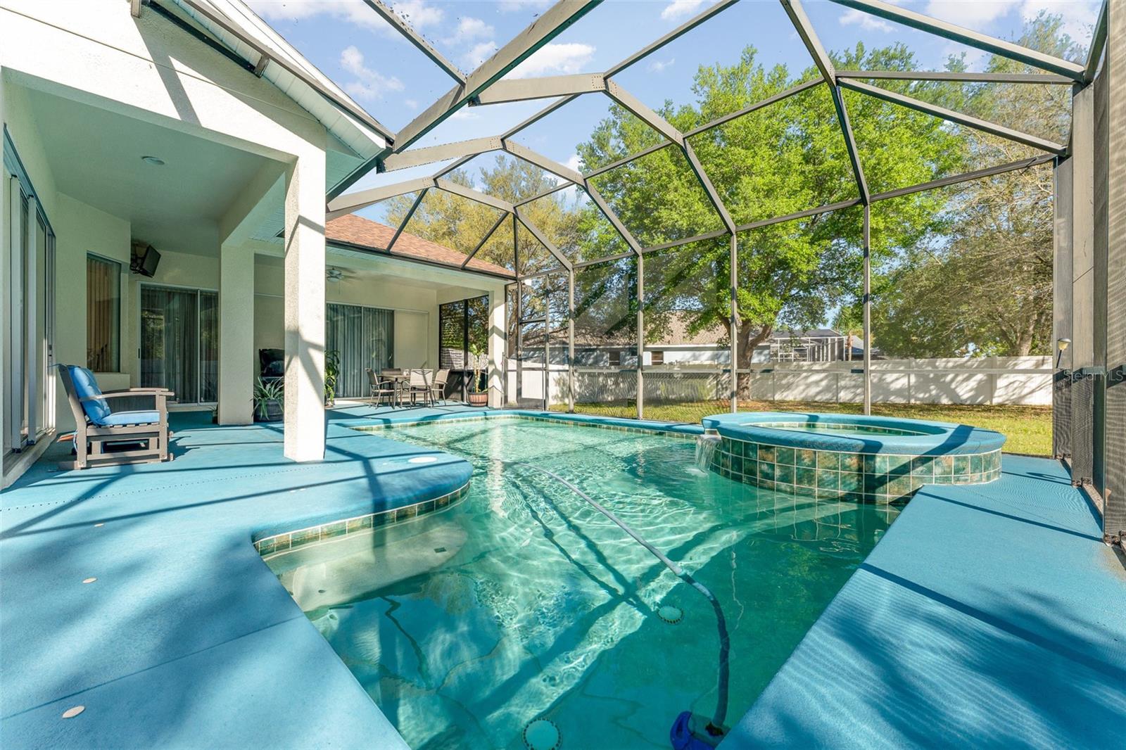 Bem-vindo a esta requintada home de 4 quartos, 3 banheiros e 3 carros, aninhada na cobiçada comunidade Creekside! Situado em quase 1/2 acre, ** novo telhado ** Revelar vistas deslumbrantes da piscina e conservação serena. O expansivo Lanai é perfeito para entretenimento. Com um apelo encantador, uma entrada de automóveis prolongada e a entrada de porta dupla, esta casa recebe você. Entre para encontrar uma casa de luxo meticulosamente mantida e atualizada. Desfrute de áreas formais de vida e jantar, juntamente com um escritório/covil particular. The chef's kitchen features granite countertops, 42" wood cabinets, stainless steel appliances, GAS stove, and a custom panoramic window in the breakfast nook. The kitchen flows into a spacious living room with vaulted ceilings, custom windows, plus POCKET sliding doors to the lanai. The master suite offers privacy, with TWO walk-in closets and an ensuite boasting dual vanities, granite countertops, garden tub and a Chuveiro de vidro sem moldura.