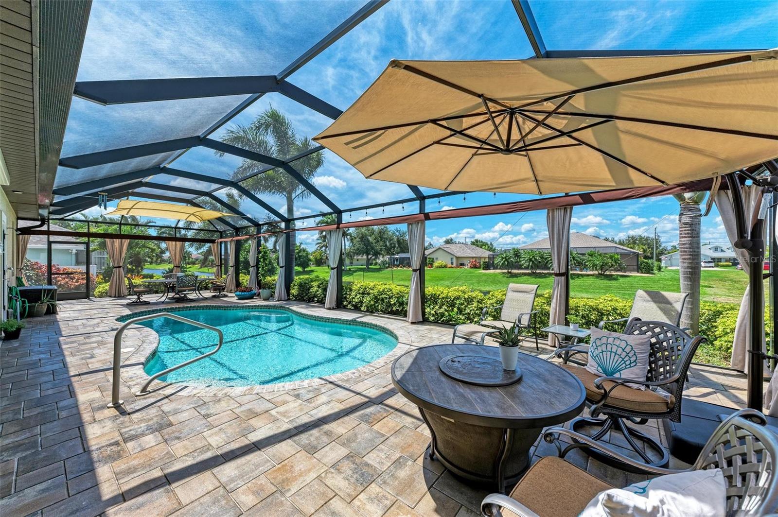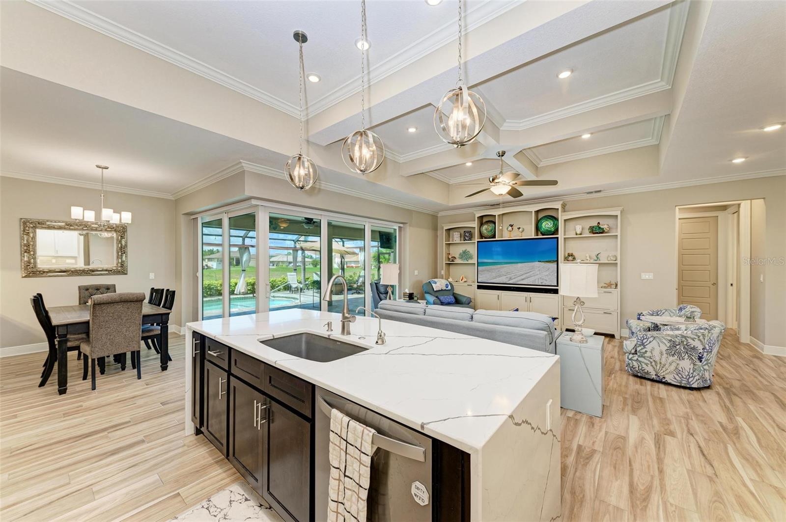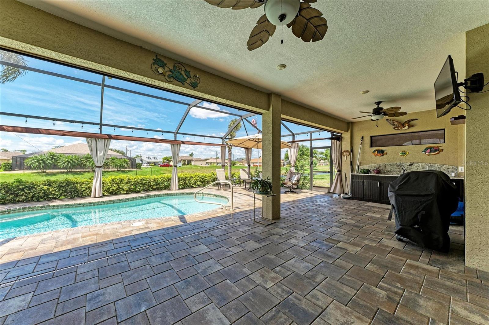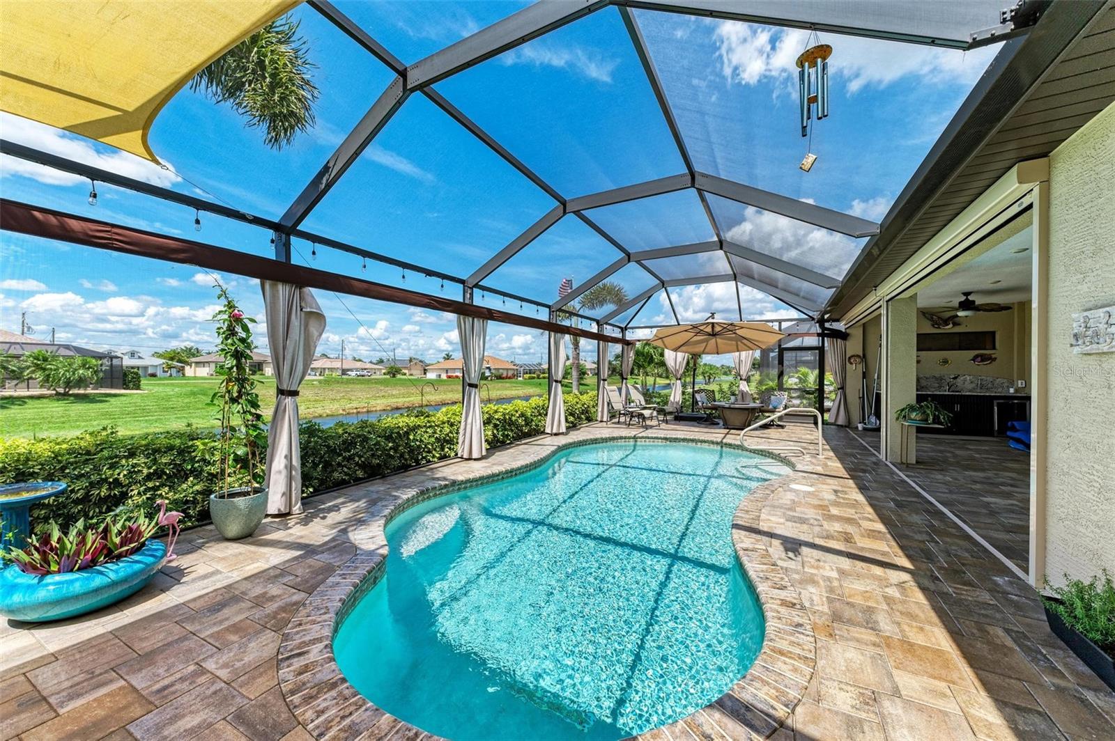 Ao entrar nesta entrada graciosa, observe os detalhes do teto da bandeja e o piso de cerâmica despreocupado em toda a casa. Observe que todas as portas internas têm 8 pés de altura e são portas sólidas de 6 painéis. O layout desta casa é excelente. O design dividido permite fechar os quartos enquanto as portas deslizantes retráteis proporcionam uma vista desobstruída da piscina a partir da cozinha, sala de estar e sala de jantar. Esta casa vive grande! A sala tem uma parede de arrumação embutida personalizada que alberga a TV e muito mais. O coração desta casa é a cozinha iluminada e iluminada com uma grande ilha superior de quartzo com bordas em “cascata”. Os amplos armários continuam na área de jantar, com muitas vitrines iluminadas. A varanda ampla é versátil o suficiente para entreter uma grande reunião familiar, com piscina aquecida de água salgada e cozinha externa, mas basta fechar as cortinas externas e você terá total privacidade por todos os lados. O canal de água doce é o local preferido de todas as aves pelas quais a Flórida é conhecida. A varanda possui telas de Kevlar com controle remoto que oferecem outra camada de proteção em caso de tempestade.