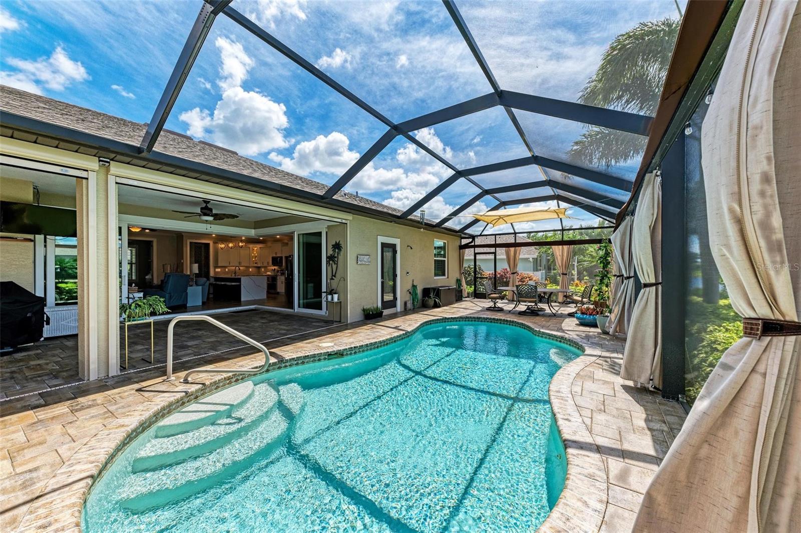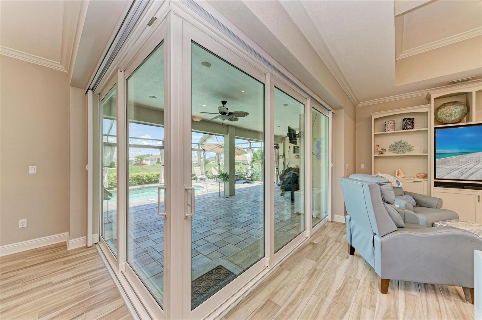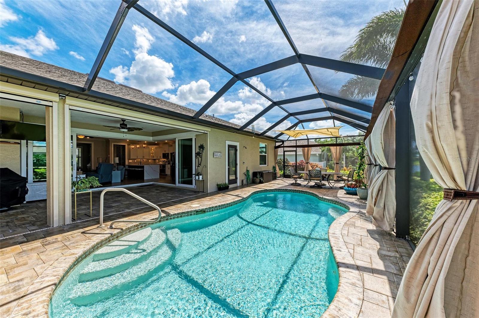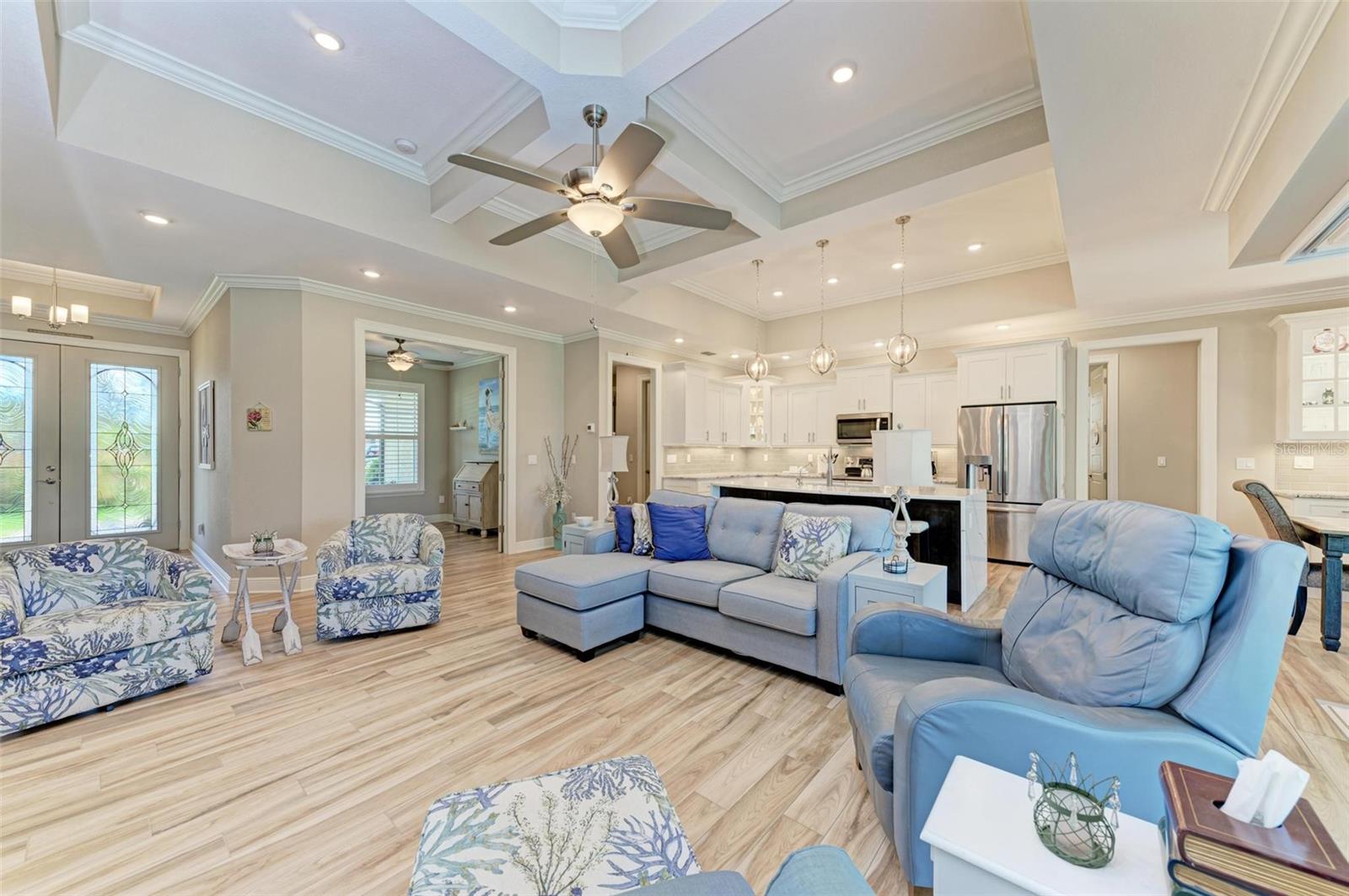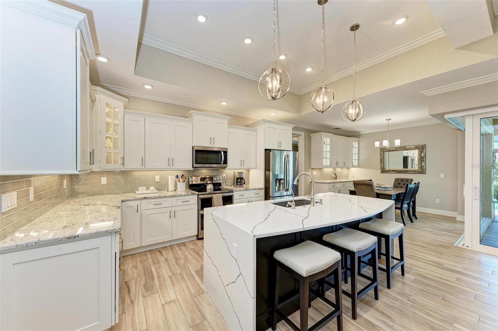 Ao entrar nesta entrada graciosa, observe os detalhes do teto da bandeja e o piso de cerâmica despreocupado em toda a casa. Observe que todas as portas internas têm 8 pés de altura e são portas sólidas de 6 painéis. O layout desta casa é excelente. O design dividido permite fechar os quartos enquanto as portas deslizantes retráteis proporcionam uma vista desobstruída da piscina a partir da cozinha, sala de estar e sala de jantar. Esta casa vive grande! A sala tem uma parede de arrumação embutida personalizada que alberga a TV e muito mais. O coração desta casa é a cozinha iluminada e iluminada com uma grande ilha superior de quartzo com bordas em “cascata”. Os amplos armários continuam na área de jantar, com muitas vitrines iluminadas. A varanda ampla é versátil o suficiente para entreter uma grande reunião familiar, com piscina aquecida de água salgada e cozinha externa, mas basta fechar as cortinas externas e você terá total privacidade por todos os lados. O canal de água doce é o local preferido de todas as aves pelas quais a Flórida é conhecida. A varanda possui telas de Kevlar com controle remoto que oferecem outra camada de proteção em caso de tempestade.