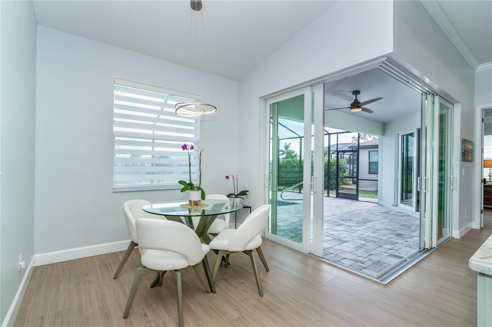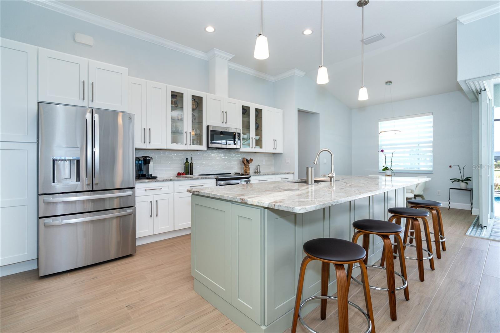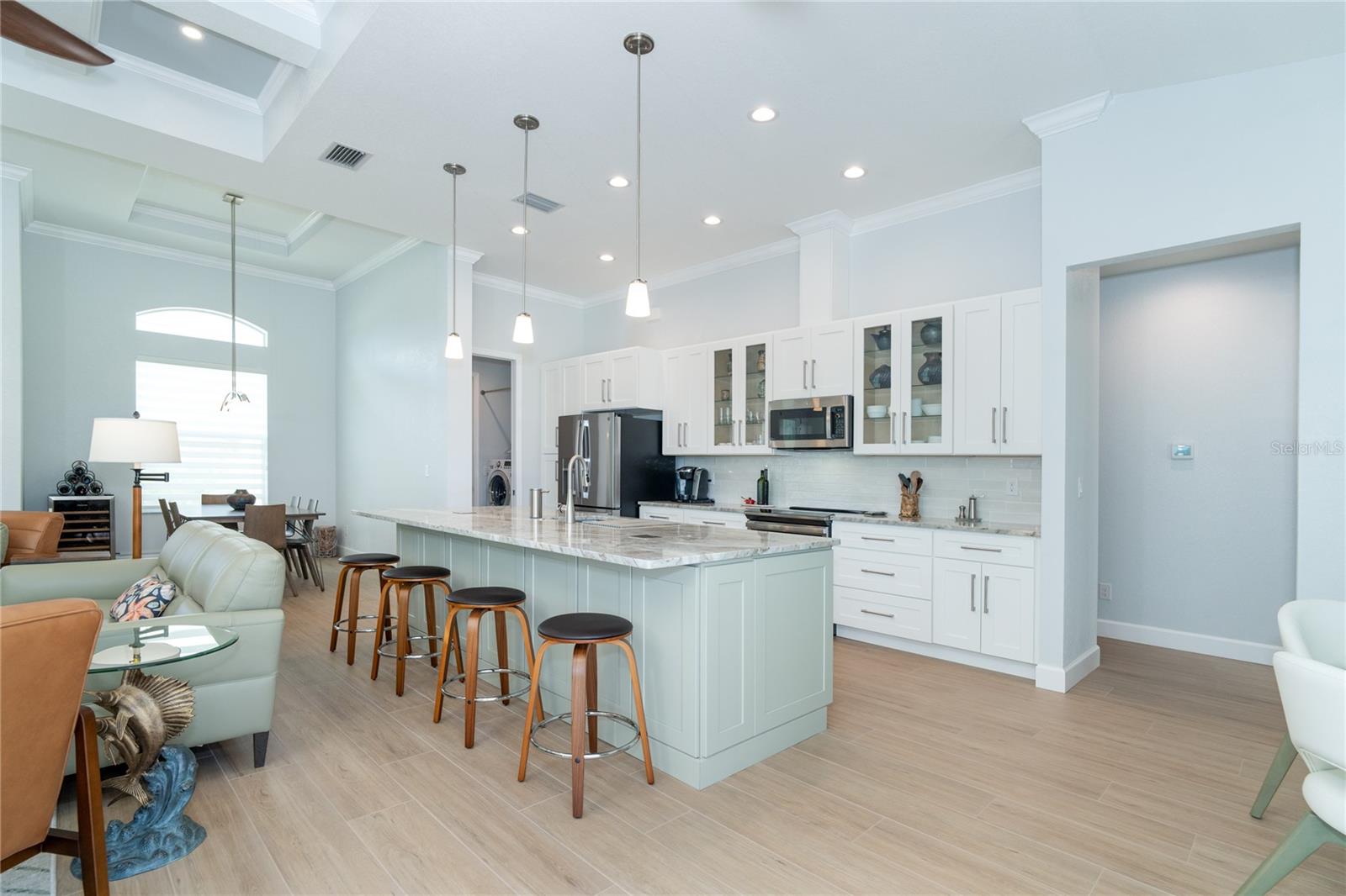 MELHOR QUE NOVO! Por que esperar para construir quando você pode mudar-se diretamente para esta deslumbrante casa contemporânea com piscina, construída sob medida, com 2 anos de idade, na muito procurada comunidade de golfe de Rotonda West, na prestigiada Rotonda Blvd North? Esta casa, localizada em um terreno de grandes dimensões de 80 'x 200' (0,37 acres) na zona de inundação X preferida, possui uma planta baixa de conceito aberto cuidadosamente projetada com várias atualizações do construtor e do proprietário por toda parte. A partir do momento em que você passa pela porta dupla de vidro sem barreiras e entra no vestíbulo elevado, você será cativado pela planta dividida, iluminada e aberta, que separa a suíte principal dos quartos 2 e 3, garantindo privacidade em lados opostos do quarto. área de estar principal. O design contemporâneo da casa apresenta detalhes elegantes, como tetos altos com sancas duplas, iluminação e ventiladores personalizados de alta eficiência, teto em caixotões com iluminação extra, portas de 8', portas de bolso, controles deslizantes de 90 graus, acabamento de base de 5 ¼ ”e elegante Piso em porcelanato de tábuas de madeira por toda parte. A cozinha do chef está equipada com equipamentos G.E. Aparelhos perfilados em aço inoxidável, armários com fechamento automático com prateleiras deslizantes Shelf Genie no gabinete e uma ilha espaçosa (50" P x 9'9,5" L) com assentos e armazenamento em ambos os lados. Lindas bancadas de quartzito nível 3 e um backsplash de azulejos personalizado elevam o espaço, tornando-o um verdadeiro paraíso culinário. O banheiro da suíte principal oferece uma experiência luxuosa com um chuveiro grande para lavagem de carros com bancos combinando, porcelanato, detalhes decorativos em azulejos e piso de pedra selado, bem como uma banheira de imersão separada. Janelas e portas de vidro de impacto com isolamento duplo fornecem proteção contra furacões sem esforço. Os destaques adicionais incluem uma espaçosa garagem para 3 carros com revestimento de piso epóxi e poliaspártico personalizado, um novo telhado (instalado em fevereiro de 2023) com uma barreira resistente à água atualizada e uma piscina personalizada lindamente projetada. A piscina de água salgada aquecida de 11'x25' inclui revestimento Pebble tec durável, azulejos decorativos e reflexivos, uma cachoeira em arco, uma bomba de velocidade variável de 1,8 e uma grande gaiola de piscina de 18'x37' com pátio de pavimentação adjacente e passarela. Recursos externos, como meio-fio personalizado, cantaria, paisagismo personalizado e iluminação aumentam ainda mais a atratividade do meio-fio da propriedade. O orgulho de propriedade é evidente em todos os cantos desta casa. Agende hoje mesmo a sua visita privada e experimente o charme e a qualidade desta propriedade excepcional!