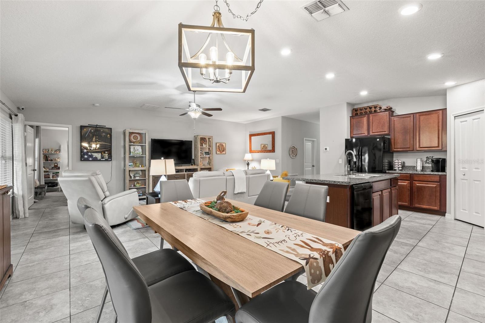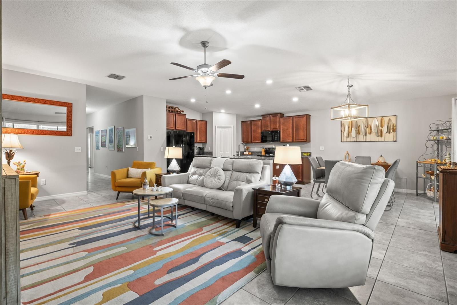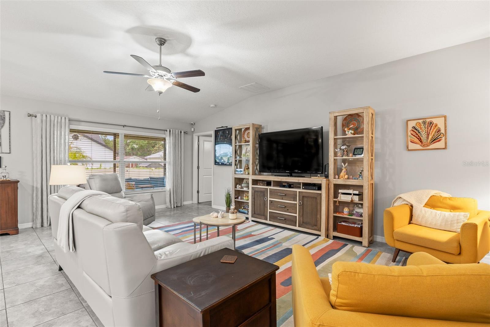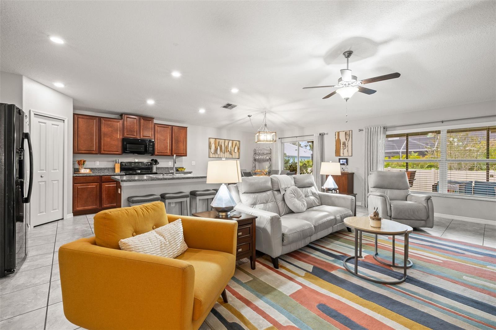 Bem-vindo de casa nesta residência lindamente mantida de 4 quartos e 2 banheiros, aninhada em um bairro tranquilo com muitas comodidades comunitárias, incluindo uma piscina espumante, vários parques, playgrounds e um parque de cães dedicado a um curto passeio. Entre neste imaculadamente mantido em casa através de uma entrada exibida e, em seguida, através da porta da frente na belo piso de azulejo cinza que flui por todas as principais áreas de estar. Os quartos secundários estão todos posicionados na frente da casa e compartilham um banheiro com uma combinação de chuveiro/banheira e vaidade de altura de conforto. Todos os quartos são acarpetados. O coração da casa é uma grande sala de conceito aberto, área de jantar e combinação de cozinha-perfeita para a vida cotidiana, divertida e fazer memórias. The kitchen features 42” wood cabinets, sleek laminate countertops with a granite look, decorative backsplash, a center island, and all appliances are included. The spacious primary suite, located in the back of the home, offers a private retreat with a barn-door entry to an en-suite bathroom featuring dual comfort-height vanities, a walk-in glass shower, private toilet area, and a generously sized walk-in closet. Step outside through the sliding doors Fora da área de jantar em um grande e exibido Lanai com fãs de teto duplo-prontos para a sua TV externa ou uma configuração divertida.