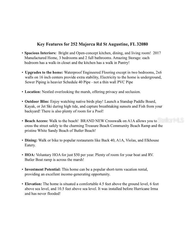 VISTAS incríveis do PÂNTANO em 252 Majorca Rd! NUNCA INUNDOU! Esta casa pré-fabricada de 2017 é um pedaço do paraíso praiano, com 3 quartos, cada um com closet. Esta residência convida você a revisar sua extensa lista de características que mostra seus atributos excepcionais. A documentação disponível inclui ficha de características, divulgação do vendedor, vistoria, certificado de elevação, planta baixa e mapa de acesso à praia! Para obter acesso, entre em contato conosco ou com seu corretor de imóveis. Situado em meio a pântanos serenos, imagine começar seus dias com o nascer do sol de tirar o fôlego no Frank Butler County Park West e sua vibrante reserva natural. A fauna local realça o charme da região, enquanto a maré alta oferece oportunidades perfeitas para paddleboarding e caiaque diretamente do seu quintal. Ao anoitecer, os céus se transformam em um espetáculo de cores, criando um cenário pitoresco a cada noite. Este retiro privado oferece mais do que apenas uma casa – promete um estilo de vida. Com uma caminhada pela praia comunitária, você tem acesso direto às areias intocadas de Butler Beach. Desfrute da proximidade de excelentes restaurantes em lugares como Back 40 A1A, Violas e Elkhouse Eatery, todos ideais para passeios descontraídos. O HOA voluntário da comunidade aprimora este cenário idílico, tornando-o um lugar encantador para se viver ou uma opção atraente para um aluguel por temporada lucrativo. Elevada a 10,5 pés acima do nível do mar, a casa garante segurança contra as intempéries e possui uma estrutura bem construída com um interior espaçoso, uma varanda com tela, uma fogueira e um deck com vista para o pântano, encapsulando o melhor estilo de vida costeiro. Não perca a oportunidade de possuir esta encantadora propriedade costeira!