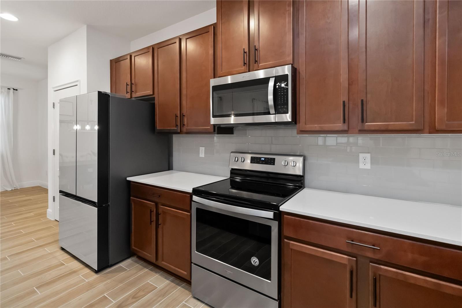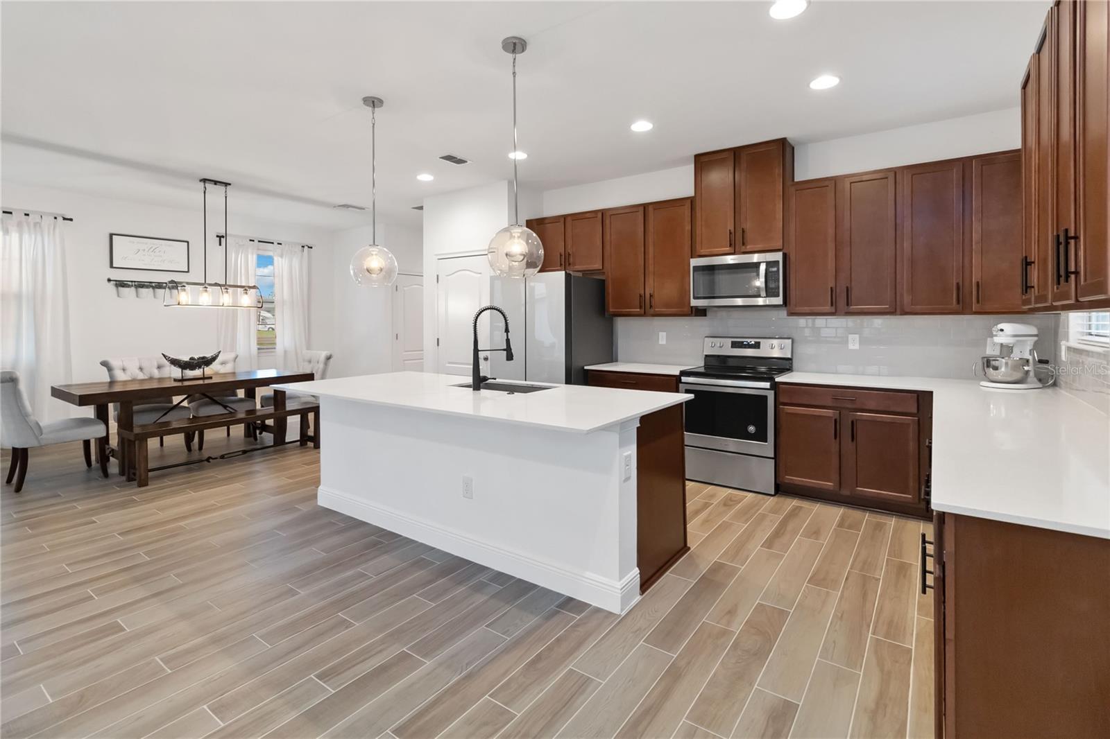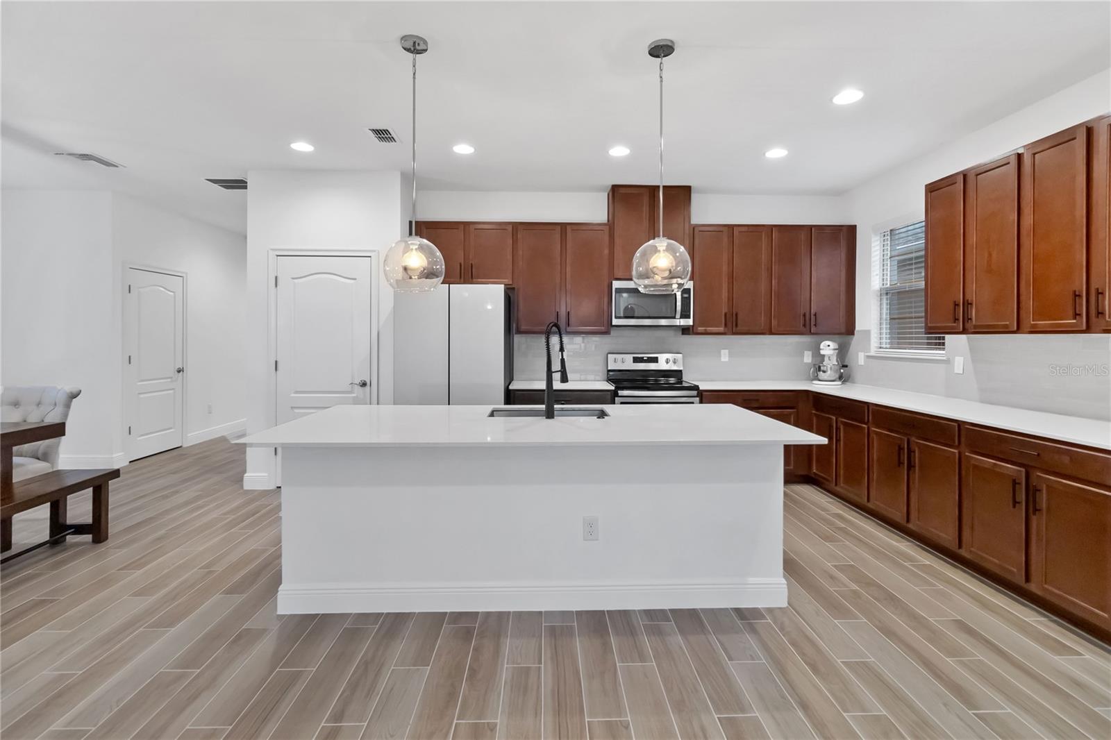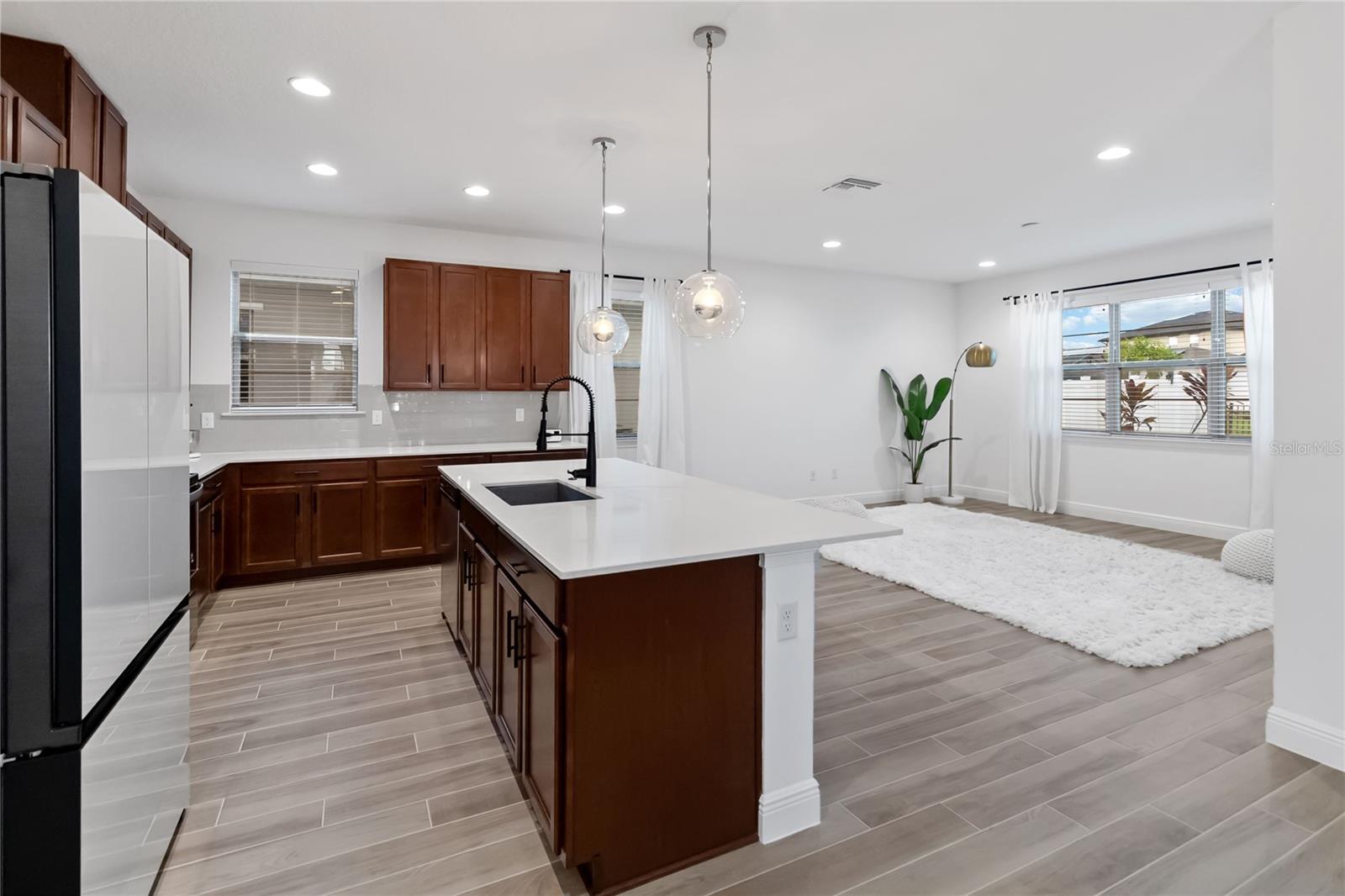 Bem -vindo à sua casa de sonho na prestigiada comunidade de Harmony West! Esta requintada residência de dois andares possui 4 quartos espaçosos, 3 banheiros luxuosos, tetos de 10 pés nos dois andares e uma série de acabamentos interiores modernos que exalam elegância e sofisticação. O primeiro andar possui pisos de ladrilhos recém -instalados, proporcionando uma sensação elegante e contemporânea e um quarto de hóspedes e banheiro completo proporcionam conveniência extra. Um grande armário de escadas oferece amplo espaço para todas as suas necessidades de armazenamento. Desfrute de cozinhar em uma cozinha gourmet com armários de 42 'e alças pretas elegantes, backsplash de telha, uma geladeira atualizada da Samsung sob medida, bancadas de quartzo que são complementadas por uma torneira preta e iluminando o ambiente moderno. Avise as escadas e experimente conforto e conveniência com um sistema HVAC leve UV e uma grande lavanderia completa com uma pia e armários. O quarto primário possui um grande closet e uma porta de celeiro que leva ao banheiro principal que mostra o piso de ladrilhos novos, um chuveiro de pia duplo semelhante a um spa e uma vaidade de pia dupla com luminárias bonitas e atualizadas. Dois quartos adicionais e um banheiro completo com pisos de ladrilhos atualizados também estão localizados no segundo andar. Situado em um grande estacionamento de canto, sem vizinhos de um lado, esta casa oferece privacidade e tranquilidade. A varanda dos fundos fechada é perfeita para relaxar, e o exterior meticulosamente paisagístico acrescenta um apelo incrível. O enorme quintal é perfeito para hospedar e divertir! Uma banheira de hidromassagem de água salgada está incluída para o seu relaxamento e prazer. Do outro lado da rua, você encontrará um parque de playground e cães, ideal para amigos divertidos e peludos. A Harmony West oferece uma variedade de comodidades, como uma piscina de estilo resort, fitness center e clubhouse com taxas baixas de HOA, garantindo uma vida comunitária confortável e vibrante. Além disso, fica a uma curta distância de carro do centro de St. Cloud, shopping centers, restaurantes, hospitais, bancos e Melbourne Beach. Não perca sua oportunidade de possuir um pedaço do paraíso!