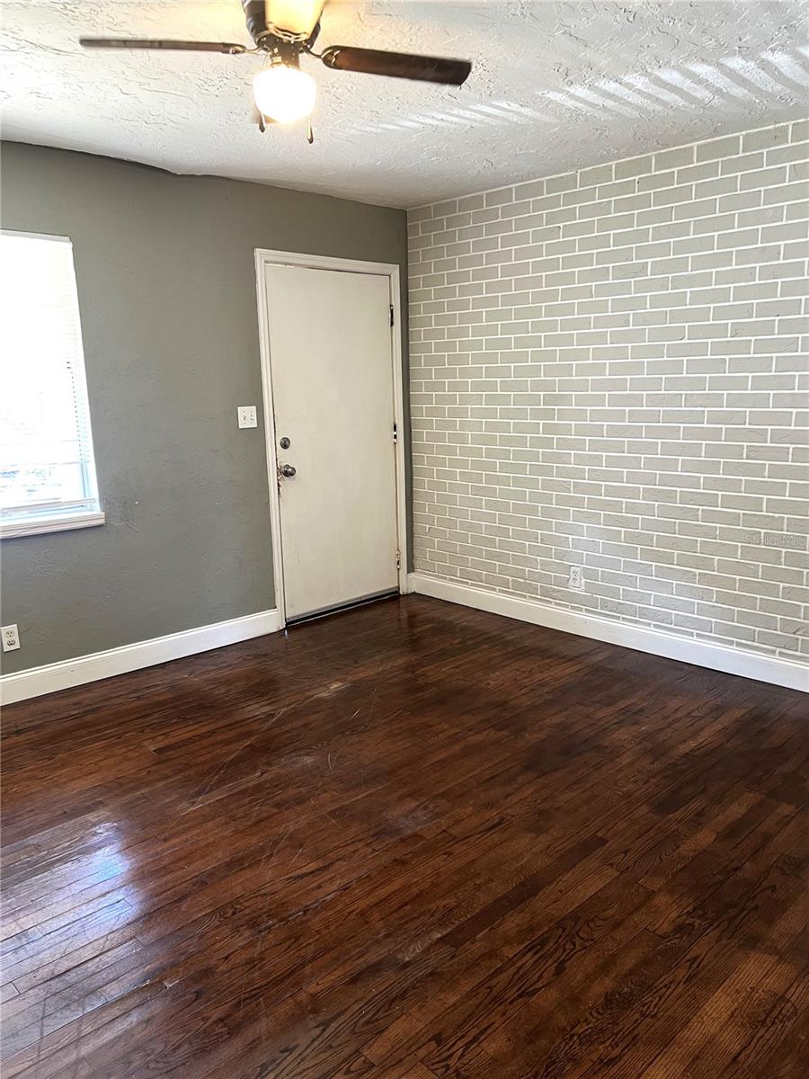 Tijolo, revestimento de cimento, moldura de madeira
