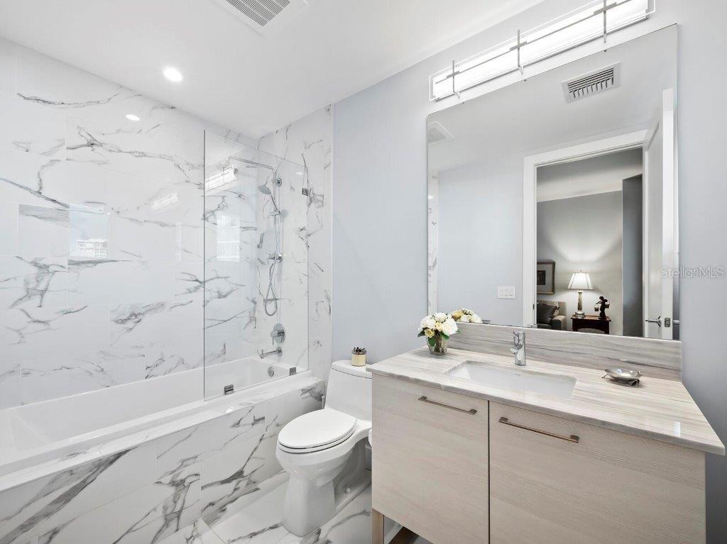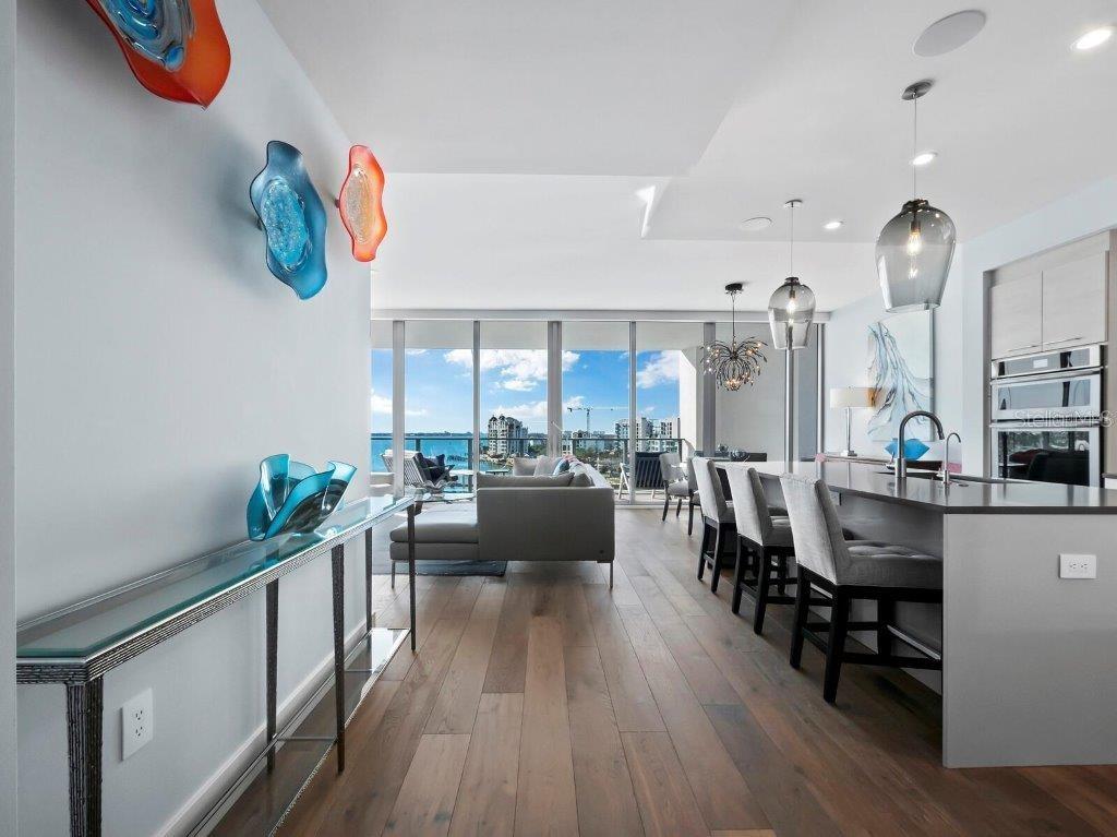 Uma residência de designer fabulosamente decorada em um edifício cobiçado e rico em comodidades, o VUE 703 oferece o auge da vida luxuosa no coração do centro cosmopolita de Sarasota. Agora disponível em regime turnkey com móveis e acessórios de luxo. Reconhecido por sua excepcional vida em estilo resort e estilo contemporâneo elegante, o VUE é um edifício alto incrível com comodidades invejavelmente selecionadas que se estendem desde o serviço de manobrista e concierge até luxuosos salões e instalações para residentes, tudo a poucos passos da cena cultural de classe mundial de Sarasota e do próspero centro de lojas, restaurantes e galerias. Esta residência elevada com acesso por elevador privado é um retiro espaçoso que combina o estilo moderno e elegante do edifício com elementos de design requintados que proporcionam calor e aumentam o conforto luxuoso. As atualizações premium incluem elegantes pisos de madeira de tábuas largas, iluminação e decoração de designer - ambos da Creston; sistema de áudio e vídeo integrado de última geração, filtragem de água da Aqua, enquanto tetos altos de 10 pés acentuam vistas absolutamente deslumbrantes da água. Da porta da frente, as linhas desobstruídas do local exibem vistas espetaculares do sudoeste da Baía de Sarasota e das chaves para o Golfo do México. Cuidadosamente projetada para maximizar as vistas, a casa apresenta um layout aberto e arejado, com uma parede completa de portas deslizantes de vidro de impacto do chão ao teto que estendem o espaço central para um terraço privado profundo com grades de vidro. Com vista para os espaços de jantar e de estar central, a cozinha gourmet com belos armários italianos e eletrodomésticos de aço inoxidável envolve uma grande ilha revestida de quartzo com abundante espaço de preparação e armazenamento, bem como assentos adicionais para os hóspedes. A sala de estar e a área de jantar em plano aberto são perfeitas para entretenimento, fluindo perfeitamente para um terraço privado que se estende por quase 300 pés quadrados com sombra protetora e vistas perfeitas da orla marítima e da marina. A suíte dos proprietários desfruta de sua própria parede de janelas do chão ao teto para vistas espetaculares da água e do pôr do sol, com um banheiro em estilo resort que possui pia dupla extra longa, armazenamento invejável, box amplo com box de vidro e vaso sanitário separado. Dois closets separados aumentam o luxo dos proprietários. Perto da entrada da casa, um segundo quarto espaçoso oferece conforto em suíte e amplo espaço no armário, e um escritório separado acomoda um escritório privativo ou sala de mídia. O lavabo adicional é luxuosamente equipado com elementos de design sofisticado, incluindo arandelas de cristal e uma pia esculpida em ônix. Uma generosa despensa separada com lavadora e secadora aumenta as conveniências excepcionais da casa. A residência vem com escritura, espaço de armazenamento seguro e duas vagas de estacionamento atribuídas, fechadas e fechadas. Idealmente localizado em frente à célebre orla marítima de Sarasota e a poucos passos do núcleo cosmopolita do centro da cidade, o VUE é um endereço muito procurado com uma variedade deslumbrante de comodidades premium, incluindo piscina aquecida e spa com um espetacular deck de piscina que abrange várias áreas de lounge, fogueira e enorme pérgula com churrasqueira gourmet. As comodidades adicionais incluem academia, área recreativa exclusiva para animais de estimação, concierge e segurança. Oferecido pelos proprietários originais, meticulosamente mantido e atualizado, o VUE 703 é uma oportunidade valiosa para desfrutar de um estilo de vida de máximo conforto e estilo.