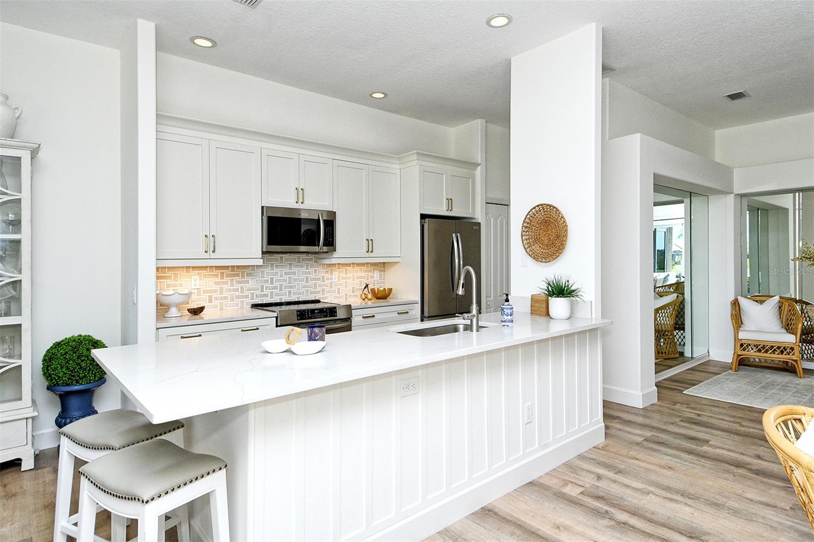 Este é o imóvel que você procurava! Esta excelente villa emparelhada modelo "Dover" completamente atualizada no Heritage Oaks Golf & Country Club possui 2 quartos, 2 banheiros completos, um escritório/escritório, uma garagem anexa para 2 carros e está sendo vendida mobiliada chave na mão. O proprietário não poupou despesas para atualizar esta linda casa para o que é hoje. As atualizações concluídas recentemente incluem: todas as novas janelas e portas de impacto de furacão, lindo piso de pranchas de vinil de luxo em carvalho claro e rodapés altos por toda parte, uma cozinha completamente atualizada com novos armários, bancadas de quartzo, backsplash de azulejos e eletrodomésticos de aço inoxidável. Além disso, foi instalado um novo A/C (2025), juntamente com um novo esquentador (2025), casas de banho lindamente atualizadas com novas bancadas, espelhos e pisos decorativos, e o interior foi recentemente completamente repintado. Assim que você passa pela porta da frente, você é recebido por uma tonelada de luz natural, fazendo com que esta maravilhosa casa pareça iluminada e aberta. Toda a casa foi equipada profissionalmente com móveis de design e detalhes que certamente agradarão até mesmo a pessoa mais exigente. A suíte principal é um oásis verdadeiramente relaxante. Com espaço mais do que suficiente e acesso direto à varanda traseira, este espaço também inclui um banheiro atualizado completo com pias duplas, uma grande banheira de imersão, chuveiro grande e um grande closet. A cozinha aberta oferece linhas de visão abertas para a sala de estar e espaços ao ar livre, tornando o entretenimento de amigos e familiares fácil e agradável. Vá até a ampla varanda traseira privativa e aprecie as vistas panorâmicas da água e do 7º buraco do campo de golfe. A gaiola da varanda e o gabinete da tela foram recentemente atualizados e substituídos para atender ao código de furacão mais recente. Esta casa imaculada foi cuidadosamente cuidada pelo seu proprietário e isso fica evidente! Basta trazer suas roupas e aproveitar tudo em Heritage Oaks no primeiro dia! Heritage Oaks é conhecido por seu campo de golfe imaculado de 18 buracos, quadras de tênis har-tru, academia, segurança 24 horas, um impressionante clube recentemente reformado com 2 restaurantes, incluindo o sensacional 19th Hole Lounge, 5 piscinas aquecidas e um calendário de eventos repleto de atividades. Agende hoje mesmo seu tour privado, não vai durar muito!