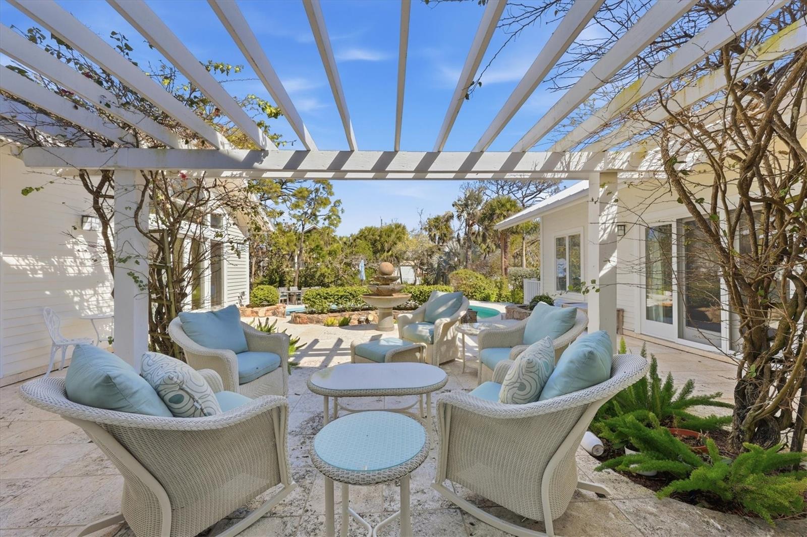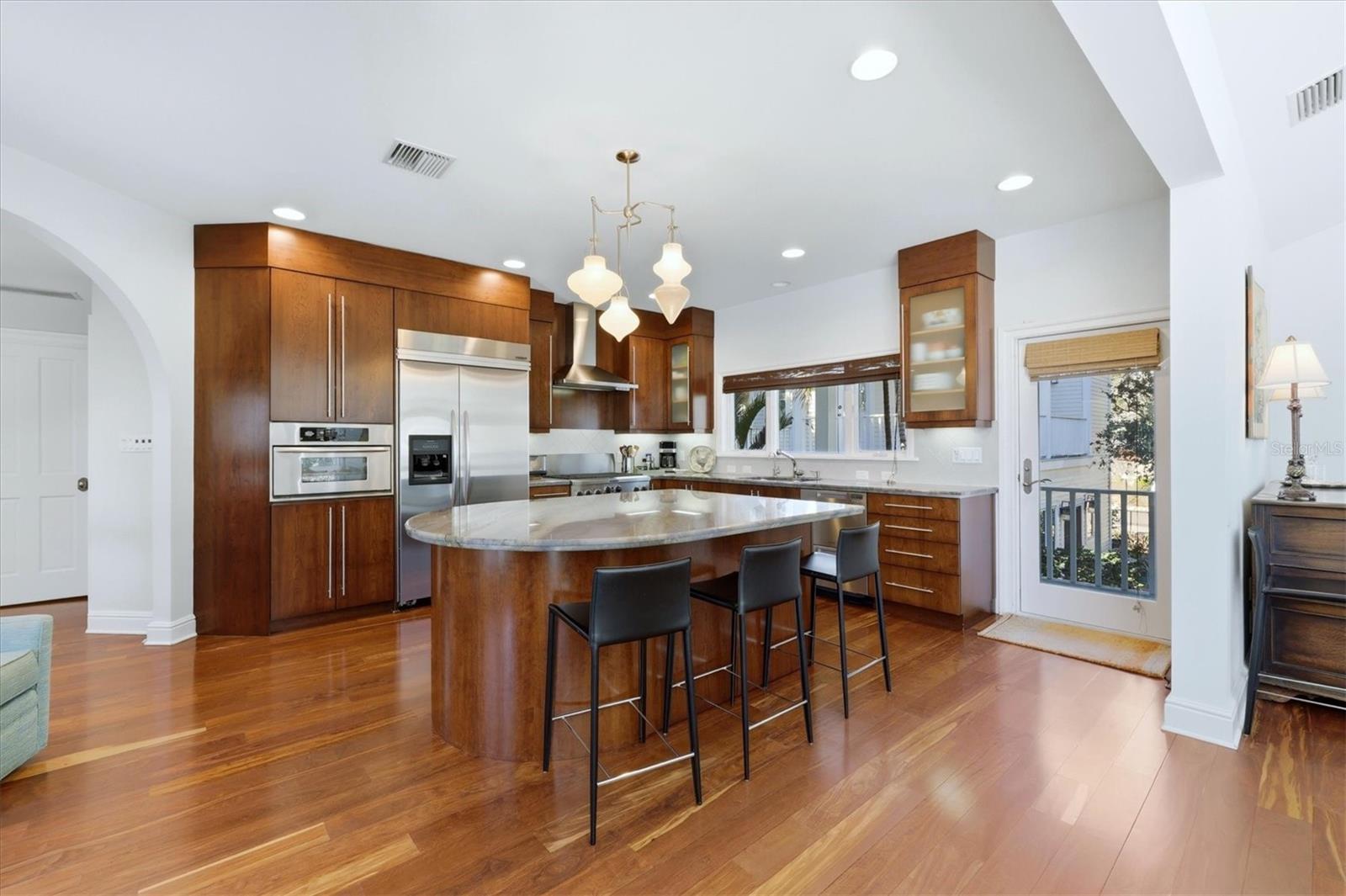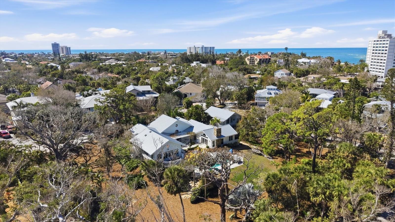 rivalize com Siesta Key Tropical Estate. Imagine-se vivendo e recebendo amigos e familiares em sua casa no estilo Key West, rodeada por uma piscina de água salgada cintilante com uma residência de hóspedes e um apartamento estúdio - tudo situado em uma exuberante paisagem nativa na mundialmente famosa ilha barreira de Siesta Key. A casa principal recebe você com um grande alpendre coberto e portas duplas de madeira. Entre em uma enorme sala de estar abobadada e ensolarada com piso de jacarandá caribenho, com vista através de portas francesas para o terraço, um deck de piscina aberto e um terreno arborizado. Nos cantos da sala estão três grandes quartos privativos com banheiro privativo. A arejada suíte do proprietário dispõe de uma biblioteca particular - um local aconchegante para desfrutar do deck privativo, da piscina e da vista além. A cozinha está bem equipada com eletrodomésticos KitchenAid em aço inoxidável, armários em cerejeira e uma ilha de quartzo Blue Macauba, complementados por toques de designer. A cozinha abre para o terraço e para uma espaçosa sala de jantar e familiar com lareira. Uma grande suíte de hóspedes/quarto bônus (27x22) com banheiro completo está localizada acima da garagem para 2 carros. Escondido sob os carvalhos há um pátio de pedra que leva a um estúdio com banheiro completo. Jardins e canteiros elevados estão prontos para você cultivar seus alimentos e flores favoritos. Um poço privado fornece irrigação. O terreno tem muito espaço para correr e brincar ao ar livre e pode facilmente acomodar a expansão do edifício ou comodidades adicionais.