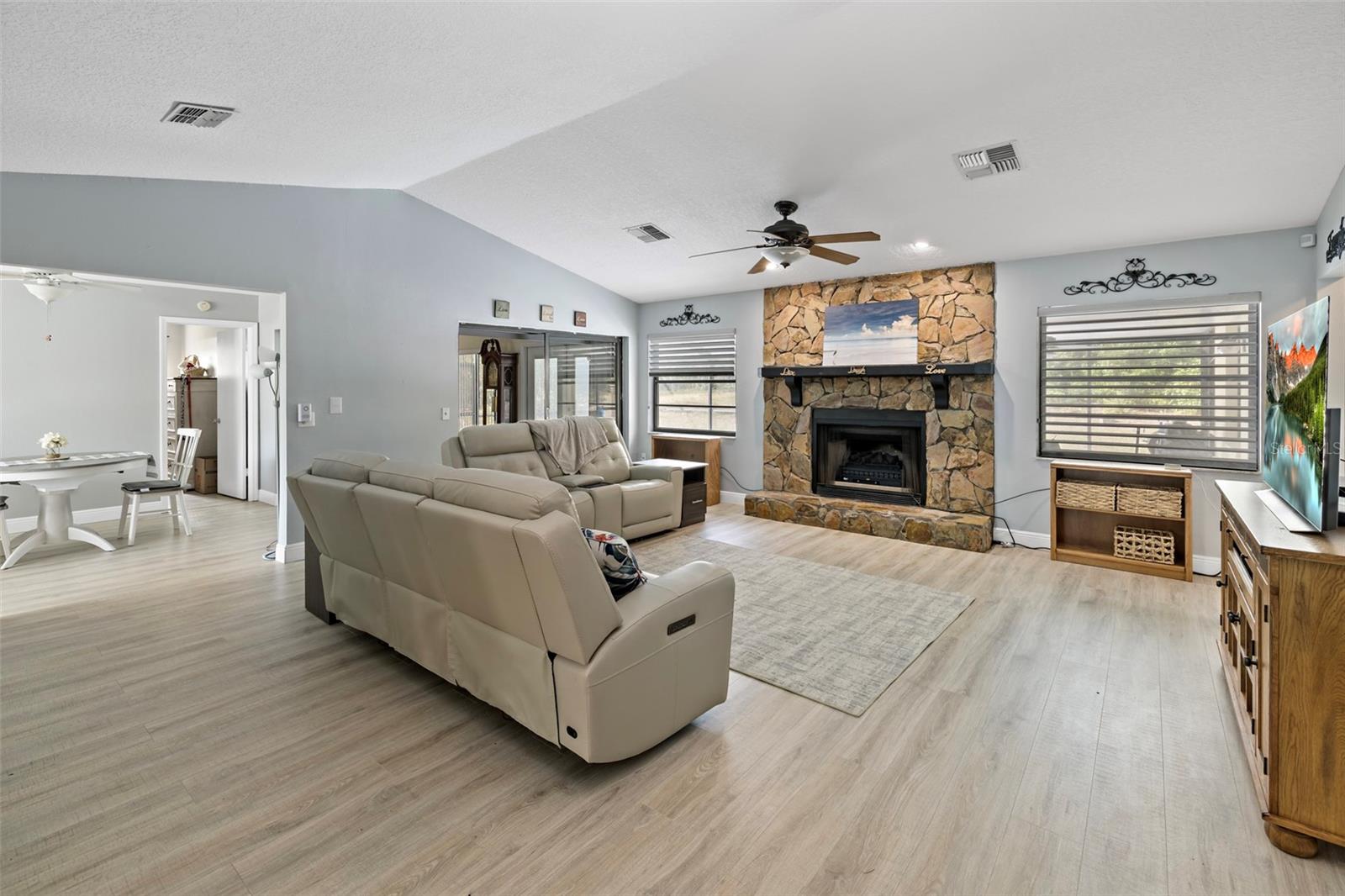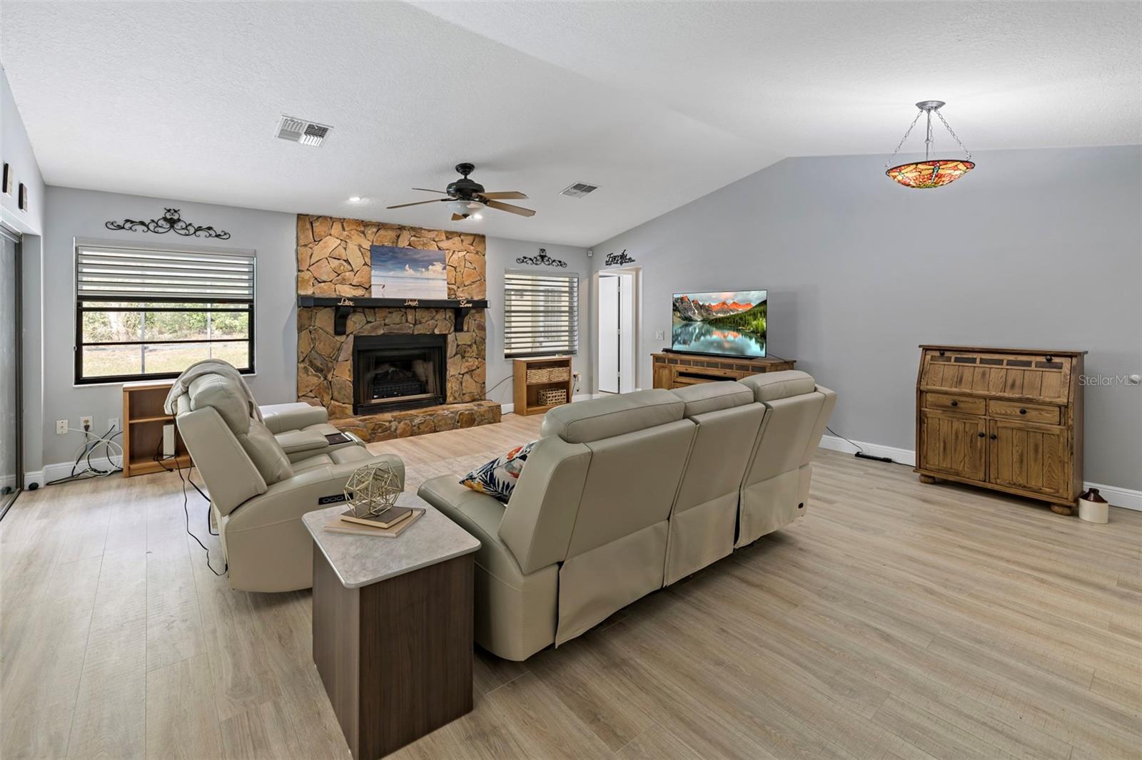 CASA COM PISCINA PRONTA PARA MUDAR! Lindamente conservada 3 quartos, 2 banheiros, garagem para 2 carros, casa com PISCINA, com POTENCIAL 4º QUARTO!! Elegância e funcionalidade incomparáveis com armários personalizados de alta qualidade e armazenamento por toda parte, incluindo uma ampla despensa com prateleiras removíveis! NOVA bomba de piscina, filtro e deck de piscina recém-pintado. 2022 TELHADO E PAINÉIS SOLARES PAGOS!! 2019 AC. Repleto de muita luz natural e uma paleta neutra e purificadora; este é o santuário dos seus sonhos situado em um terreno elevado em uma localização fantástica! NENHUMA INUNDAÇÃO NUNCA. Ao entrar na casa pelo pátio fechado, você é recebido com um amplo layout aberto feito para reuniões e piso de pranchas de vinil de luxo livre de manutenção por toda parte. A cozinha tem uma janela panorâmica que permite a entrada de luz natural e vistas elevadas. Ele vem equipado com uma estação de café de canto perfeita para preparar café com leite matinal, um conveniente refrigerador de bebidas, ilha de cozinha com pia e lava-louças, eletrodomésticos de aço inoxidável, lindas bancadas de granito, armários de fechamento suave com layout de design complementar em dois tons e uma despensa com uma infinidade de opções de armazenamento, incluindo gavetas extraíveis! A cozinha é o sonho de qualquer chef, com muito espaço para preparação e armazenamento, fluindo perfeitamente para a sala de jantar para facilitar o serviço e a reunião de amigos ou familiares. A planta dividida permite privacidade adicional para o quarto principal e o banheiro privativo. O quarto principal é equipado com persianas personalizadas que abrem por cima ou por baixo, permitindo a luz e mantendo a privacidade, e o espaço do armário modular personalizado mantém tudo organizado. O banheiro privativo tem pia dupla com penteadeira e box amplo de azulejos. A ampla sala de estar com lareira em pedra natural e inserção eléctrica opcional é perfeitamente enquadrada por grandes janelas e tectos abobadados, perfeita para grandes reuniões. O gabinete personalizado embutido do chão ao teto com mesa oculta e prateleiras de vidro retroiluminadas é perfeito para suas melhores obras de arte ou peças de conversa favoritas. Dois quartos de hóspedes e um banheiro foram cuidadosamente colocados juntos fora da área de estar principal. Com um dos quartos funcionando como espaço de projeto, completo com embutidos personalizados para armazenamento e uma cama embutida, tornando-o o melhor quarto multifuncional para visitantes ou seus empreendimentos criativos. O Quarto Florida serve como um potencial 4º quarto, completo com portas francesas que levam à piscina cintilante e à varanda coberta, oferecendo um oásis perfeito para relaxamento e entretenimento! Há bastante arrumação tanto na garagem como numa despensa interior adicional. A lavanderia interna separada possui prateleiras de armazenamento e pia! Um estacionamento de cascalho ao lado da casa e um plugue de 30 A criam estacionamento extra para um trailer ou trailer! Esta casa teve manutenção regular de todos os sistemas, paisagismo e piscina! Localizado próximo ao Anderson Snow Park, 589 e uma variedade de restaurantes e shopping centers. Há muito o que amar nesta casa, por dentro e por fora! Agende uma exibição hoje!