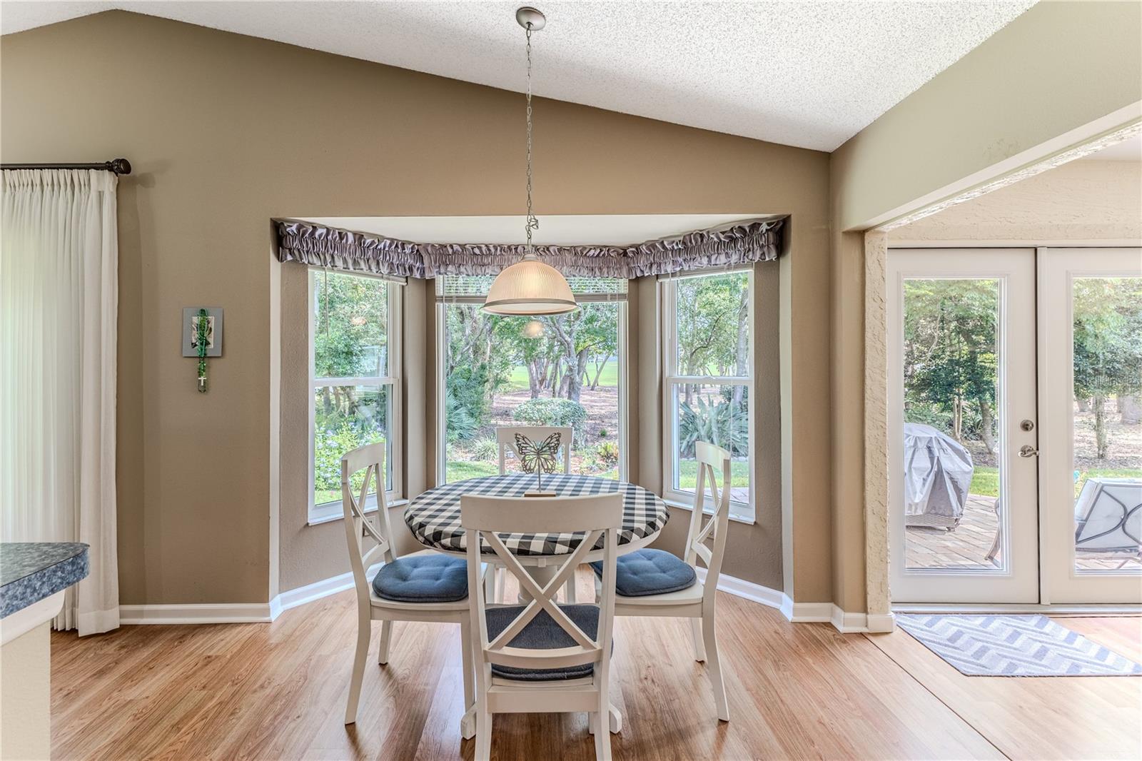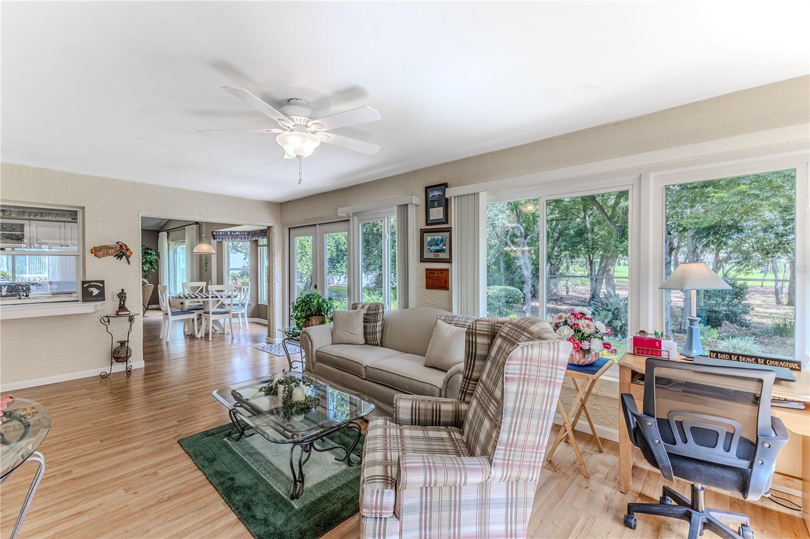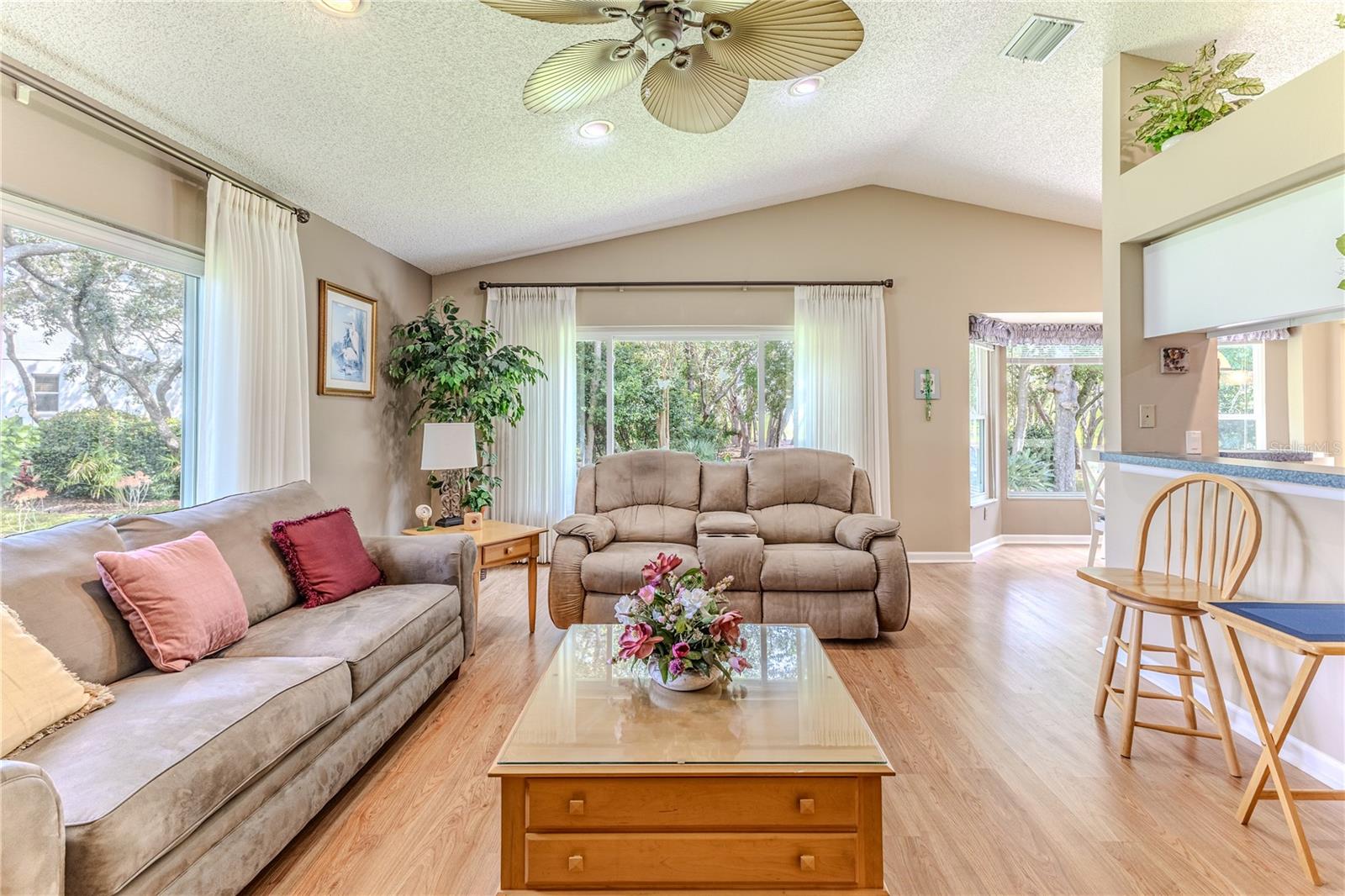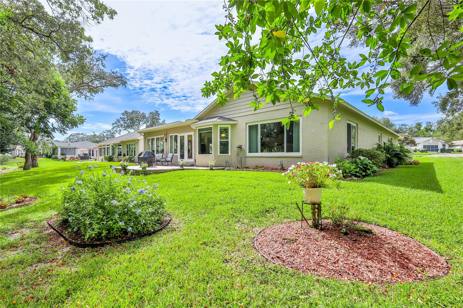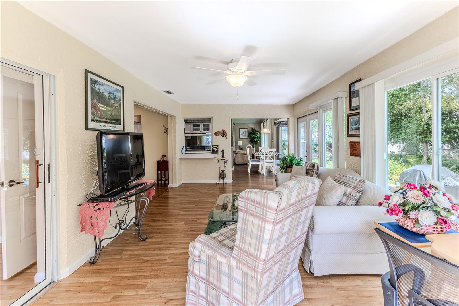 Bem-vindo a esta encantadora casa de 2 quartos e 2 banheiros, com vistas do buraco 5 no campo de golfe Grand Pines, com uma planta baixa desejável e muito espaço de estar. Entre na combinação de sala de estar e de jantar que cria uma entrada calorosa e convidativa. A casa também oferece uma lanai fechada espaçosa, perfeita como sala de família, escritório ou espaço flexível. A suíte primária inclui portas de vidro deslizantes para o Lanai, dois armários e um banheiro na suíte com pias de vaidade dupla, iluminação moderna, chuveiro e ladrilhos atualizados. O quarto de hóspedes também possui um grande closet e está convenientemente localizado perto do banho de hóspedes completo. A cozinha possui tetos abobadados, utensílios de aço inoxidável, armazenamento abundante de armários, dois armários de despensa e uma acolhedora área de jantar de janela de sacada com vista para o jardim e campo de golfe exuberante. A sala da família fora da cozinha facilita o entretenimento. A vida ao ar livre é uma delícia com um pátio de pavimentação com vista para os jardins exuberantes e vistas de campo de golfe. Destaques adicionais incluem uma lavanderia interna com pia, armários e armário de armazenamento, além de uma garagem de 2 carros com bancada e prateleiras. Telhado 2012. Windows 2019. HVAC 2021. Sprinklers no poço. Esta casa combina charme, funcionalidade e um belo cenário - pronto para seus novos proprietários desfrutarem!