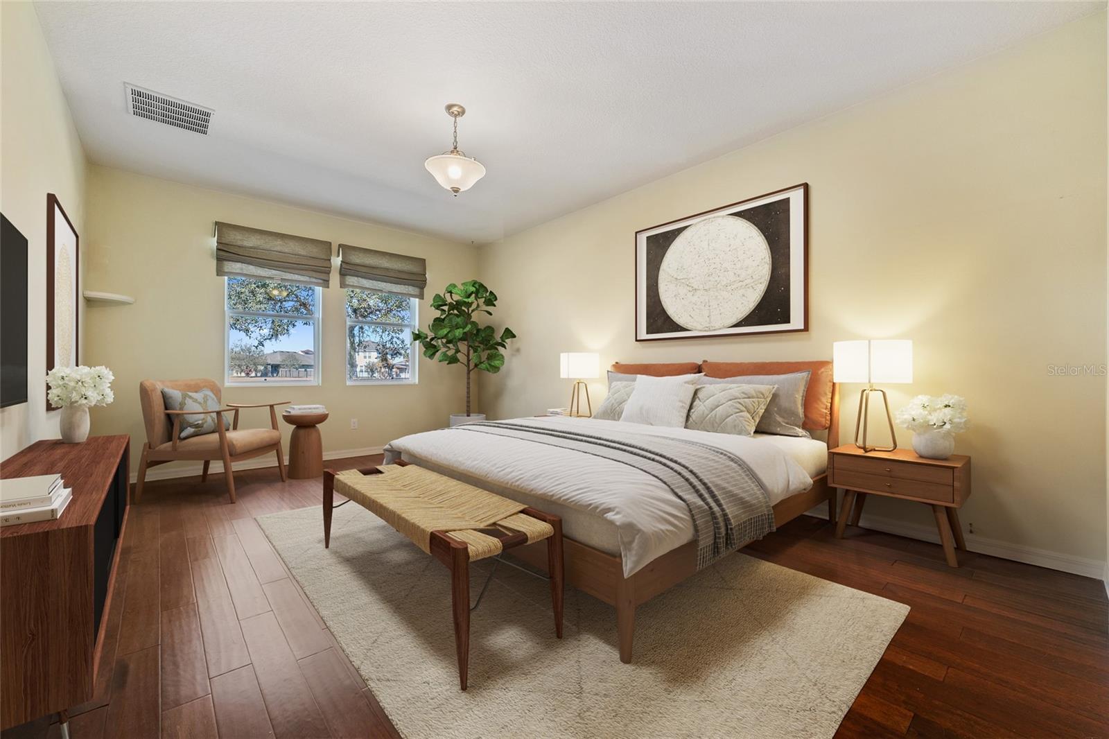 Uma ou mais fotos foram virtualmente encenadas. Bem-vindo a uma residência serena à beira-mar, onde convergem luz, conforto e vida sem esforço. Esta casa térrea cuidadosamente projetada oferece uma planta desejável de quartos divididos, refinada por piso de madeira nas principais áreas de estar e retiros com carpete macio além. A grande sala, cozinha e área de jantar de conceito aberto criam um ambiente perfeito para reuniões íntimas e elegância do dia a dia. Tetos altos e janelas amplas convidam a entrada de luz natural, realçando o ambiente claro e arejado da casa. Além dos interiores, vistas tranquilas do lago se desenrolam a partir de sua varanda privativa com tela. Um quintal cercado de ferro forjado emoldura vistas pacíficas da água, um cenário ideal para manhãs tranquilas e reflexões da hora dourada. Situado em um condomínio bem cuidado que oferece piscina, parques, playground, calçadas e ruas iluminadas à noite, o estilo de vida é tão convidativo quanto a própria casa. Idealmente posicionado com acesso conveniente à Florida Turnpike e ao alcance dos destinos mundialmente famosos de Orlando. O lugar perfeito para plantar raízes e construir o que vem a seguir.