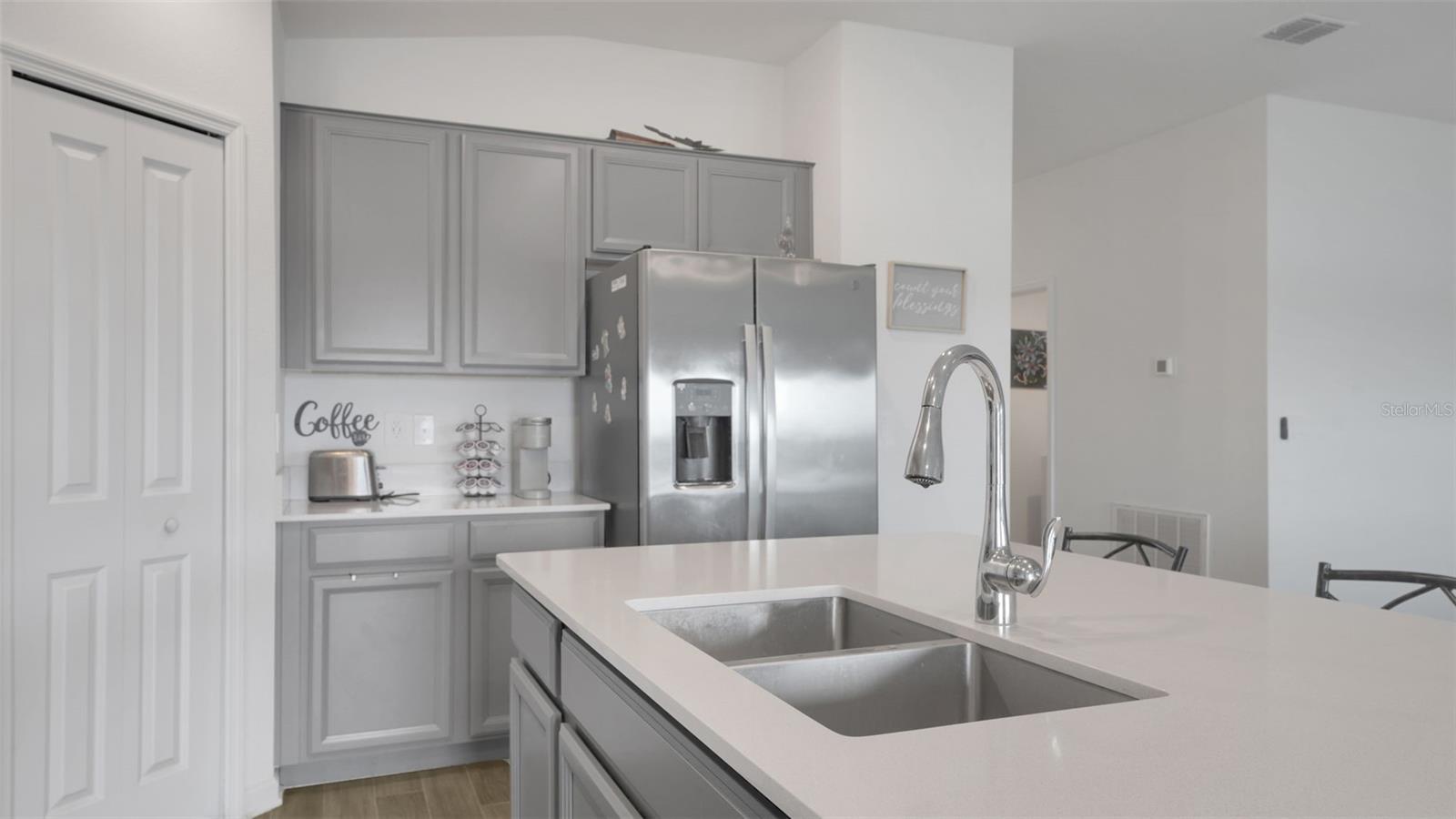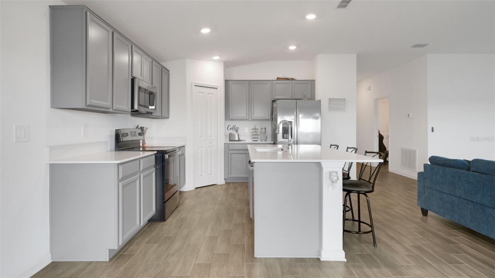 Não perca esta oportunidade fantástica de possuir uma casa nova na antiga comunidade de Hickory de St. Cloud. Esta linda casa possui quatro quartos, dois banheiros e quase 2.000 pés quadrados de espaço de estar. Interior features include 9’-4” ceilings, ample lighting, ceramic tile flooring from the front door and throughout the common areas and carpet in the bedrooms. The modern kitchen boasts stainless-steel appliances, a corner pantry, and a large island with bar top seating. The adjacent living room and dining room make this area great for relaxing or entertaining. The master suite offers a great view of the pond, and the master bathroom features dual vanities, a Chuveiro e um grande closet.