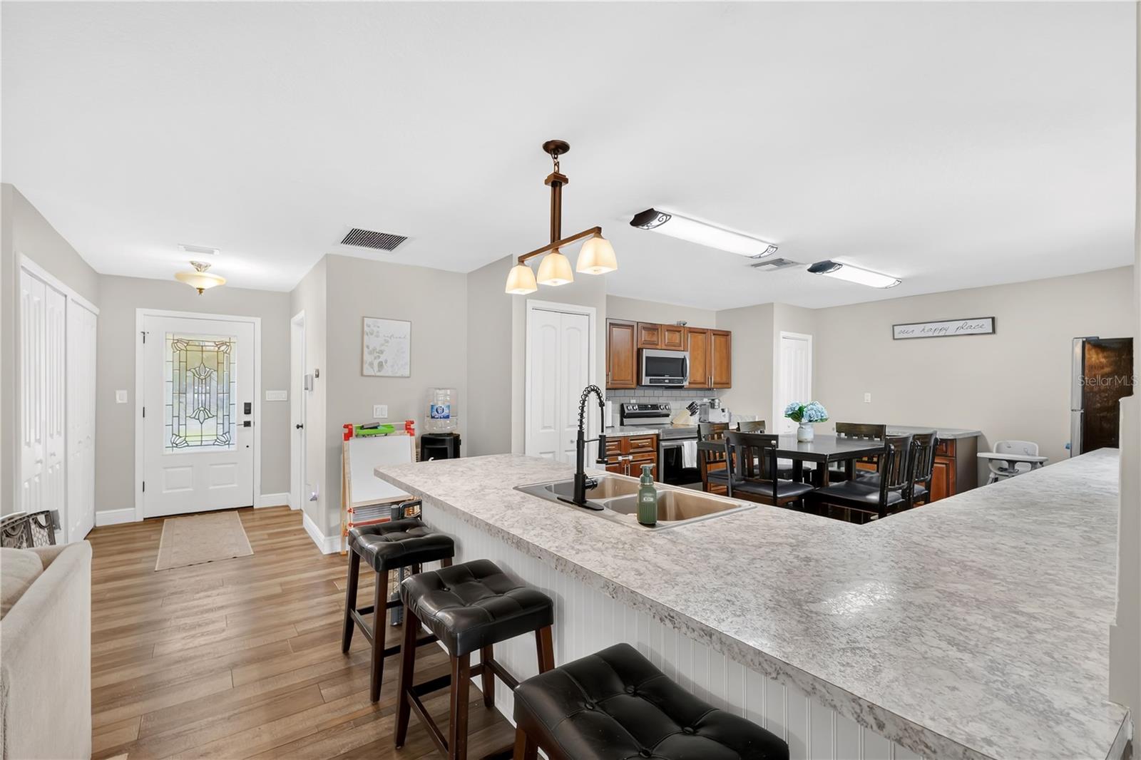Bem-vindo ao seu pedaço privado de vida no campo em Bay Lake Ranch - onde espaço, conforto e liberdade se reúnem em 3,72 acres sem HOA. Esta casa de 3 quartos e 2 banheiros, lindamente conservada, oferece o equilíbrio perfeito entre um ambiente tranquilo e conveniência diária. Ao chegar, você é recebido por uma longa entrada de automóveis, proporcionando amplo estacionamento para residentes e hóspedes, ao mesmo tempo que dá o tom para a privacidade que esta propriedade oferece. O exterior moderno da casa é complementado por um espaçoso pátio frontal coberto - um local ideal para relaxar e aproveitar o ar livre enquanto fica protegido do sol da Flórida. Entre em um layout cuidadosamente projetado onde a sala de estar, a área de jantar e a cozinha fluem perfeitamente, ao mesmo tempo que oferece espaços definidos para uma vida confortável e divertida. A sala está repleta de luz natural, realçada por portas duplas que abrem diretamente para o deck da piscina, criando uma verdadeira experiência de vida interior-exterior. A cozinha foi projetada para funcionalidade e estilo, com balcão abundante, armários extensos, eletrodomésticos de aço inoxidável, backsplash de azulejos, duas despensas para armazenamento adicional e assentos de bar envolventes - perfeitos para refeições casuais ou para receber convidados com facilidade. No corredor, você encontrará os três quartos, oferecendo privacidade das principais áreas de estar. A ampla suíte principal é um verdadeiro retiro, completa com uma grande janela e uma aconchegante área de estar para maior charme. Ele também possui um banheiro privativo com pia dupla, banheira de imersão no jardim, box amplo de vidro e acesso direto ao quintal - perfeito para entrada conveniente pela piscina. Uma versátil sala bônus conectada à suíte principal oferece infinitas possibilidades, seja usada como home office, sala de jogos ou espaço flexível. Os quartos adicionais são semelhantes em tamanho e layout, cada um oferecendo muita luz natural. Saia para o deck da piscina - um espaço ideal para relaxar ou se divertir. A piscina ampla é perfeita para reuniões, enquanto o pátio coberto com ventilador de teto oferece um local confortável para relaxar o ano todo. Além da tela, você encontrará um enorme quintal com potencial infinito – perfeito para animais de estimação, atividades ao ar livre ou simplesmente para desfrutar de seu espaço privado. Localizada a apenas uma curta distância de carro das principais estradas, lojas e restaurantes, esta propriedade oferece a tranquilidade da vida no campo sem sacrificar a conveniência.