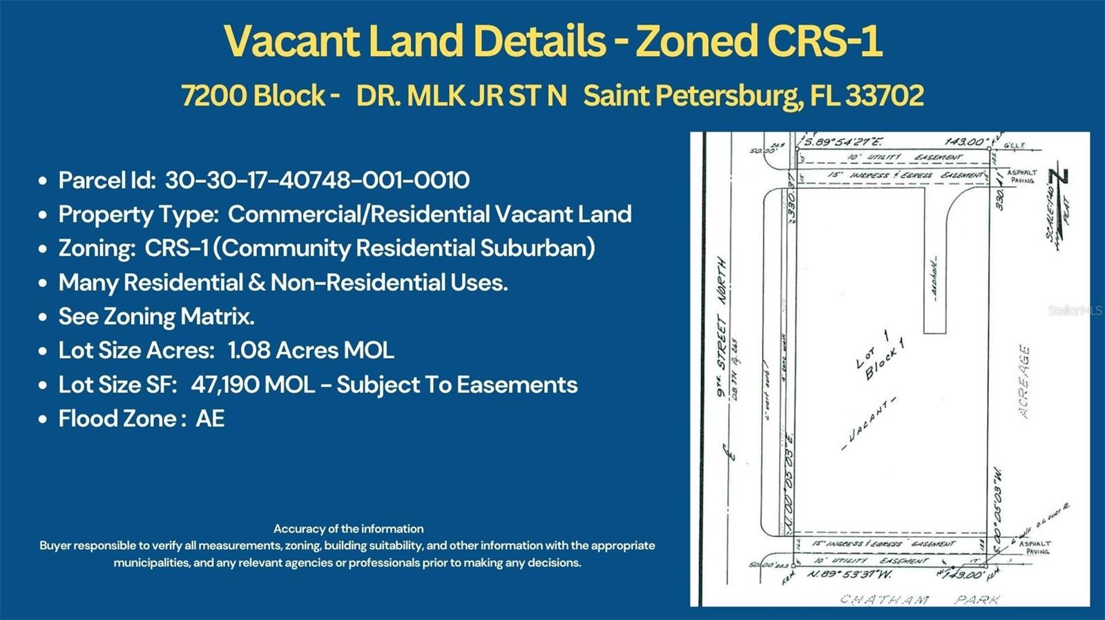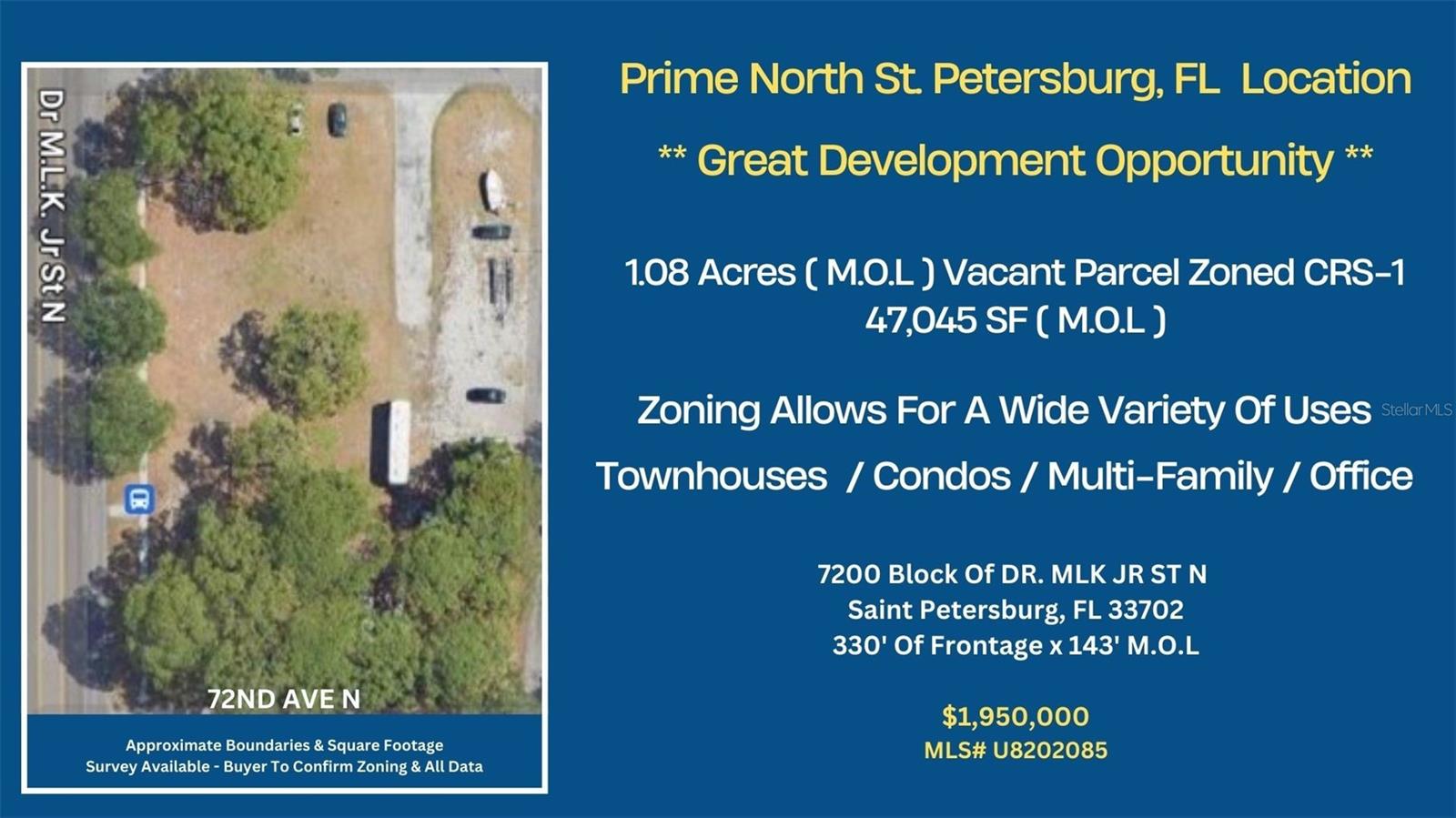 Desenvolvedores de atenção e construtores! Esta é uma rara oportunidade de adquirir um pacote vago de 1,08 zonado CRS-1 no North St. Pete, que permite uma variedade de usos; incluindo multifamiliar (até 15 unidades por acre), escritório e outros usos. A propriedade está localizada em um local altamente desejável, perto da I-275, da Gandy Bridge, Gateway Mall, Downtown St. Pete, Aeroporto Internacional de Tampa e Aeroporto de Clearwater. Os mercados de vendas e aluguel nessa área são fortes, tornando esta uma ótima oportunidade para desenvolvedores/construtores. Ao preço de aprox. US $ 44/SF ou US $ 130.000 por unidade se for capazes de construir 15 unidades multifamiliares. Bônus - O vendedor também possui 3 propriedades adjacentes que são negociáveis na opção Sellers. Um deles é um prédio de escritórios na esquina com a fachada do Dr. MLK JR também zoneou o CRS-1.