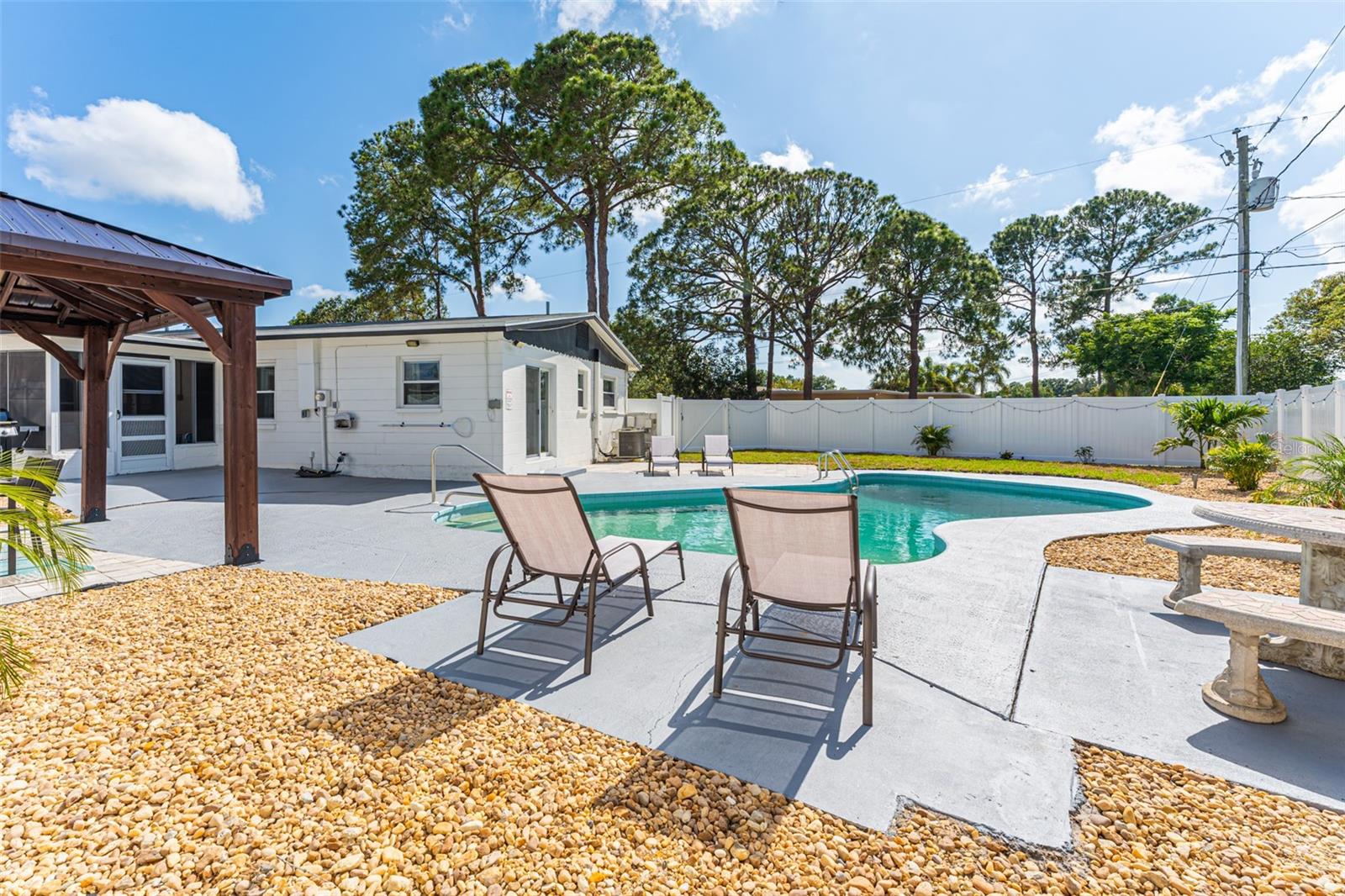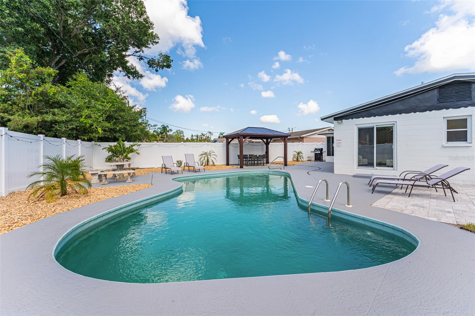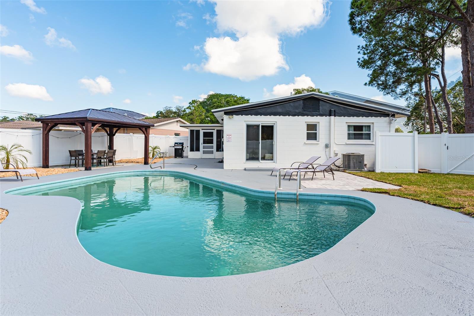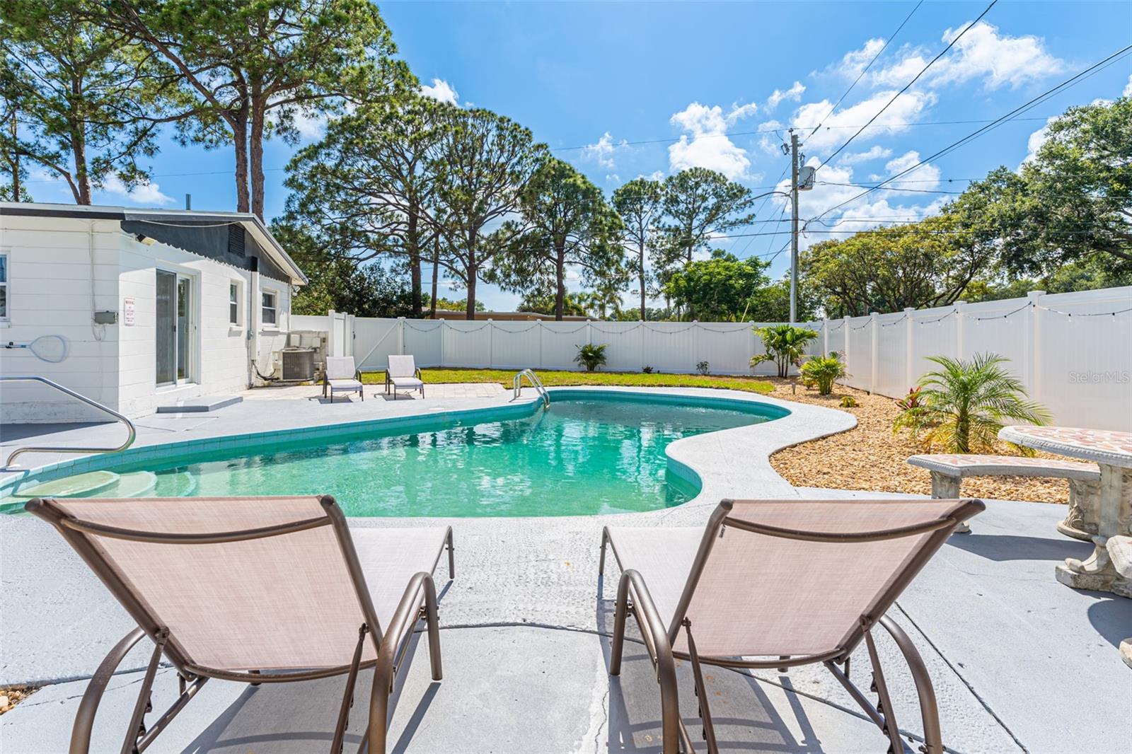 Linda casa de três quartos e dois banheiros com piscina no coração de Saint Pete. Recentemente pintado e atualizado. Pavimento vinílico de luxo na sala de jantar, sala de estar, cozinha e hall. Tapete novo em ambos os quartos. Novo telhado em maio de 2021. HVAC 2020. A cozinha bem iluminada tem um novo fogão e exaustor e bancadas em corian. Grande área de jantar. O quarto principal tem banheiro privativo com box amplo. O segundo quarto é amplo, com escritório e área de estar. A garagem foi lindamente convertida para um terceiro quarto ou escritório. O banheiro do corredor tem uma combinação de banheira/chuveiro. Nova lavadora e secadora empilhável. As janelas atualizadas têm inclinação fácil e limpa. Um oásis de quintal com piscina térrea, pérgula, múltiplas áreas de entretenimento e totalmente vedado incluindo armazém. SEM HOA, SEM INUNDAÇÃO! Ligue para sua exibição privada hoje!
