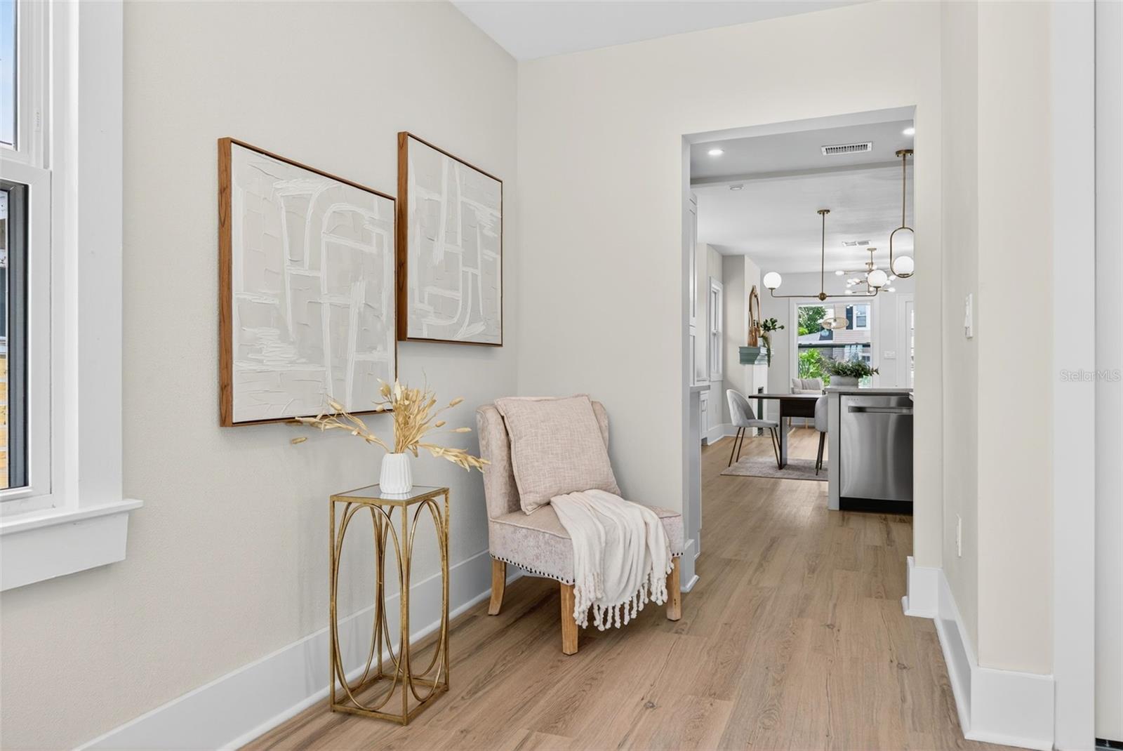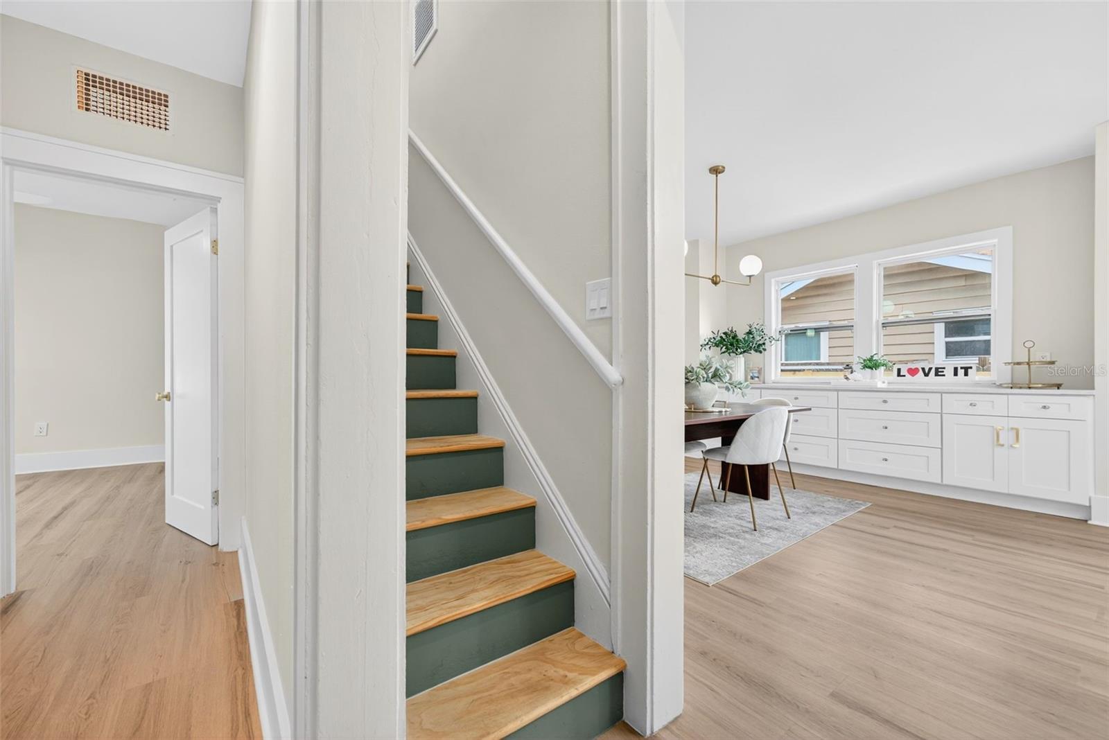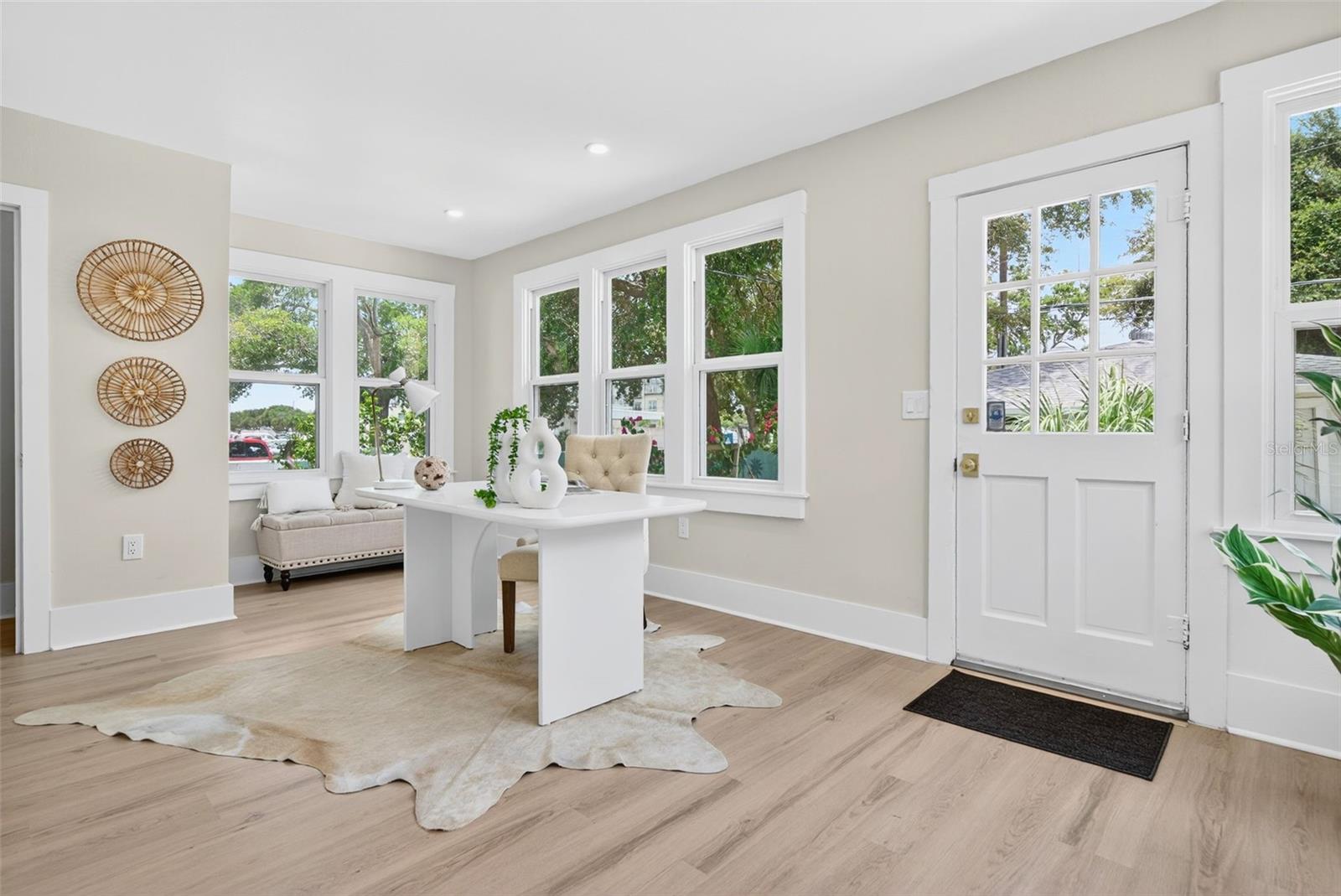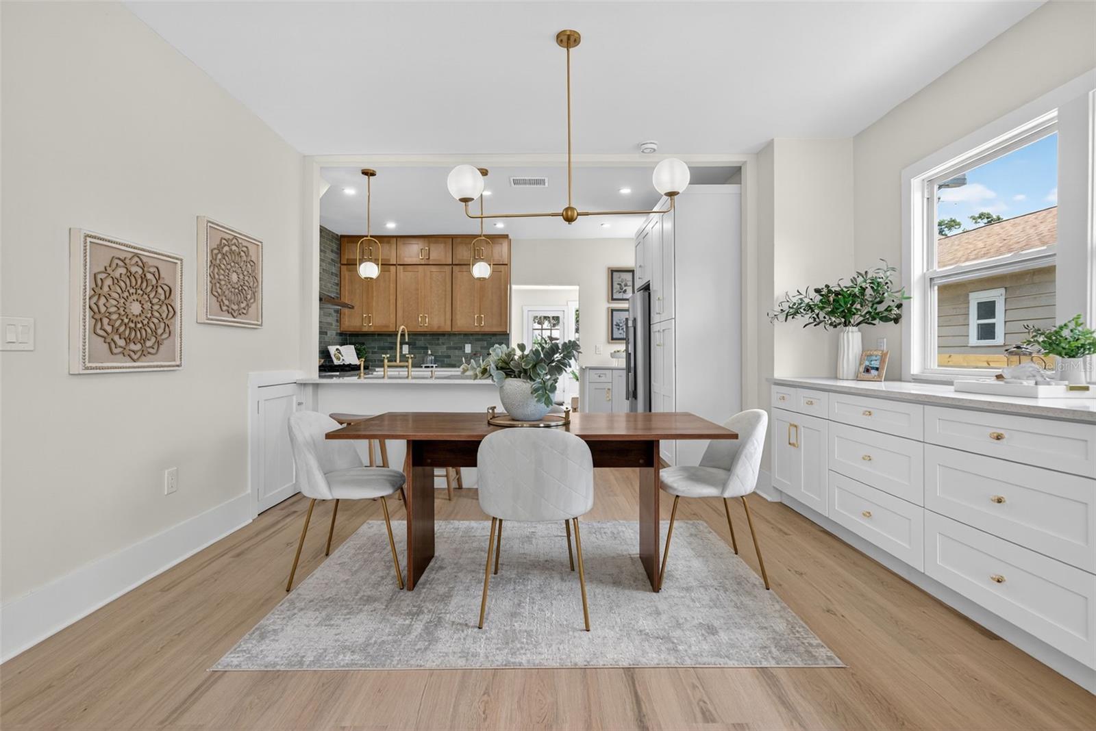 "Classic Meets Modern" - Este histórico Kenwood Bungalow de 1928 foi atualizado para o morador da cidade moderno e o fator "uau" a cada passo. A grande varanda recebe a família e os amigos, além de ser o local perfeito para uma festa da varanda do bairro! Dando um aceno para a planta original, a casa foi projetada para incluir uma cozinha reimaginada, incluindo uma barra de café da manhã conveniente, amplo espaço de balcão e muito armazenamento com acessórios personalizados e uma faixa de gás. Os ladrilhos de metrô de vidros verdes personalizados são um aceno para a década de 1920 com um toque moderno. Ao entrar na casa, a sala é ancorada pela lareira original e cria uma mistura harmoniosa de charme histórico. A sala flui perfeitamente para a sala de jantar e oferece armários personalizados para armazenamento e entretenimento, e mantém intactos o charme e o caráter da casa. O piso principal oferece dois quartos grandes que compartilham um banho de corredor. Na escada original, o principal suíte cria a sensação do seu próprio santuário com um quarto grande, armário duplo e um banheiro que inclui uma grande sala úmida com uma banheira de imersão e uma generosa área de chuveiro. Além da cozinha, há uma conveniente sala de bônus/escritório/sala de estar que inclui um armário de lavanderia e meio banho, que leva ao jardim traseiro e garagem para carro único. O pátio traseiro/jardim tem acesso conveniente para a garagem e o estacionamento. O design de parede personalizado ancora o quintal com "Kenwood" em bordado na parede - digamos que é o melhor de "Modern Meets Historic"; Certamente um aceno para a cidade modernizada de St. Pete e o amor de murais ao redor! Localizado em uma zona não de inundação.