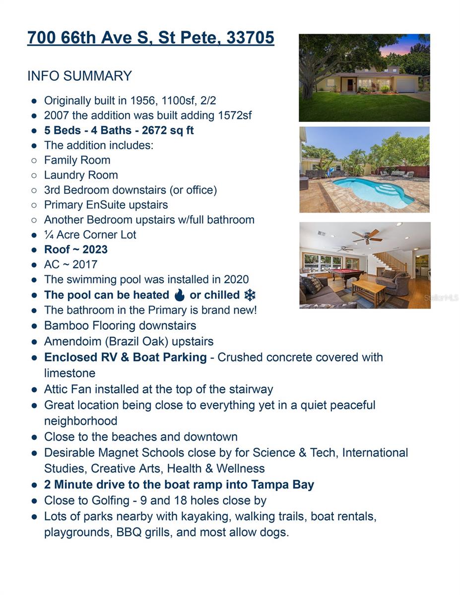 Originalmente construído em 1956, como um aconchegante 1100SF de 2 quartos e 2 banheiros, este lar embarcou em uma transformação notável em 2007. Uma adição significativa floresceu, expandindo o espaço de vida para um generoso 2672 pés quadrados e criando um total de 5 quartos e 4 banheiros. A nova adição introduziu uma espaçosa sala de família, uma lavanderia conveniente e um versátil terceiro quarto no andar de baixo, que poderia facilmente dobrar como um escritório em casa. No andar de cima, uma luxuosa suíte primária foi criada, junto com outro quarto e banheiro completo. Sentado em um lote de canto de 1/4 de tamanho agradável, esta propriedade oferece espaço e uma sensação de privacidade. Atualizações recentes garantem a paz de espírito, com um teto substituído em 2023 e as unidades CA a partir de 2017. Em 2020, uma piscina foi instalada, dando a você o luxo de ser aquecido ou refrigerado para o prazer durante o ano todo. O banheiro principal foi reformado e expandido em 2024, com espaço suficiente para duas pessoas se moverem sem entrar. Entre para descobrir a beleza do piso de bambu no andar de baixo e os ricos tons de Amendoim (Brasil Oak) no andar de cima. As características práticas incluem estacionamento em trailers e barcos fechados, com concreto esmagado coberto por calcário, e um ventilador do sótão instalado na parte superior da escada para liberar o ar velho e trazer uma rajada de ar fresco ao seu comando. Além dos muros de sua nova propriedade, o local oferece o melhor dos dois mundos: um bairro tranquilo e pacífico que ainda está perto de tudo. As praias e o centro da cidade estão de fácil acesso, assim como as escolas de ímãs desejáveis, especializadas em ciências e tecnologia, estudos internacionais, artes criativas e saúde e bem -estar. Para o entusiasta ao ar livre, a menos de 5 minutos de distância estão 2 parques de água com rampas de barcos na Baía de Tampa, com um deles tão perto que é como ter sua própria rampa de barco particular! Há golfe, caiaque, trilhas para caminhada, aluguel de barcos, playgrounds e churrasqueiras para churrasco estão todas nas proximidades. Até seus amigos peludos vão adorar os numerosos parques adequados para cães. Esta não é apenas uma casa; É um estilo de vida, uma mistura de conforto, conveniência e localização, esperando que você escreva seu próximo capítulo.