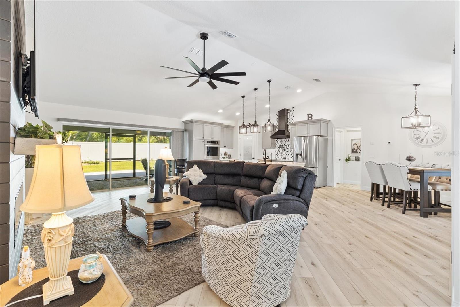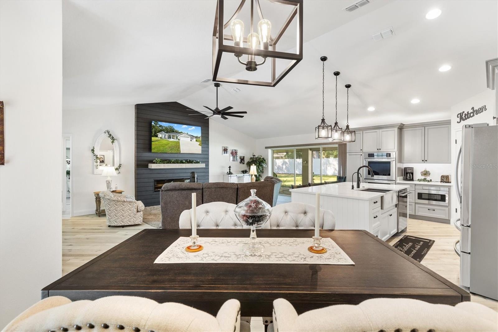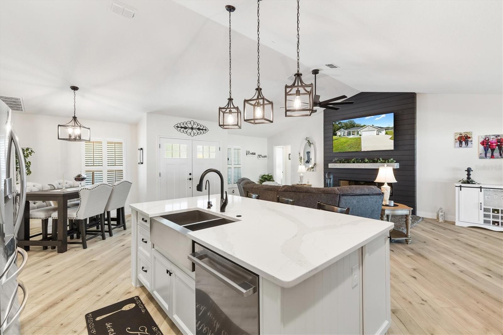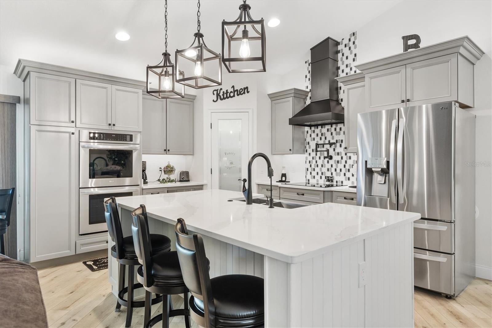 NÃO HOA SEM VÍNCULO! Impressionante casa de designer 3/3 construída sob medida com SALA PARA UMA GRANDE PISCINA. Curta viagem de golfe ou caminhe até The Villages e Mulberry Publix Plaza, onde lojas, restaurantes e instalações médicas o aguardam. Esta planta aberta e dividida apresenta luxuoso piso de prancha de vinil West Oak, uma impressionante parede shiplap com uma lareira elétrica linear de 60 ”na sala de estar e acesso a uma espaçosa varanda equipada para uma banheira de hidromassagem e piso de porcelana com aparência de pedra. Este mesmo andar fica na acolhedora varanda frontal coberta. A cozinha do Chef é completa com balcões de quartzo, fogão de 5 bocas com exaustor ventilado e enchimento de panelas, forno duplo embutido, gaveta de micro-ondas embutida, despensa personalizada e ilha com arrumação e balcão para café da manhã. O quarto principal apresenta um teto elegante com sancas e portas francesas que levam à varanda, complementadas por closets PERSONALIZADOS para ele e para ela. O banheiro privativo possui pia dupla, box de vidro com banco, banheira de imersão no jardim e um conveniente armário de roupa de cama. As portas francesas estão equipadas com persianas embutidas para maior privacidade e comodidade. Os quartos de hóspedes partilham uma casa de banho com chuveiro. O quarto da frente apresenta uma encantadora janela saliente com venezianas e um assento aconchegante na janela. O quarto dos fundos oferece carpete e acesso privativo a um lavabo, que também se conecta à varanda. A propriedade inclui uma espaçosa garagem para dois carros com espaço adicional para um carrinho de golfe e arrecadação no sótão. A lavanderia interna está equipada com armários extras, pia e caixa de controle central WiFi da casa. Os recursos adicionais incluem ventiladores de teto com kits de luz, um sistema de filtragem de água para toda a casa e uma cerca de vinil para privacidade no quintal que pode ser expandida para melhorar a vida ao ar livre. Móveis disponíveis separadamente. Agende hoje mesmo sua consulta para conhecer esta casa excepcional.