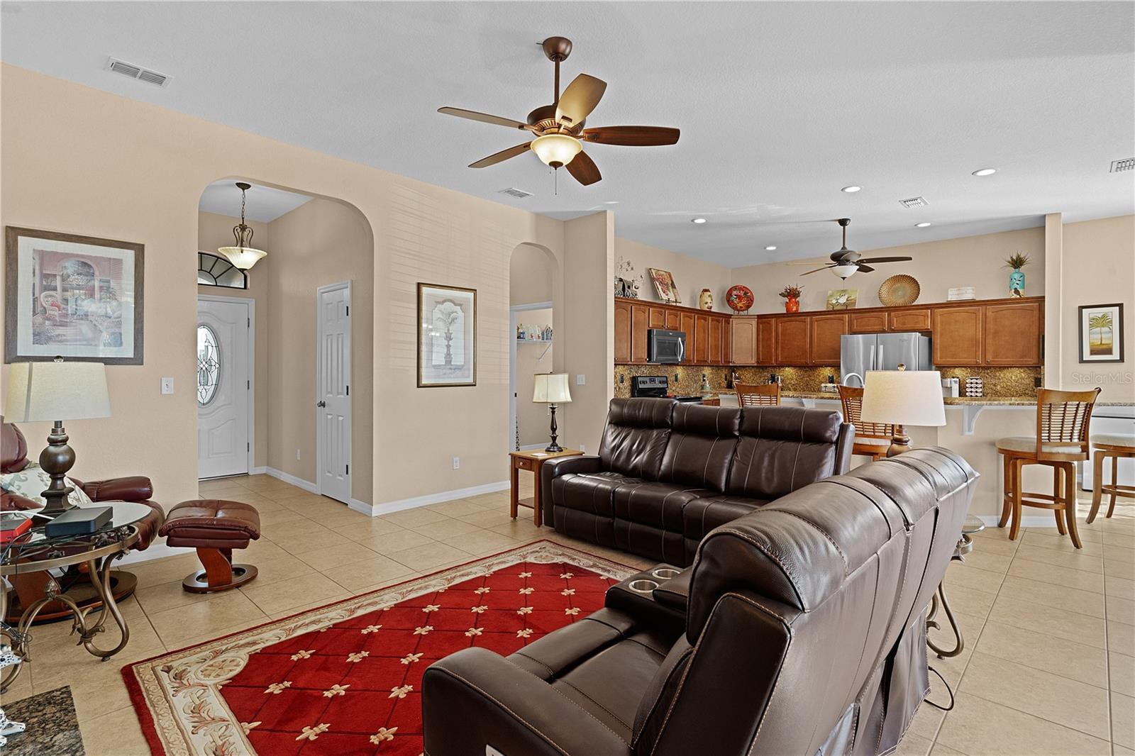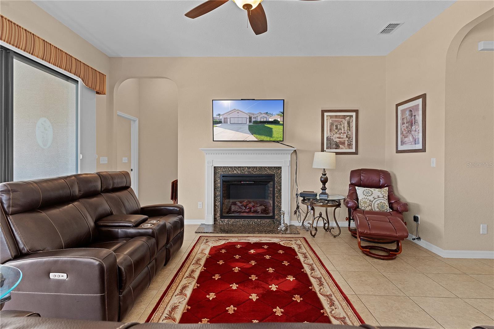 Modelo Magnolia personalizado lindamente conservado no desejável North Valley II de Stonecrest! Construída em 2014, esta casa de 3 quartos e 2 banheiros está situada em um terreno de esquina premium com garagem para 2 carros e carrinho de golfe. A planta aberta apresenta bancadas de granito, eletrodomésticos de aço inoxidável e armários personalizados em uma espaçosa cozinha gourmet. Tetos altos e elegantes embutidos, incluindo uma lareira elétrica, acrescentam calor e personalidade por toda parte. Desfrute de um retiro privado no quintal com uma piscina de fibra de vidro com aquecimento solar sob um grande recinto protegido e uma varanda coberta perfeita para viver ao ar livre. A ampla suíte principal inclui um banheiro estilo spa com pias duplas e box amplo. Acessível para cadeiras de rodas e verdadeiramente pronto para morar. Localizado no condomínio fechado de Stonecrest com mais de 55 anos, a poucos minutos de The Villages, com acesso a quatro piscinas, campo de golfe de 18 buracos, restaurante e mais de 90 clubes. Carrinho de golfe acessível para lojas, restaurantes e cuidados de saúde nas proximidades. Agende seu tour privado hoje mesmo!