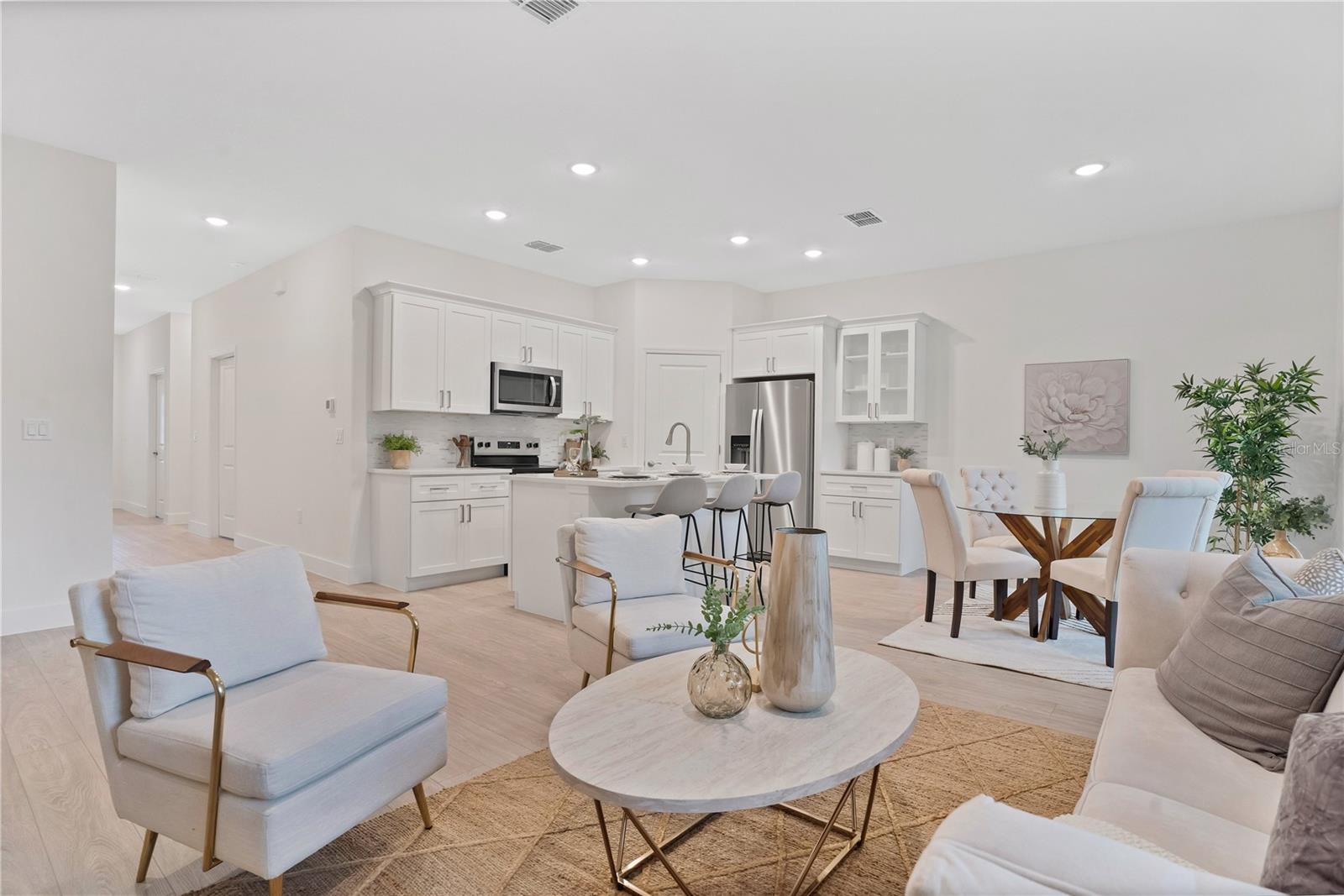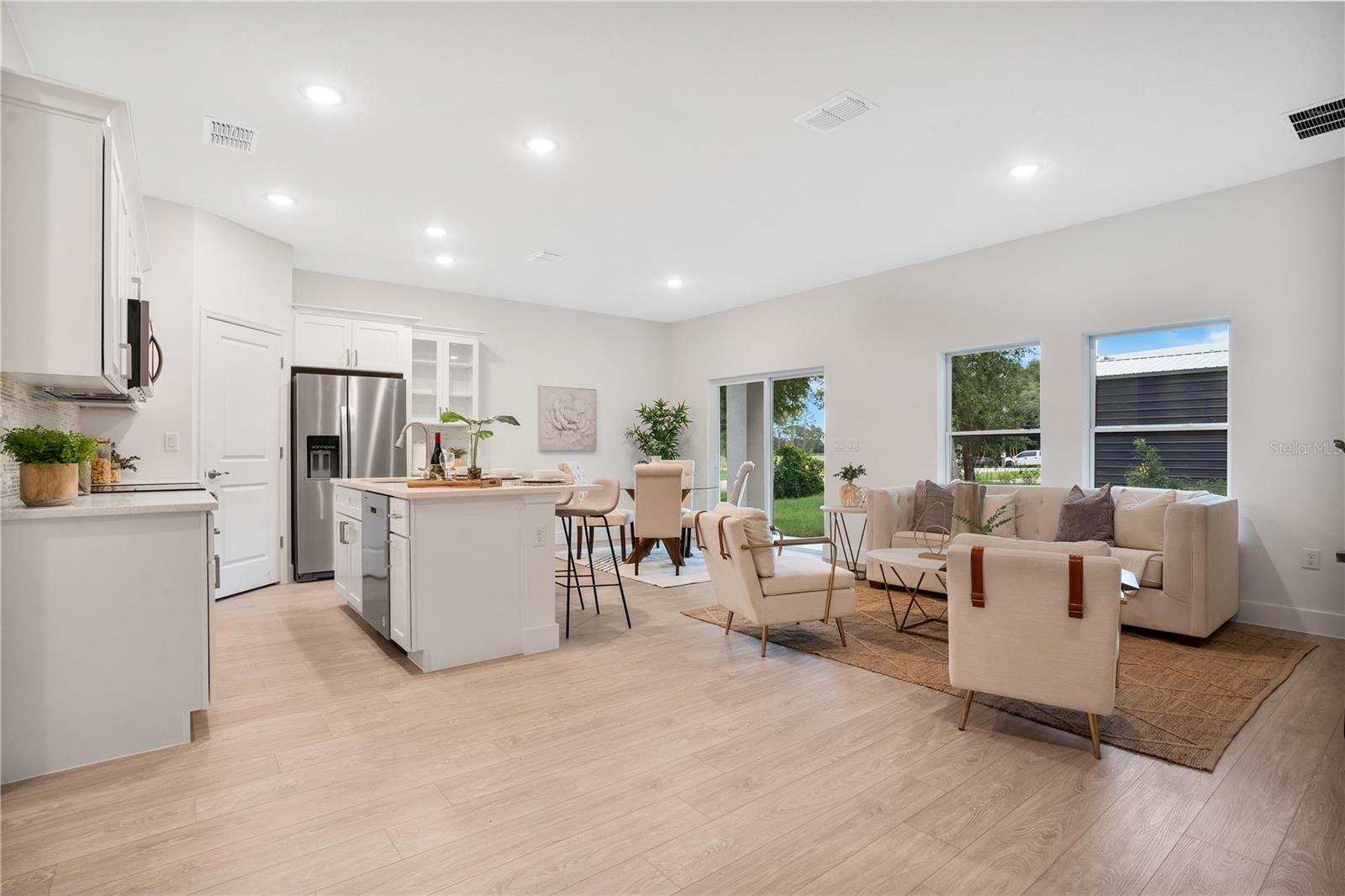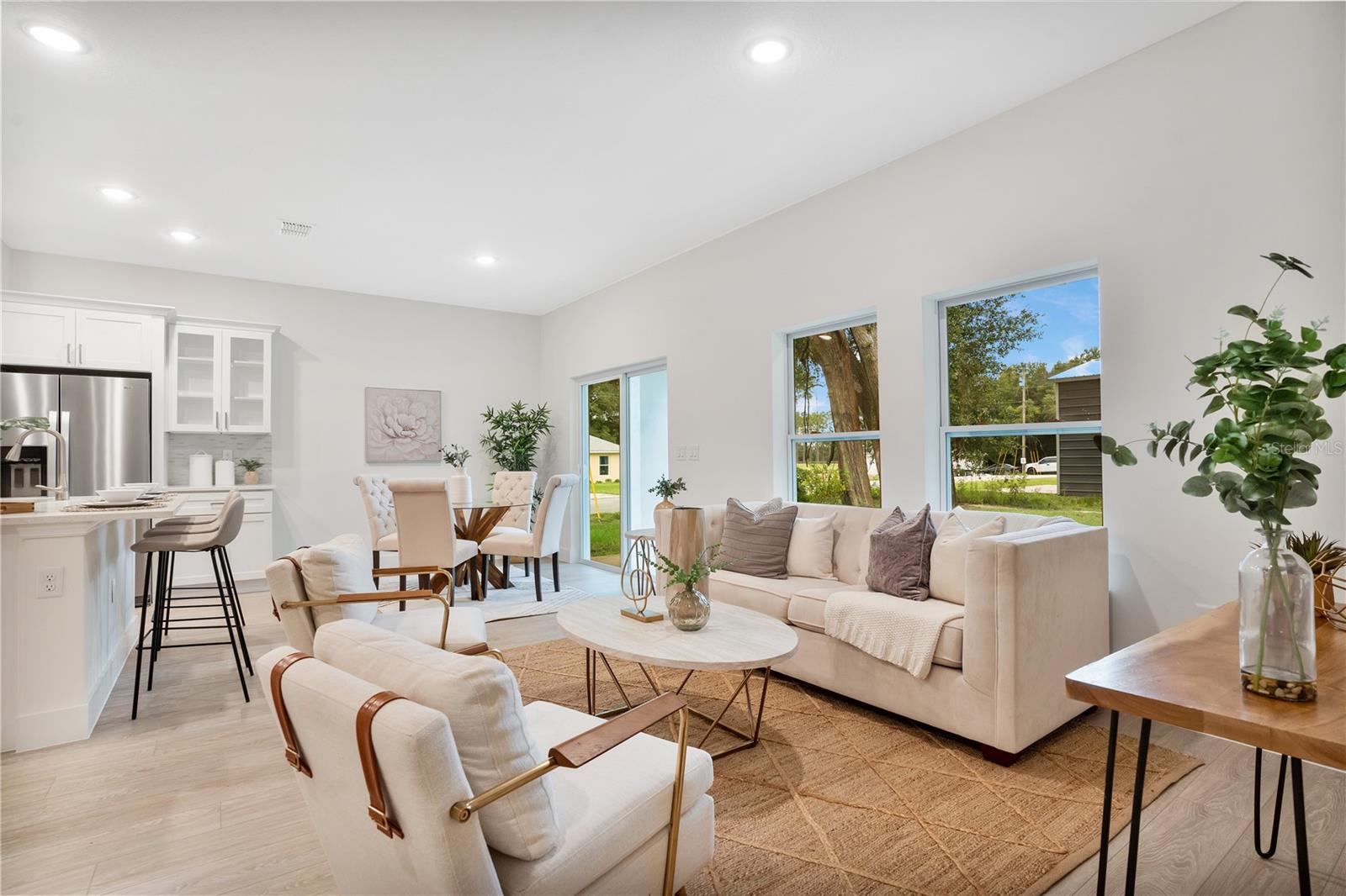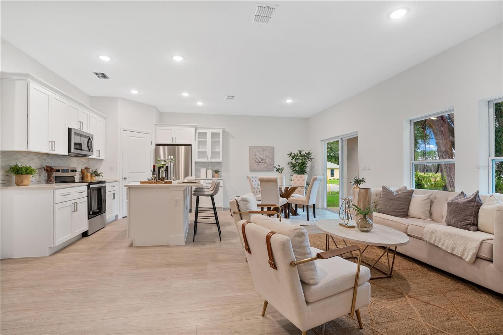Cativante casa recém-construída de 3 quartos e 2 banheiros em um terreno de esquina grande. Apresentando uma planta aberta, a casa está repleta de inúmeras atualizações, incluindo piso de pranchas de vinil de luxo premium de 20 mil, 5 1/4 rodapés e impressionantes Tetos de 10 pés. A cozinha impecável está equipada com eletrodomésticos de aço inoxidável, bancadas de quartzo, backsplash de mosaico com revestimento de vidro e armários shaker de fechamento suave de 42 polegadas. A grande ilha inclui assentos embutidos, perfeitos para refeições casuais. Fluindo perfeitamente da cozinha, as áreas de estar e jantar impecavelmente projetadas possuem grandes janelas e portas de vidro deslizantes, permitindo que a luz natural inunde o espaço, tornando-o ideal para entretenimento ou relaxamento. A planta dividida oferece um equilíbrio perfeito entre espaço e privacidade. O quarto principal, localizado na parte traseira da casa, apresenta acabamentos luxuosos, um lindo banheiro com pias duplas, bancadas de quartzo e um chuveiro deslumbrante adornado com azulejos do chão ao teto. O amplo e impressionante closet oferece não apenas amplo armazenamento, mas também um espaço cuidadosamente organizado para roupas, acessórios e itens pessoais, tornando-o tão funcional quanto espaçoso. Os quartos secundários estão situados na frente da casa, oferecendo espaço adicional e versatilidade. Situada em um bairro altamente desejável e não HOA, a propriedade dispõe de um lote espaçoso, perfeito para estacionamento de trailers ou barcos. Localizada a apenas uma curta viagem de carrinho de golfe dos restaurantes de classe mundial, campos de golfe e opções de entretenimento de The Villages, esta casa combina conveniência com luxo. Com garantia do construtor, eletrodomésticos com baixo consumo de energia, janelas de vidro duplo e isolamento de placa de espuma R-5, esta casa oferece verdadeira tranquilidade e vida sem esforço.