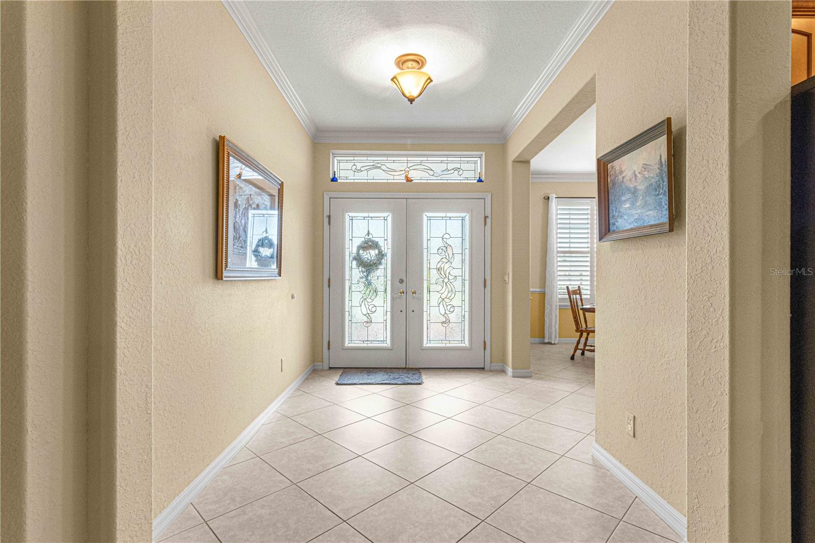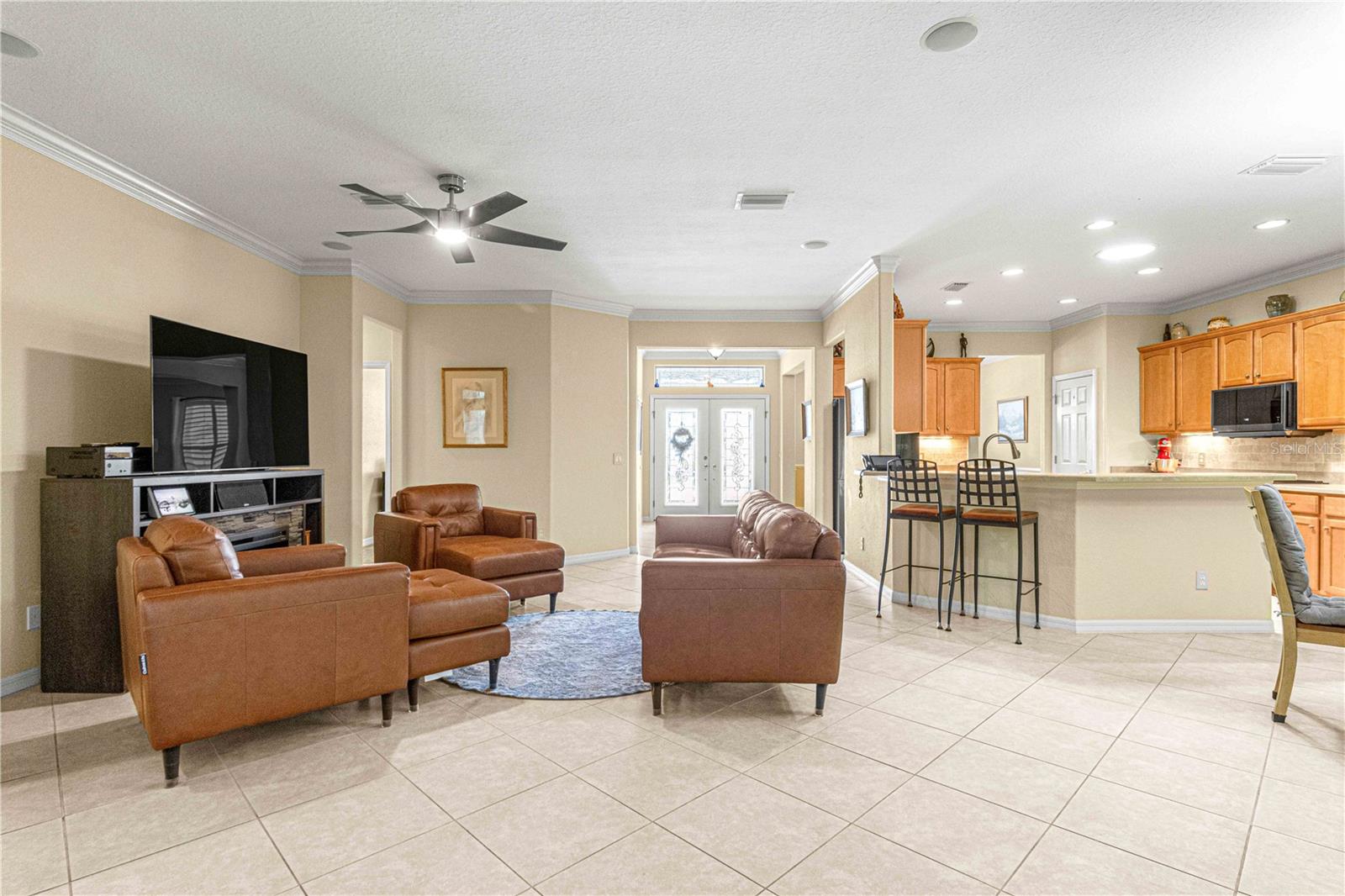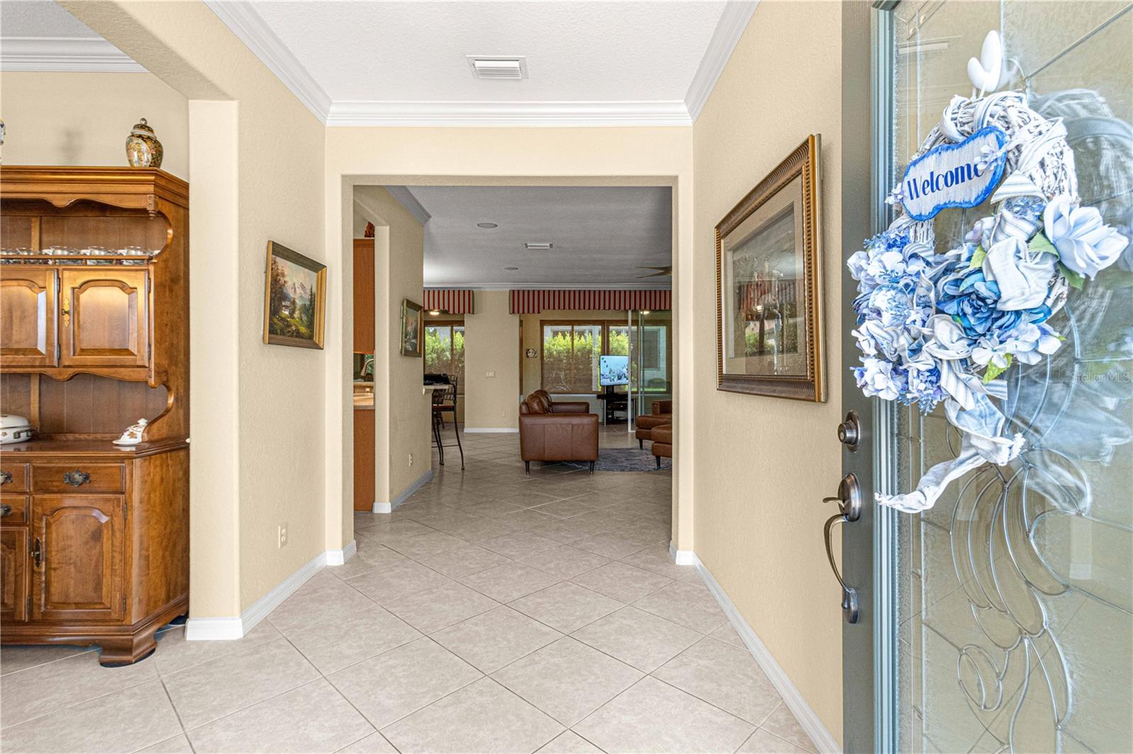 Não espere para marcar sua consulta para ver este modelo especial de Hanover localizado na muito procurada comunidade de mais de 55 anos de Del Webb Spruce Creek Golf & Country Club. Assim que você subir, você notará o meio-fio de concreto com paisagismo maduro e leitos rochosos. Lindas portas duplas de vidro com chumbo que entram na casa com um vitral correspondente acima. A tela da porta da frente é agradável para deixar entrar uma brisa. Ladrilhos diagonais neutros estão nas áreas de entrada, cozinha, sala de estar e jantar, bem como em ambos os banheiros. O piso de tábuas vinílicas está nos quartos. Não há tapete aqui! Cantos arredondados nas paredes para evitar lascas. Moldagem de coroa está EM TODA PARTE! Persianas por toda parte. Novos eletrodomésticos de aço inoxidável preto na cozinha. Knock knock permite que você visualize o interior da geladeira iluminada (com luz ultravioleta em água filtrada e máquina de fazer gelo artesanal extra) e forno duplo (com métodos de cozimento ao ar livre, convecção e sous vide). Backsplash de azulejos com iluminação sob o armário e um tubo solar tornam esta cozinha leve e brilhante. Novo telhado em 2022. Um sistema Carrier Infinity HVAC de 4,5 toneladas (22 seer) com sistema de purificação de ar de nível hospitalar junto com garantia transferível até 2027. E aquecedor de água com detecção de vazamento também foram instalados em 2022, ambos com conectividade WiFi. Alto-falantes embutidos na espaçosa área de estar. O quarto principal é grande o suficiente para uma cama king size com muito espaço de sobra. O banheiro principal tem um chuveiro extra grande com chuveiros duplos e um grande closet. Os quartos secundários têm o tamanho certo para os hóspedes, e um deles ainda tem 2 mesas embutidas com uma mesa embutida que é perfeita para um escritório em casa. Há uma varanda fechada isolada que é perfeita para entretenimento com os controles deslizantes abertos. Não vamos esquecer o pátio traseiro pavimentado com pérgula e arbustos de privacidade. A casa inclui controle de pragas com tubos nas paredes e um vínculo transferível contra cupins. A garagem possui uma tela deslizante na porta interna, piso pintado, pia, porta de garagem isolada, tela de enrolar com controle remoto e escadas retráteis do sótão para armazenamento no sótão. E ainda por cima, as tubulações do sótão já foram convertidas para PVC!
