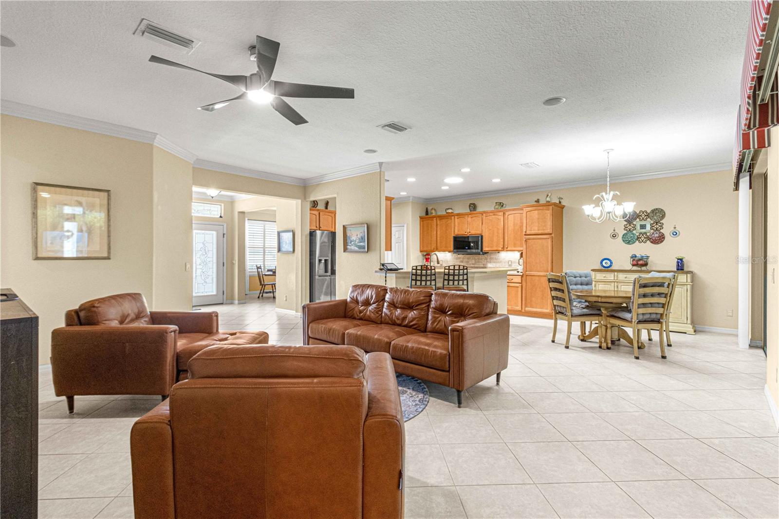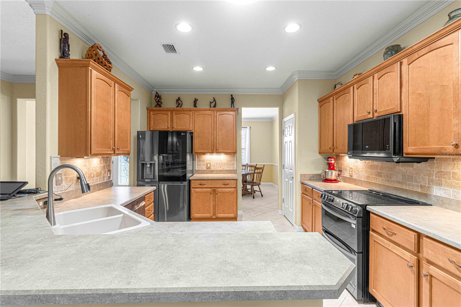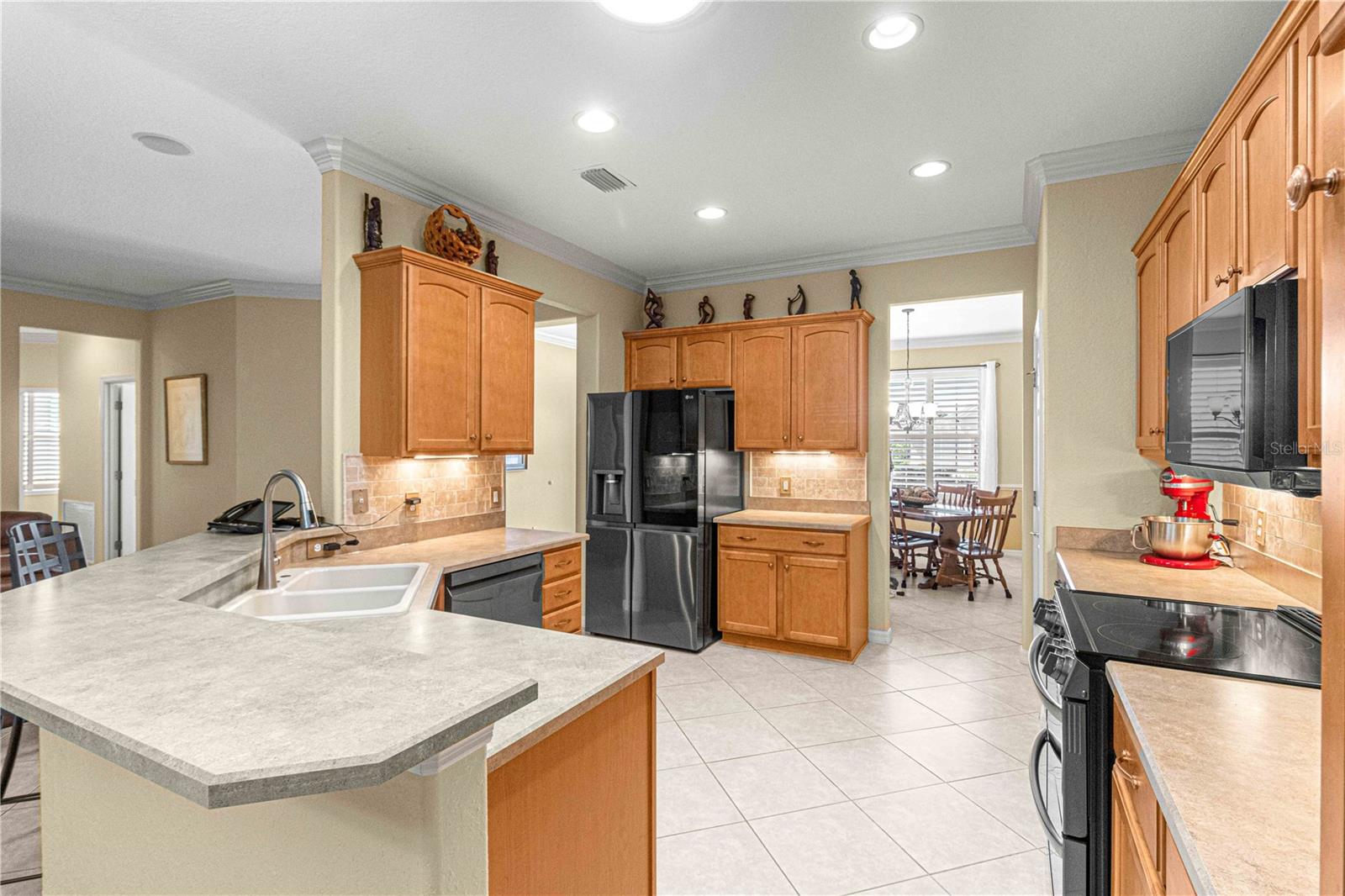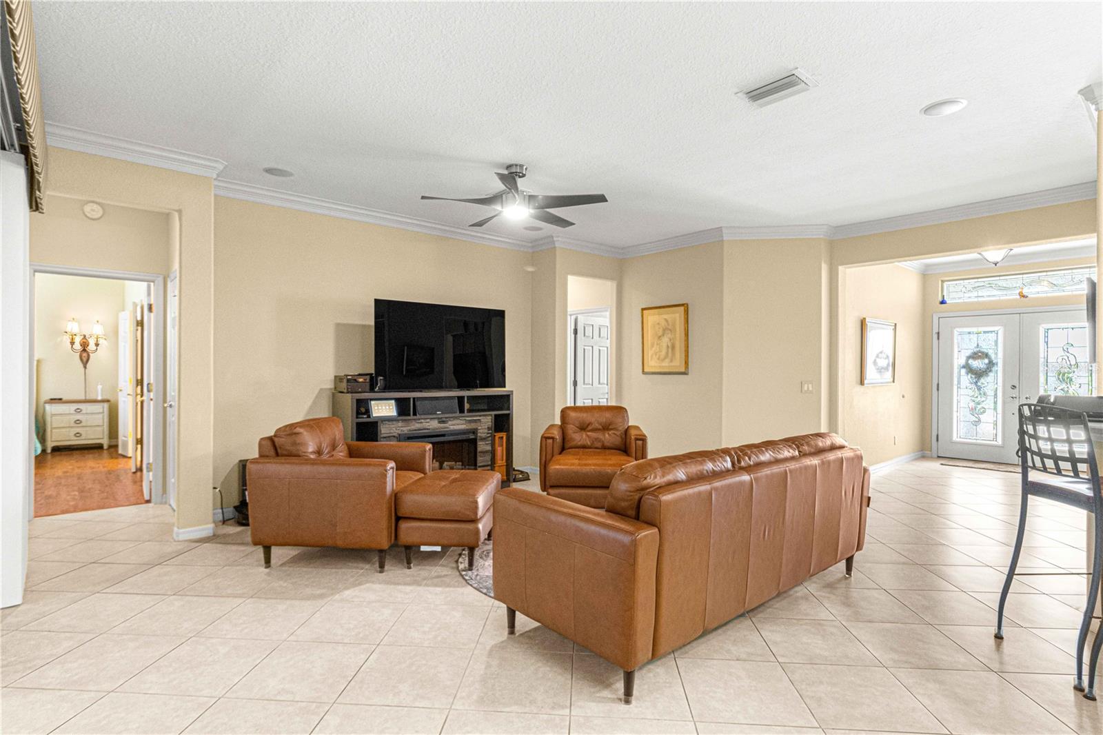 Não espere para marcar sua consulta para ver este modelo especial de Hanover localizado na muito procurada comunidade de mais de 55 anos de Del Webb Spruce Creek Golf & Country Club. Assim que você subir, você notará o meio-fio de concreto com paisagismo maduro e leitos rochosos. Lindas portas duplas de vidro com chumbo que entram na casa com um vitral correspondente acima. A tela da porta da frente é agradável para deixar entrar uma brisa. Ladrilhos diagonais neutros estão nas áreas de entrada, cozinha, sala de estar e jantar, bem como em ambos os banheiros. O piso de tábuas vinílicas está nos quartos. Não há tapete aqui! Cantos arredondados nas paredes para evitar lascas. Moldagem de coroa está EM TODA PARTE! Persianas por toda parte. Novos eletrodomésticos de aço inoxidável preto na cozinha. Knock knock permite que você visualize o interior da geladeira iluminada (com luz ultravioleta em água filtrada e máquina de fazer gelo artesanal extra) e forno duplo (com métodos de cozimento ao ar livre, convecção e sous vide). Backsplash de azulejos com iluminação sob o armário e um tubo solar tornam esta cozinha leve e brilhante. Novo telhado em 2022. Um sistema Carrier Infinity HVAC de 4,5 toneladas (22 seer) com sistema de purificação de ar de nível hospitalar junto com garantia transferível até 2027. E aquecedor de água com detecção de vazamento também foram instalados em 2022, ambos com conectividade WiFi. Alto-falantes embutidos na espaçosa área de estar. O quarto principal é grande o suficiente para uma cama king size com muito espaço de sobra. O banheiro principal tem um chuveiro extra grande com chuveiros duplos e um grande closet. Os quartos secundários têm o tamanho certo para os hóspedes, e um deles ainda tem 2 mesas embutidas com uma mesa embutida que é perfeita para um escritório em casa. Há uma varanda fechada isolada que é perfeita para entretenimento com os controles deslizantes abertos. Não vamos esquecer o pátio traseiro pavimentado com pérgula e arbustos de privacidade. A casa inclui controle de pragas com tubos nas paredes e um vínculo transferível contra cupins. A garagem possui uma tela deslizante na porta interna, piso pintado, pia, porta de garagem isolada, tela de enrolar com controle remoto e escadas retráteis do sótão para armazenamento no sótão. E ainda por cima, as tubulações do sótão já foram convertidas para PVC!