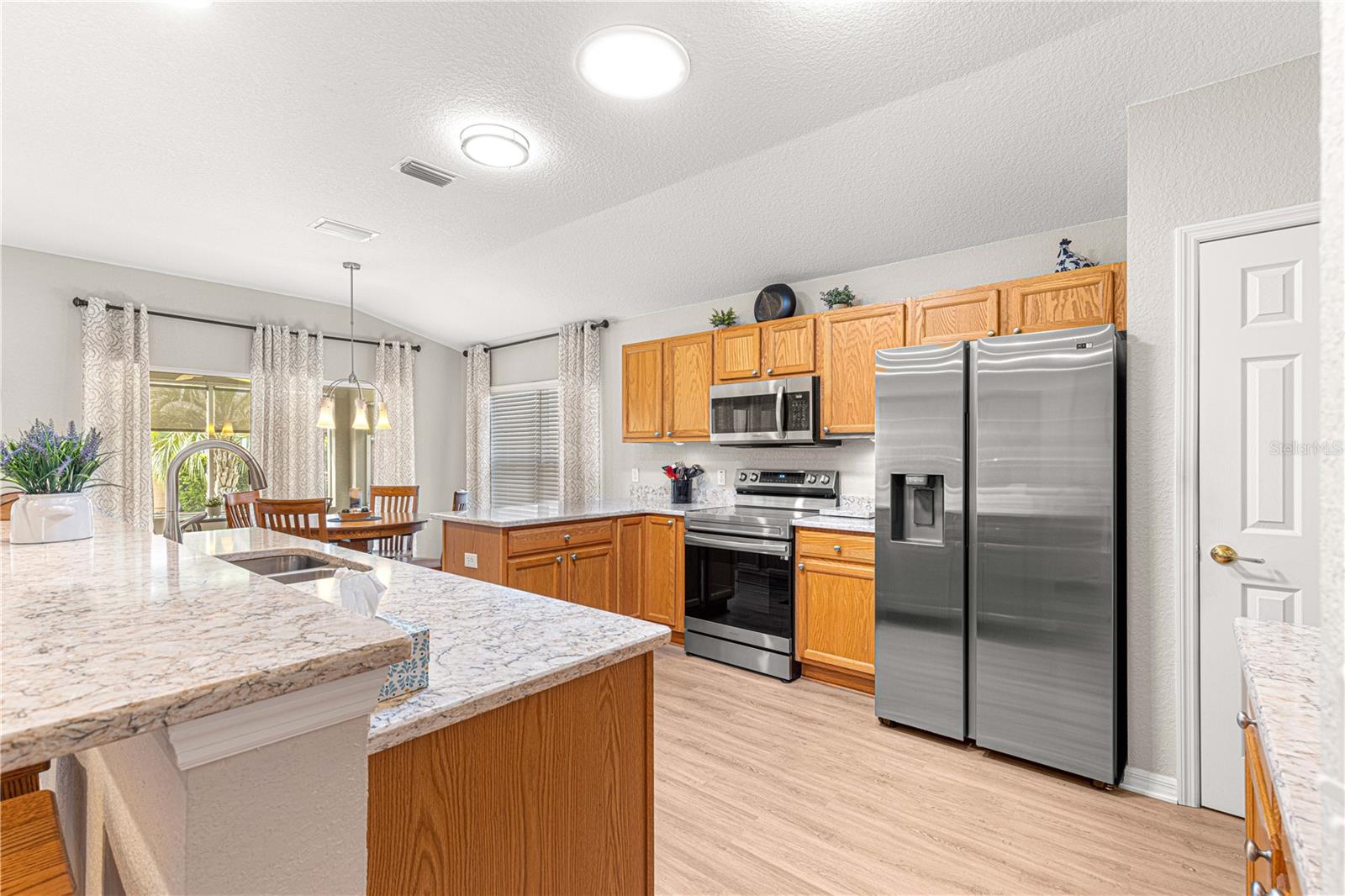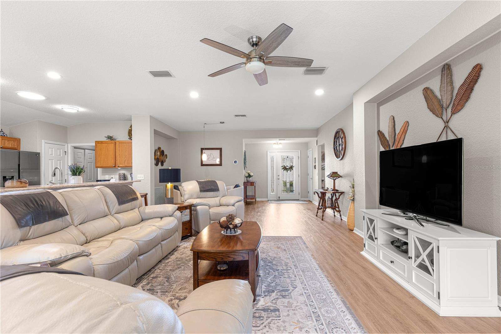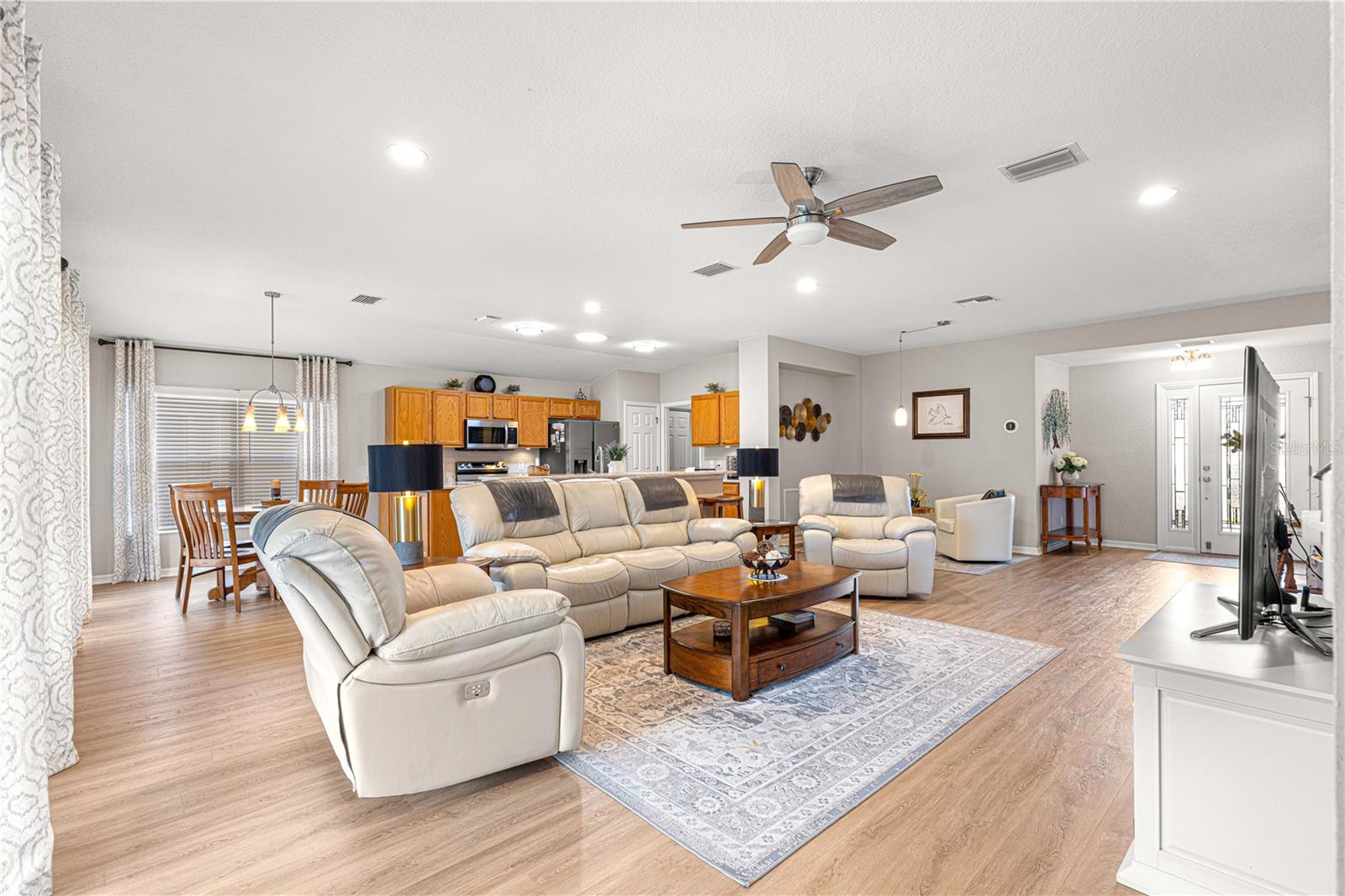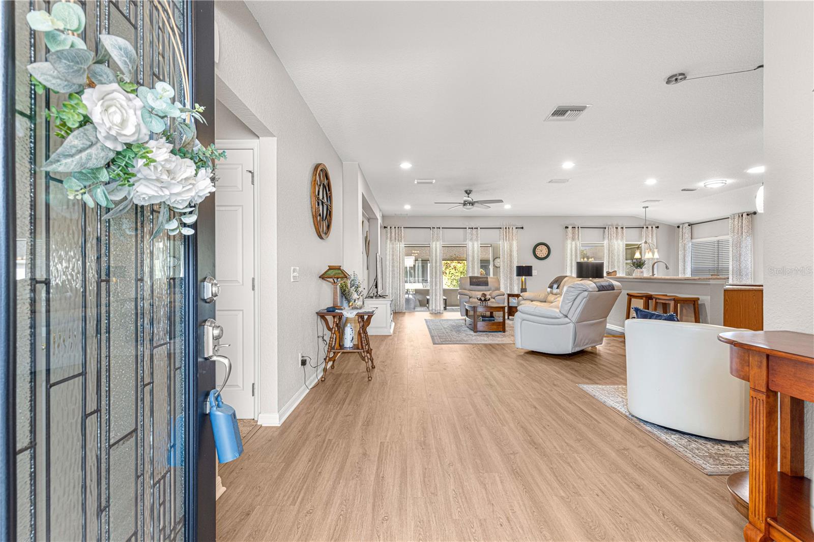 Bem-vindo a este lindamente mantido 3 quartos, 2 banheiros na casa no procurado 55 e melhor comunidade de Del Webb Spruce Creek Golf & Country Club. Esta planta popular de piso elkridge oferece apelo excepcional, com uma paisagem limpa e de baixa manutenção com detalhes em pedra, uma tela de garagem motorizada e uma porta de entrada de vidro com chumbo com uma tela de porta frontal retrátil para uma vida sem interior e saída interna. Entre em um espaço de vida de conceito aberto e aberto para entretenimento, com uma área flexível, jantar, bar de café da manhã e espaçosa sala de estar. O coração da casa é a cozinha atualizada, mostrando novas bancadas de quartzo, que combinam perfeitamente com os armários de carvalho sólido com puxões duplos, aparelhos de aço inoxidável mais recentes, espaço para despensa personalizada e um tubo solar para trazer uma abundância de luz natural. Desfrute de conforto durante todo o ano com pisos de vinil de luxo nas áreas principais, tapetes mais novos nos três quartos e um chuveiro primário de suíte primário recentemente remodelado. A casa também inclui atualizações práticas: um telhado reformulado (2014), novo HVAC (2023), aquecedor de água mais recente, escadas do sótão puxadas com armazenamento no sótão com piso, re-tubo de teto em busca de mente e uma válvula de desligamento de água interior elevada. Relaxe no Lanai, voltado para o sul, com tons solares perfeitos para desfrutar do sol sem o calor direto. A garagem estendida forneceu espaço adicional para armazenamento. Com sua localização privilegiada, atualizações atenciosas e comodidades no estilo resort, esta casa pronta para se mover é a mistura perfeita de conforto, conveniência e estilo.
