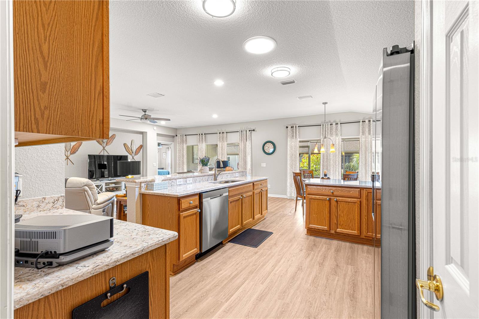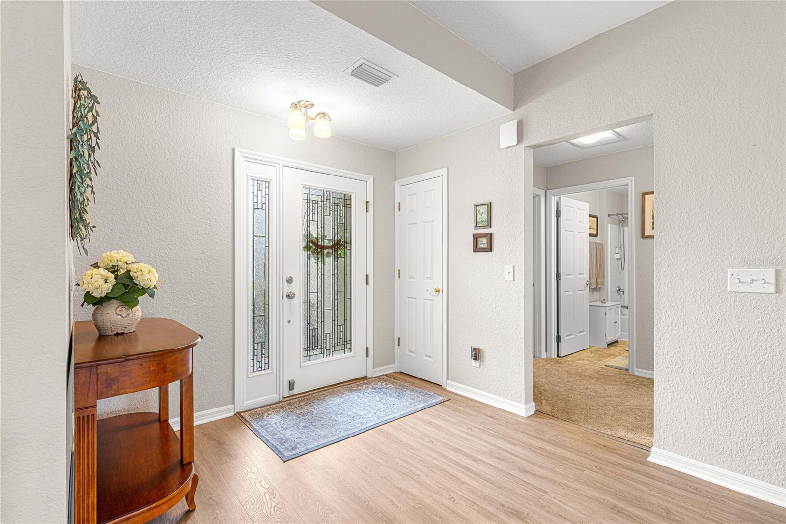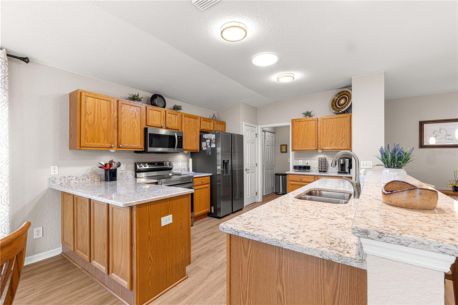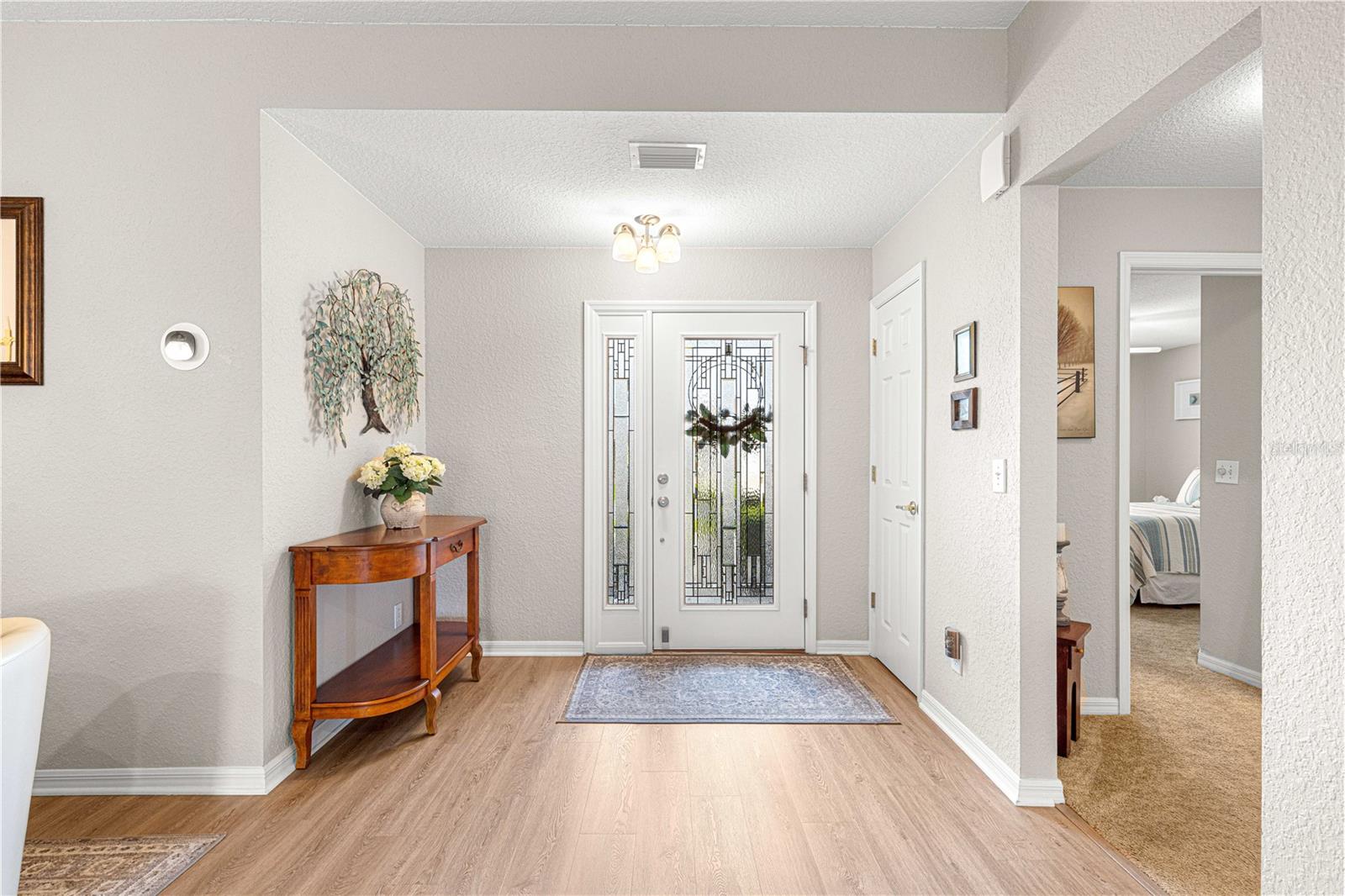 Bem-vindo a este lindamente mantido 3 quartos, 2 banheiros na casa no procurado 55 e melhor comunidade de Del Webb Spruce Creek Golf & Country Club. Esta planta popular de piso elkridge oferece apelo excepcional, com uma paisagem limpa e de baixa manutenção com detalhes em pedra, uma tela de garagem motorizada e uma porta de entrada de vidro com chumbo com uma tela de porta frontal retrátil para uma vida sem interior e saída interna. Entre em um espaço de vida de conceito aberto e aberto para entretenimento, com uma área flexível, jantar, bar de café da manhã e espaçosa sala de estar. O coração da casa é a cozinha atualizada, mostrando novas bancadas de quartzo, que combinam perfeitamente com os armários de carvalho sólido com puxões duplos, aparelhos de aço inoxidável mais recentes, espaço para despensa personalizada e um tubo solar para trazer uma abundância de luz natural. Desfrute de conforto durante todo o ano com pisos de vinil de luxo nas áreas principais, tapetes mais novos nos três quartos e um chuveiro primário de suíte primário recentemente remodelado. A casa também inclui atualizações práticas: um telhado reformulado (2014), novo HVAC (2023), aquecedor de água mais recente, escadas do sótão puxadas com armazenamento no sótão com piso, re-tubo de teto em busca de mente e uma válvula de desligamento de água interior elevada. Relaxe no Lanai, voltado para o sul, com tons solares perfeitos para desfrutar do sol sem o calor direto. A garagem estendida forneceu espaço adicional para armazenamento. Com sua localização privilegiada, atualizações atenciosas e comodidades no estilo resort, esta casa pronta para se mover é a mistura perfeita de conforto, conveniência e estilo.