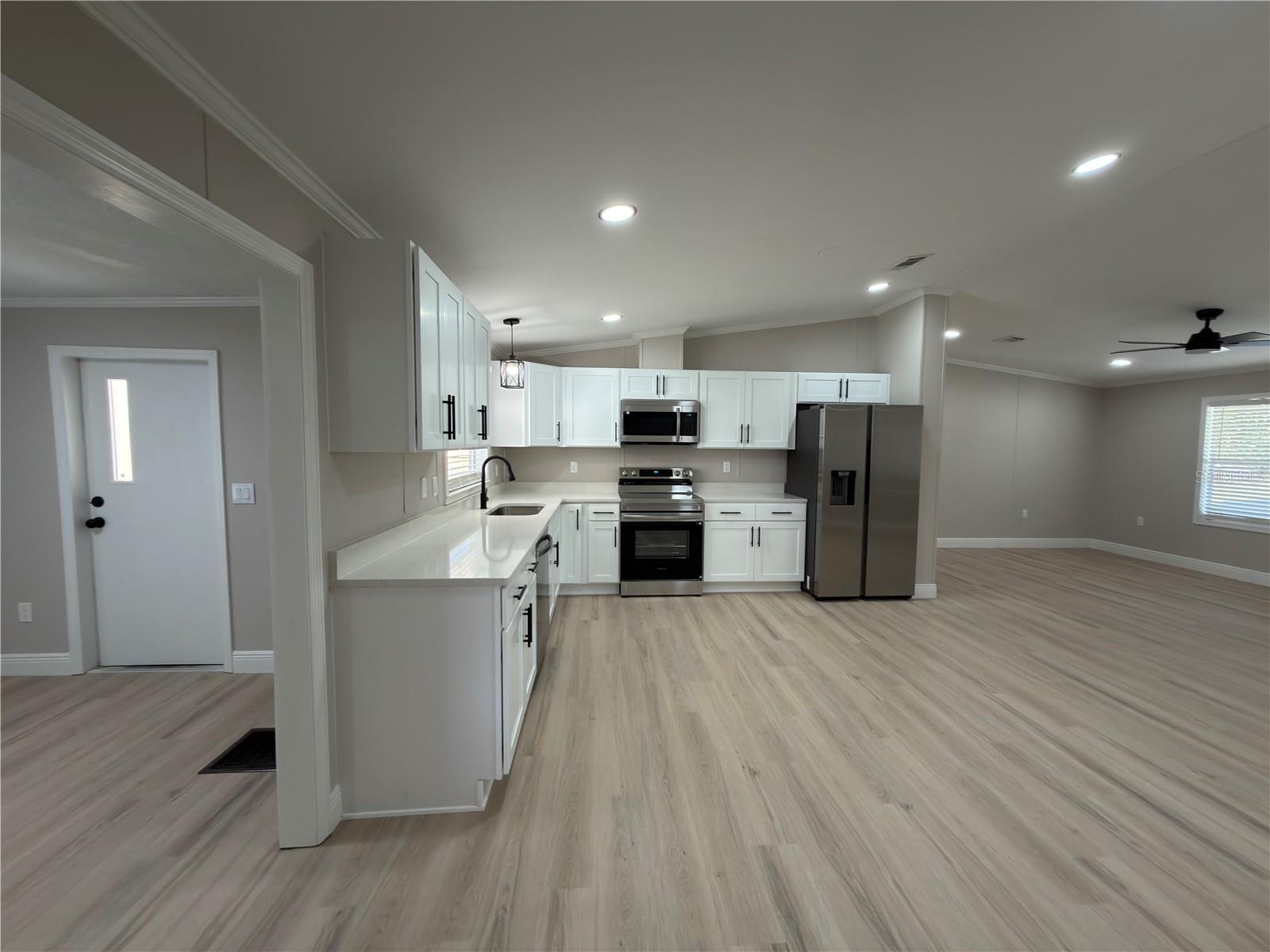 Esta bela casa móvel de 4 quartos e 2 banheiros foi completamente atualizada e fica em um terreno espaçoso e grande em Summerfield. Entre em uma cozinha moderna com armários novos, elegantes bancadas de quartzo e eletrodomésticos de aço inoxidável. A planta dividida da casa inclui pintura interna fresca, piso de pranchas de vinil luxuoso e novas luminárias elegantes por toda parte. A suíte principal oferece pia dupla e box amplo duplo, enquanto o banheiro de hóspedes apresenta uma nova combinação de banheira e chuveiro. As atualizações adicionais incluem um teto totalmente novo, uma nova unidade de ar condicionado e pintura externa nova.