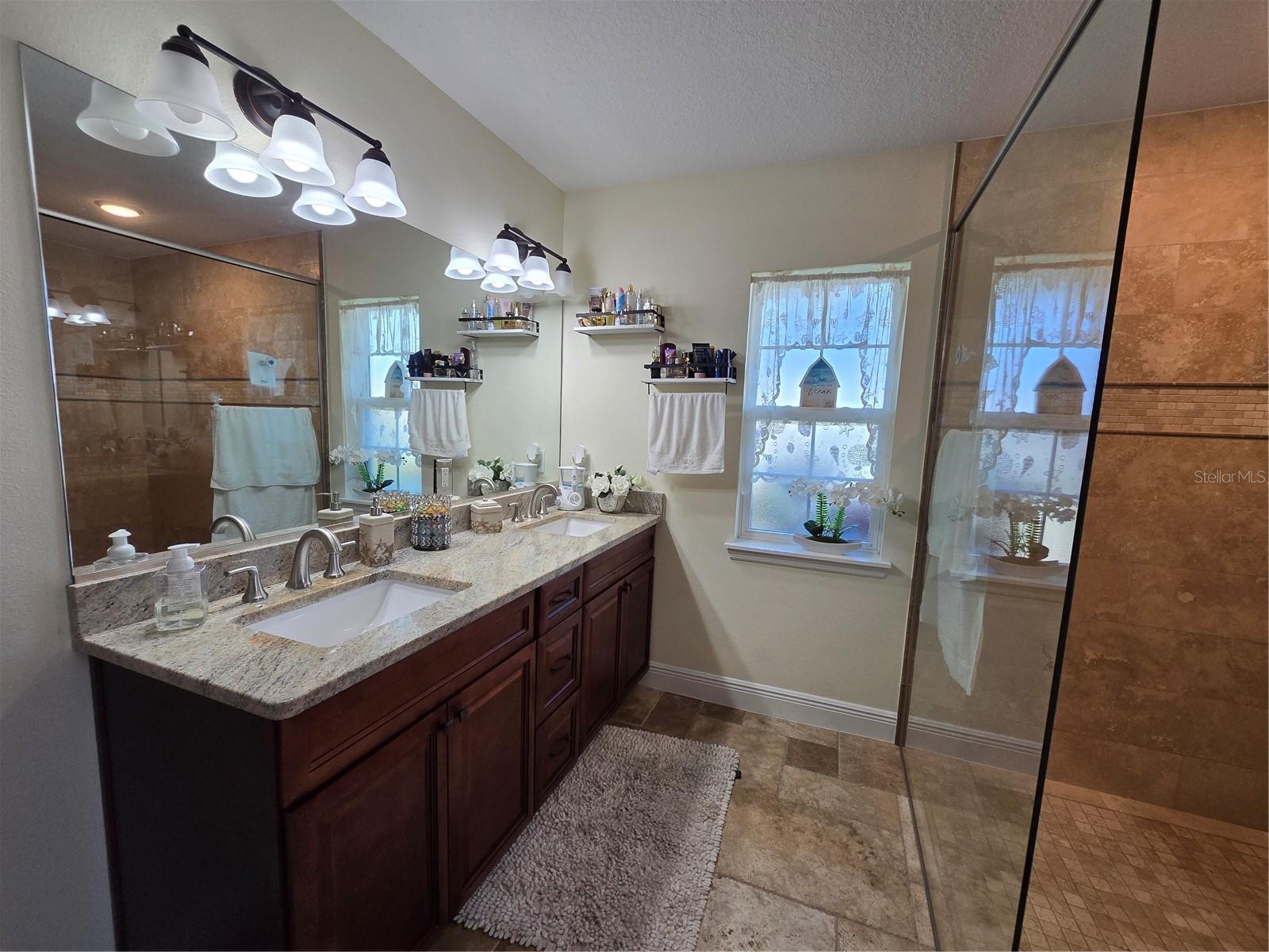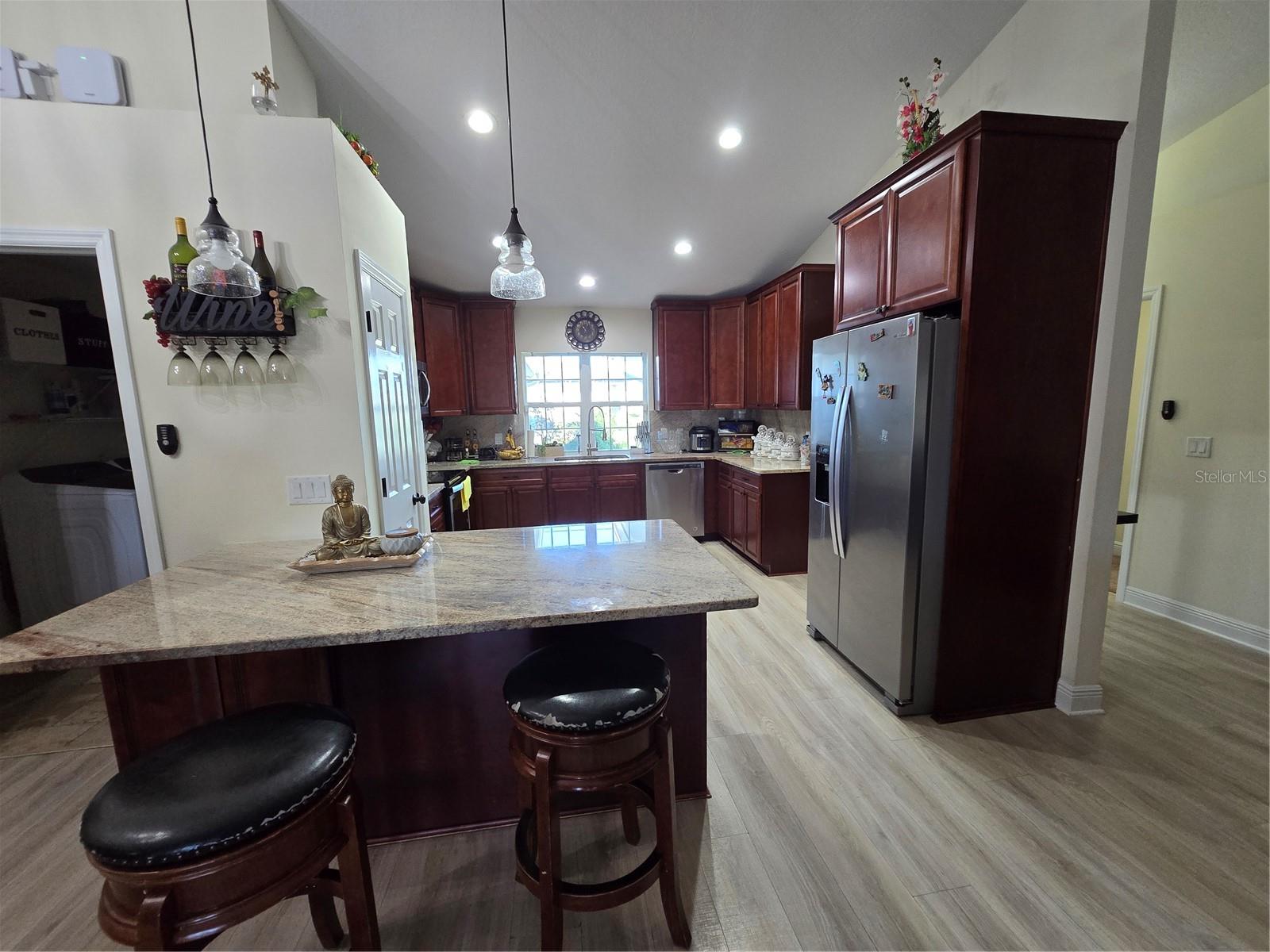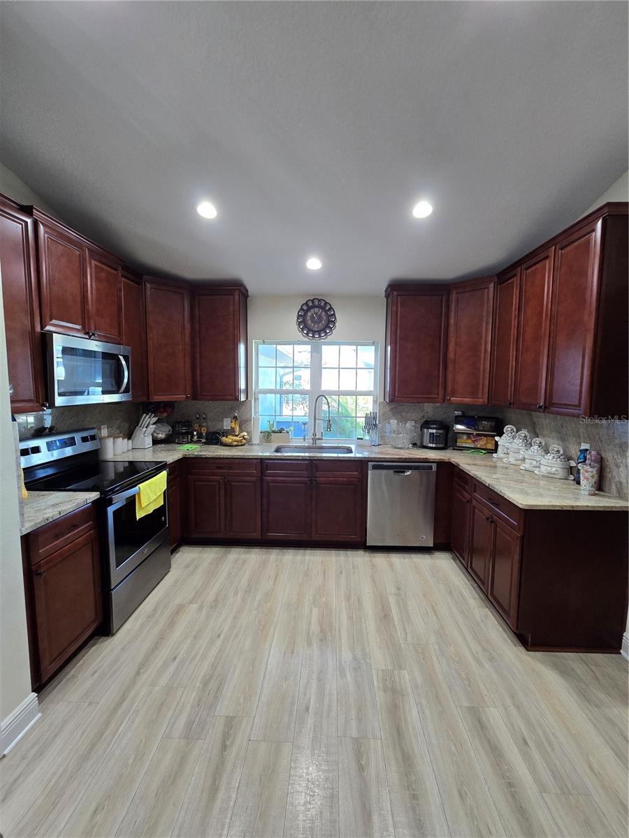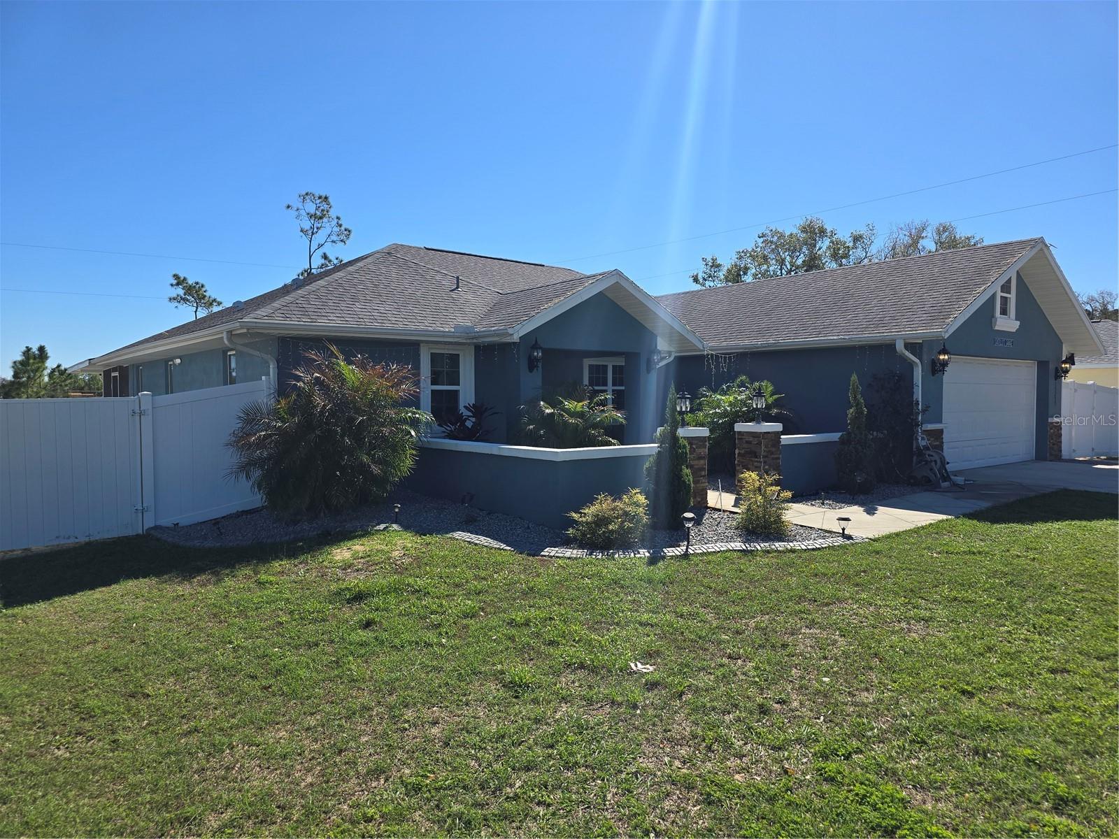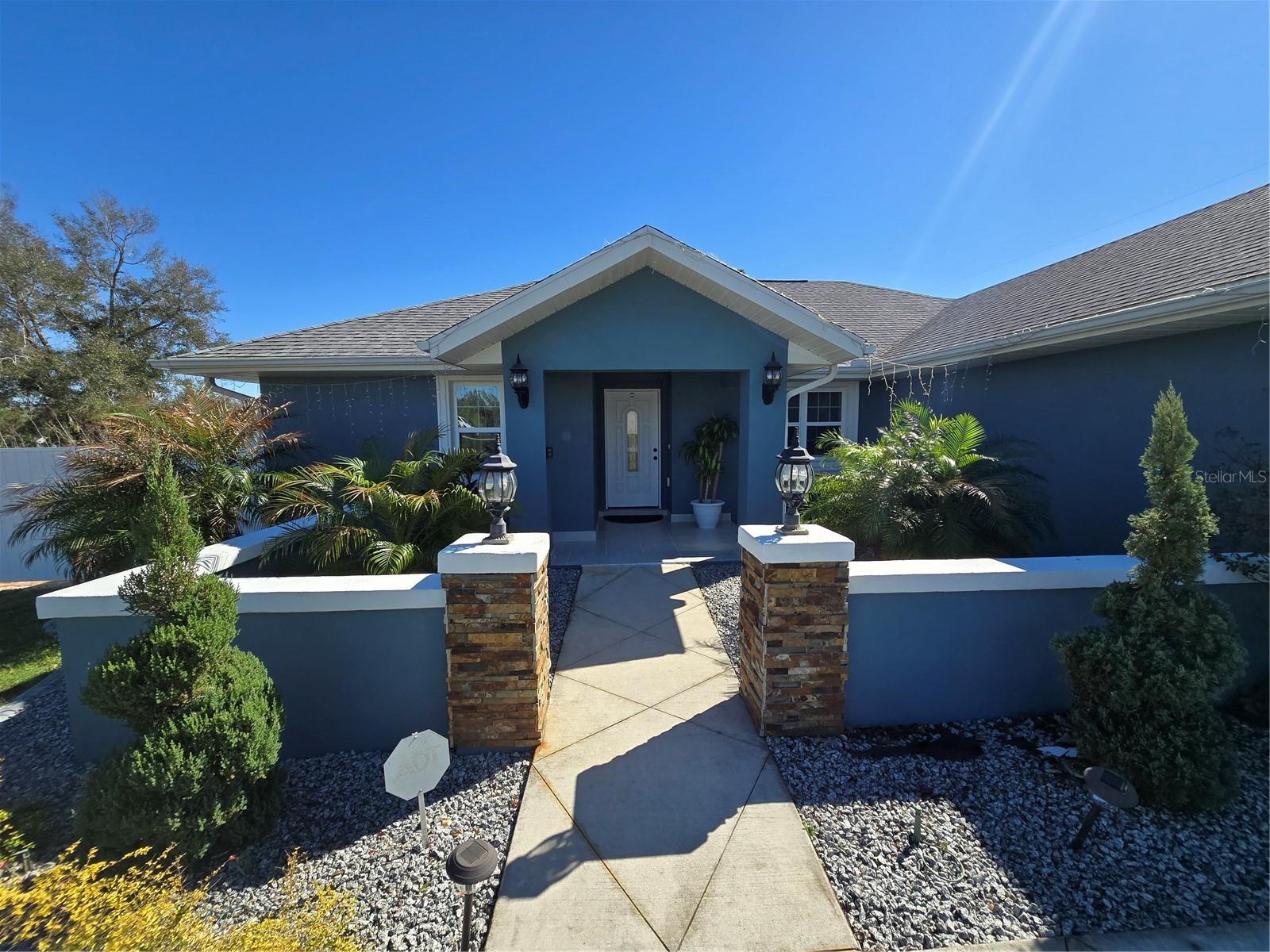 Não perca esse "2018" construído em casa em laranja Blossom Hills! Muitos extras de construtores e proprietários adicionados nesta casa! OVER 1600+ living sq.ft., 3 bedrooms, 2 baths SPLIT PLAN, block and stucco, beautiful courtyard with brick accents and outdoor wall sconces, gorgeous lighting inside too, pendant lights over eat-at counter in kitchen, stainless steel appliances, chandelier over dining table, and lots of recessed lighting throughout kitchen area, granite counter tops, under cabinet lighting in kitchen, travertine tile flooring in bath and inside laundry room, gorgeous high quality laminate in foyer, kitchen, living and dining areas, hang down stain glassed light fixture as you enter the home, hand picked fans in almost every room, large great room with dining area off kitchen, large master bedroom suite with trey ceiling, stunning master bath with glass enclosed and tiled shower, granite counters and double vanity sinks, 2 GREAT sized guest bedrooms, wonderful guest bath tub and shower with tiled walls, Enormes portas francesas com vidro interno com persianas abertas e fechadas que levam ao quintal e um bom tamanho com pátio de concreto nas costas cobertas e garagem de 2 carros! Perto das aldeias, restaurantes, compras, entretenimento e muito mais!