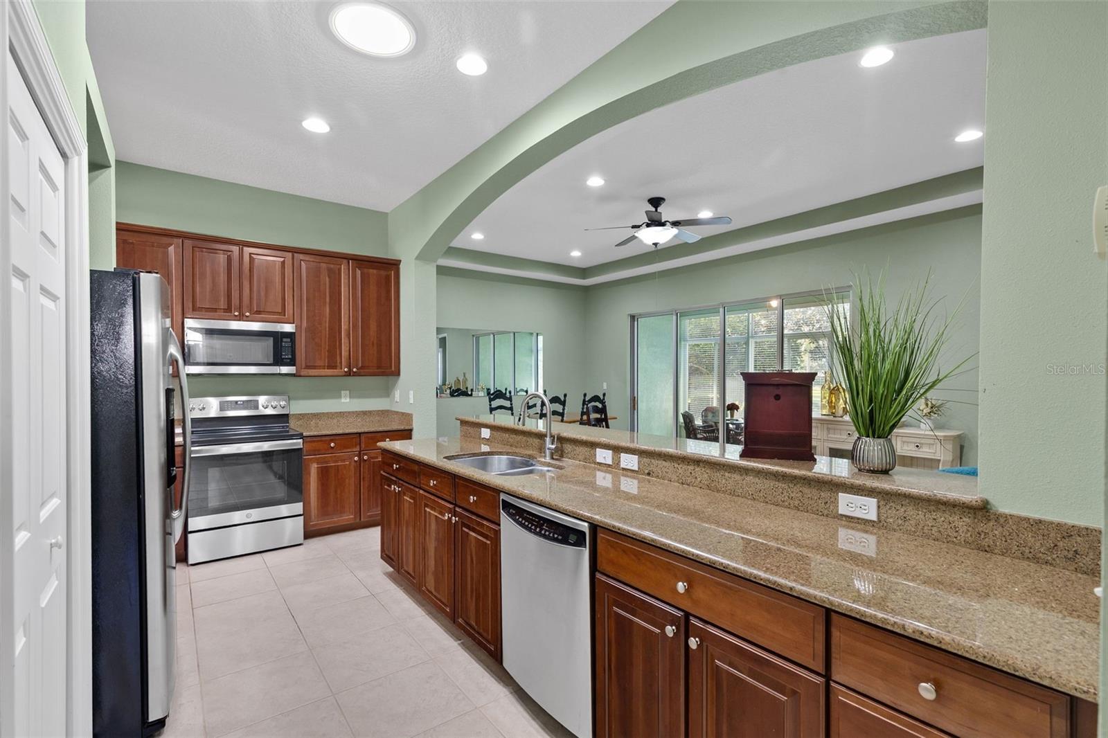 Linda casa em Kensington Greens perto do South Clubhouse com recursos atualizados em todo: Esta casa em Kensington Greens, localizada a poucos passos do South Clubhouse, está repleta de atualizações impressionantes. A cozinha possui bancadas de granito, armários de madeira de 42 polegadas e eletrodomésticos GE Profile, incluindo um prático fogão a gás e um forno elétrico de convecção. Uma geladeira extragrande possui uma máquina de gelo e um dispensador de água fria, facilitando a preparação das refeições e o entretenimento. Os banheiros são igualmente luxuosos, com bancadas em Corian nos banheiros principal e de hóspedes. O banheiro principal foi projetado para oferecer conforto, com pias duplas e um espaçoso chuveiro reclinável com dois assentos de canto. A suíte master oferece amplo armazenamento com dois closets. Desfrute de relaxamento ou entretenimento na ampla sala de estar 14x23 e na área de jantar, convenientemente localizada ao lado da cozinha. Saia para a varanda 8x18 e aprecie a bela paisagem. A lavanderia inclui armários de madeira e está equipada com lavadora e secadora Maytag para maior comodidade. Esta casa bem cuidada reflete verdadeiramente o orgulho da propriedade, com cada detalhe cuidadosamente mantido. Localizado em King's Point, um condomínio fechado em Sun City Center, os moradores têm acesso a mais de 200 clubes e atividades sociais. Quer prefira manter-se activo ou relaxar, pode desfrutar de quatro piscinas exteriores aquecidas e duas piscinas interiores. A comunidade oferece uma ampla gama de atividades, incluindo aulas de dança, bingo, bridge, clubes de artesanato e muito mais. Um teatro com 800 lugares oferece shows ao vivo e filmes inéditos para entretenimento o ano todo. Quer você seja um snowbird em busca de uma residência sazonal ou de uma casa durante todo o ano, esta propriedade certamente atenderá às suas necessidades.