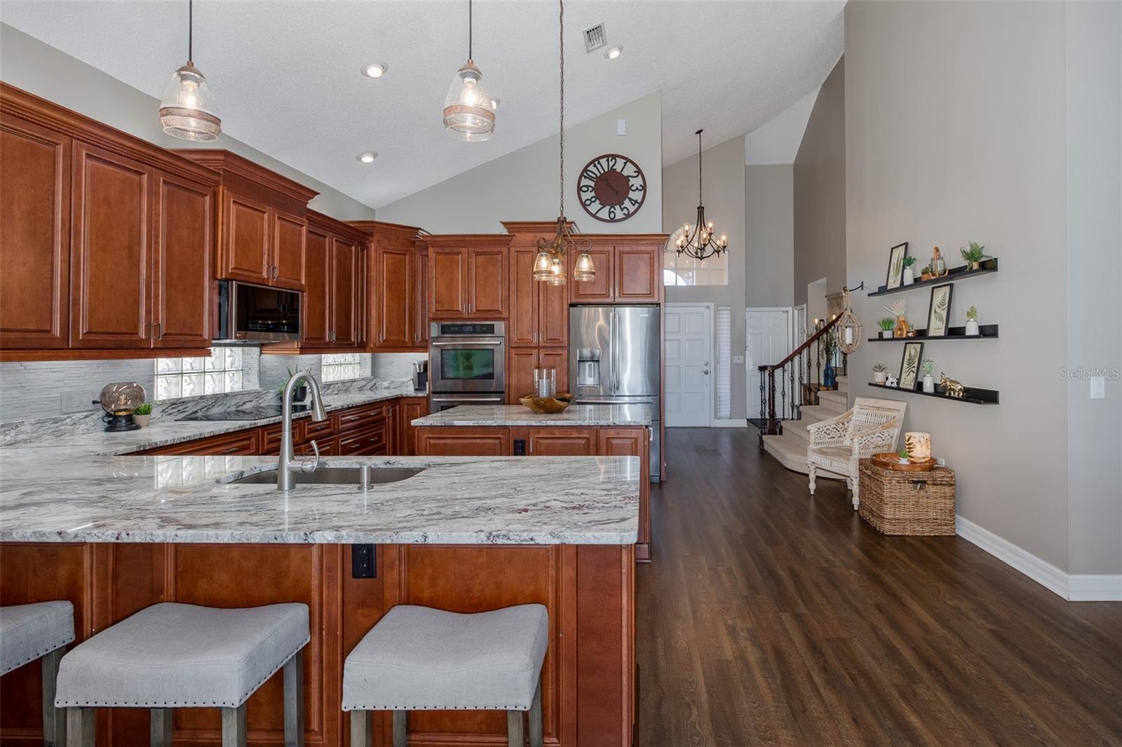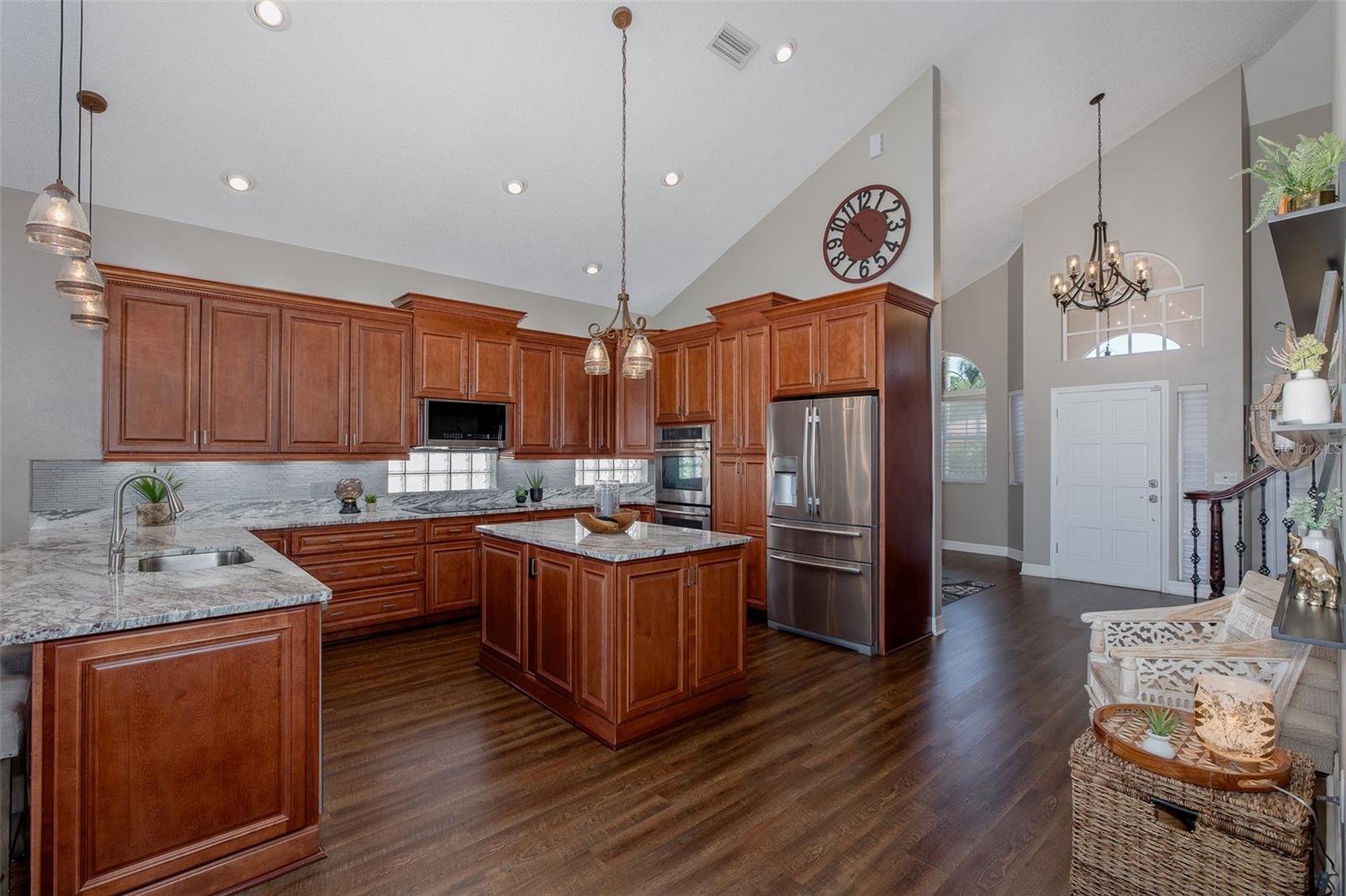 Sob ofertas de backup que aceitam contratos. Deslumbrante diz tudo! Manutenção de luxo Família gratuita em casa com 3 quartos verdadeiros, 2 1/2 banheiros, piscina aquecida, além de tirar o fôlego, vistas panorâmicas do campo de golfe, lago e pôr do sol. Garage Door 2022, New Tile Roof 2015, New 15+ Seer Variable Speed A/C 2016 Além do New Windows 2010, faça com que este domicílio seja eficiente em termos de energia! A Remodel de cozinha completa oferece uma planta de piso conceitual aberta com uma ilha dupla, utensílios de aço inoxidável Jenn-Air, armários de madeira personalizados e bancadas em granito, com vista para a grande sala, com um ponto focal sendo a lareira de madeira remodelada. O canto do café da manhã fora da cozinha oferece portas francesas para a área de grelhar Lanai. Uma sala de jantar formal separada é ótima para entretenimento (atualmente sendo usado como escritório). Novo piso de vinil de luxo durante todo o tempo. A suíte master do primeiro andar é completamente remodelada e oferece um closet com organizadores personalizados, chuveiro, vaidade dupla, armários de madeira e bancadas em granito. Relaxe na extensa Lanai com pavimentadoras de tijolos, gabinete de tela e excelentes vistas. Tons elétricos e manuais complementam as janelas e as portas deslizantes nesta casa, adicionando privacidade, preservando as vistas. A grande lavanderia do primeiro andar tem uma pia de utilidade, prateleira dobrável de granito e armários. A taxa de manutenção inclui a pintura do exterior do lar, os gramados de corte, a rega de gramados, a cobertura morta, os arbustos de corte, o fertilizante do gramado. Uma lista detalhada das atualizações desta casa está disponível mediante solicitação. A comunidade oferece um clube de golfe e country ativo com um restaurante e eventos completos, além de um clube de tênis e uma casa de guarda fechada de 24 horas. Um verdadeiro estilo de vida!