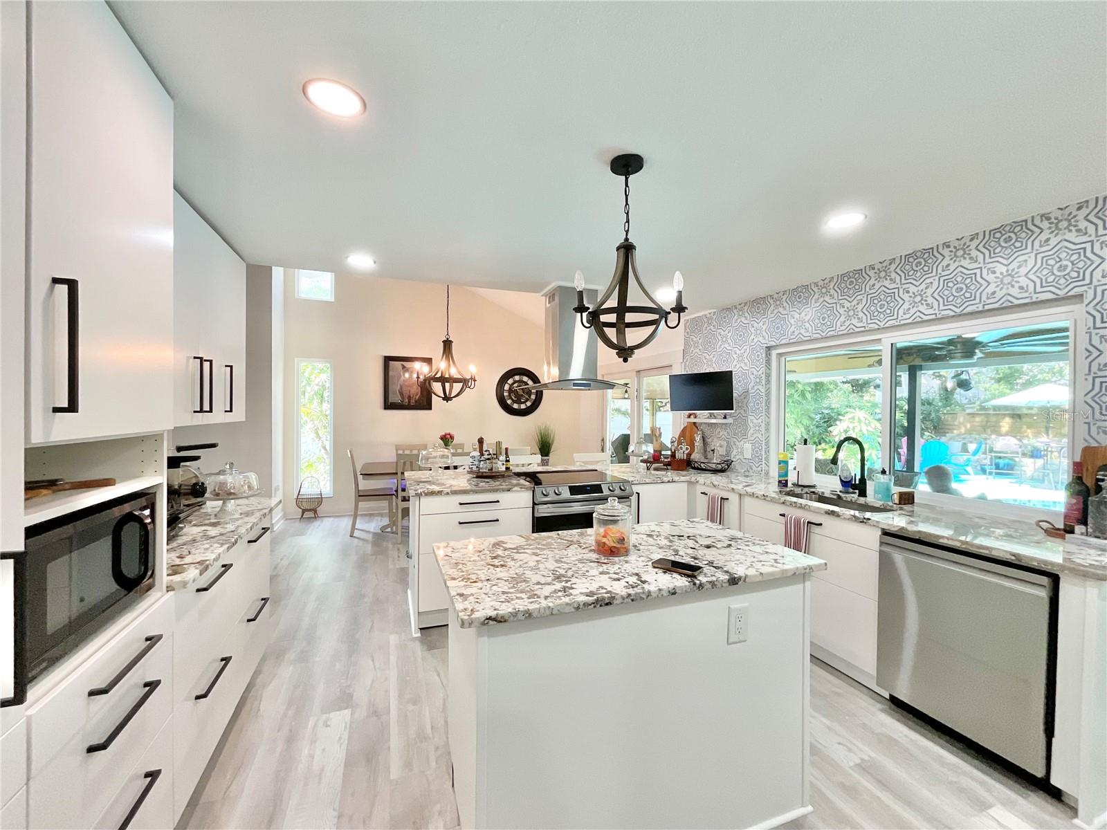Listado 85K abaixo do valor de avaliação! Nunca inundado! Entre em uma grande residência onde a elegância e a serenidade tropical coexistem em perfeita harmonia. Esta grande casa de cinco quartos, mais escritório e três banheiros e meio, lindamente remodelada e projetada, oferece não apenas um espaço interior generoso, mas um lindo ambiente ao ar livre que transforma a vida cotidiana em férias permanentes. Ao entrar na casa, você é imediatamente saudado por uma bela sala de estar com tetos altos, onde a luz natural entra através de amplas janelas e vigas expostas acrescentam caráter e charme atemporais. No centro da sala há uma alta lareira de tijolos que se eleva até o teto alto. Logo além da sala de estar, a cozinha com sala de jantar oferece vista para o quintal através de grandes janelas e portas de correr que trazem luz natural e sensação de conexão com o exterior. A cozinha apresenta uma ilha de cozinha cuidadosamente posicionada na lateral aberta para a sala de jantar, criando um fluxo funcional que abre o espaço. Armários sólidos revestem as paredes, oferecendo armazenamento generoso com apelo atemporal, enquanto bancadas em granito acrescentam um toque de durabilidade. Esteja você preparando refeições ou recebendo convidados, esta cozinha bem projetada combina praticidade com estilo sem esforço. No piso inferior da sala encontra um quarto completo com lareira própria e vista para o quintal, perfeito para noites tranquilas e maior conforto. Ao lado do quarto encontra-se uma lavandaria bem equipada com lavatório, proporcionando um espaço cómodo e eficiente para as tarefas quotidianas e ao lado da lavandaria o fácil acesso à garagem garante transições suaves entre a casa e o carro. No andar de cima da sala de estar, você encontrará três quartos espaçosos, além de um banheiro lindamente remodelado, combinando acabamentos modernos com elegância atemporal para criar um retiro sereno e elegante. No último andar, o quarto principal extragrande o aguarda, oferecendo um retiro tranquilo com luz natural e um espaço generoso para relaxar. Possui closet amplo que fornece armazenamento e organização abundantes. O banheiro principal extragrande é um verdadeiro santuário semelhante a um spa, completo com uma luxuosa banheira independente, chuveiro separado e uma pia dupla projetada para conveniência e estilo - combinando perfeitamente conforto luxuoso e sofisticação. Da cozinha, portas de vidro deslizantes se abrem para uma varanda coberta nos fundos, mobiliada com mesa e cadeiras aconchegantes - um local ideal para jantar, relaxar ou desfrutar do café da manhã enquanto aprecia a vista deslumbrante do quintal e da piscina. O quintal é um verdadeiro refúgio tropical com uma bela piscina cristalina cercada por imponentes palmeiras, plantas floridas e uma vegetação luxuriante. A poucos passos de distância, em um canto privativo, você encontrará um chuveiro externo personalizado, perfeito para enxaguar após um mergulho. Esta casa única fica em um terreno de 0,3 acres com belo paisagismo e oferece uma rara mistura de charme, espaço e atualizações modernas. As melhorias recentes são telhados mais novos (2018), sistema HVAC (2023), portas de garagem (2023), janelas de impacto de furacão (2019) e painéis elétricos atualizados (2023), proporcionando tranquilidade e valor a longo prazo. Idealmente localizada, esta casa fica a poucos minutos do Fred Howard Park, Sunset Beach, do vibrante centro de Tarpon Springs, de escolas, lojas e das icônicas Sponge Docks - oferecendo fácil acesso a recreação costeira, lojas charmosas, restaurantes e rico patrimônio cultural. Não perca a oportunidade de ser dono desta casa!