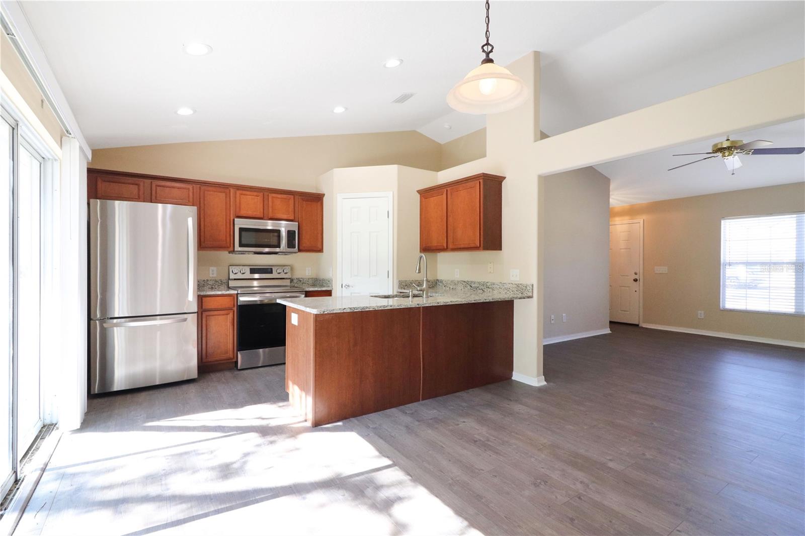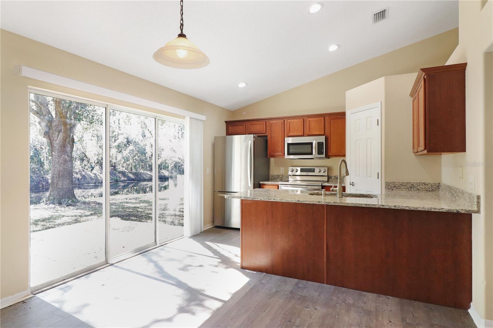 Desfrute de vistas serenas da lagoa nesta casa lindamente renovada! Apresentando um telhado novinho em folha, bancadas em granito e novos pisos por toda parte, esta casa de movimentação Ready oferece uma planta espaçosa e eficiente. A cozinha possui utensílios de aço inoxidável, balcões de granito e amplo espaço, com uma barra de café da manhã e uma área de jantar adjacente perfeita para refeições casuais ou entretenimento. As portas deslizantes levam a um pátio com vista para o quintal pacífico e a área de conservação, criando um cenário ideal para o relaxamento. A grande sala de estar, com seu teto abobadado, oferece muito espaço para assentos confortáveis. A generosa suíte primária inclui um banheiro atualizado com pias duplas, balcões de granito, torneiras atualizadas e um chuveiro. Muito espaço no armário está disponível nos quartos de hóspedes, e o banho de hóspedes possui os mesmos balcões e acessórios que o banheiro primário, juntamente com uma combinação de chuveiro/banheira de azulejos. Uma lavadora e secadora estão incluídas na lavanderia interna para maior conveniência. Localizado em uma comunidade central de 55 anos, esta casa fica convenientemente perto de uma rampa pública para barcos que acessam o lago Eustis, restaurantes locais e compras. Tavares, Leesburg e Mount Dora estão a uma curta distância de carro, e o Aeroporto Internacional de Orlando e as atrações estão a aproximadamente uma hora de distância. Agende sua exibição hoje!