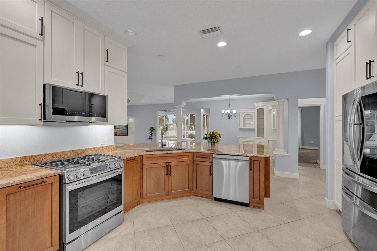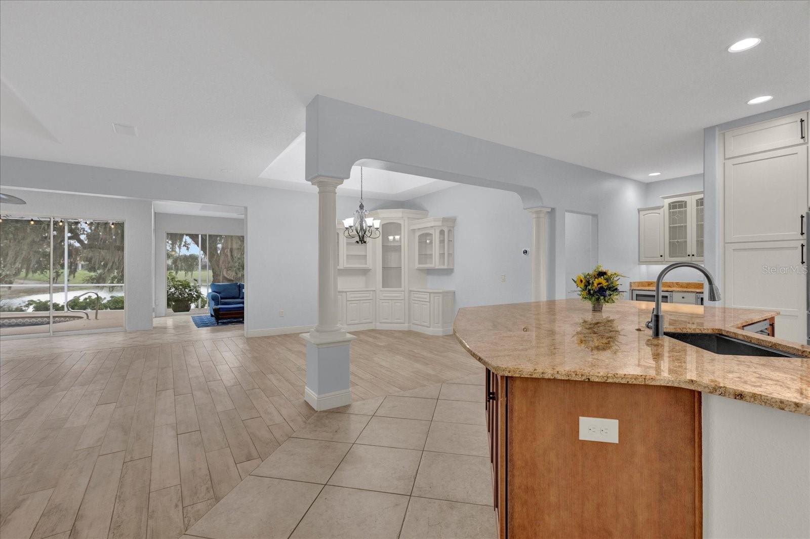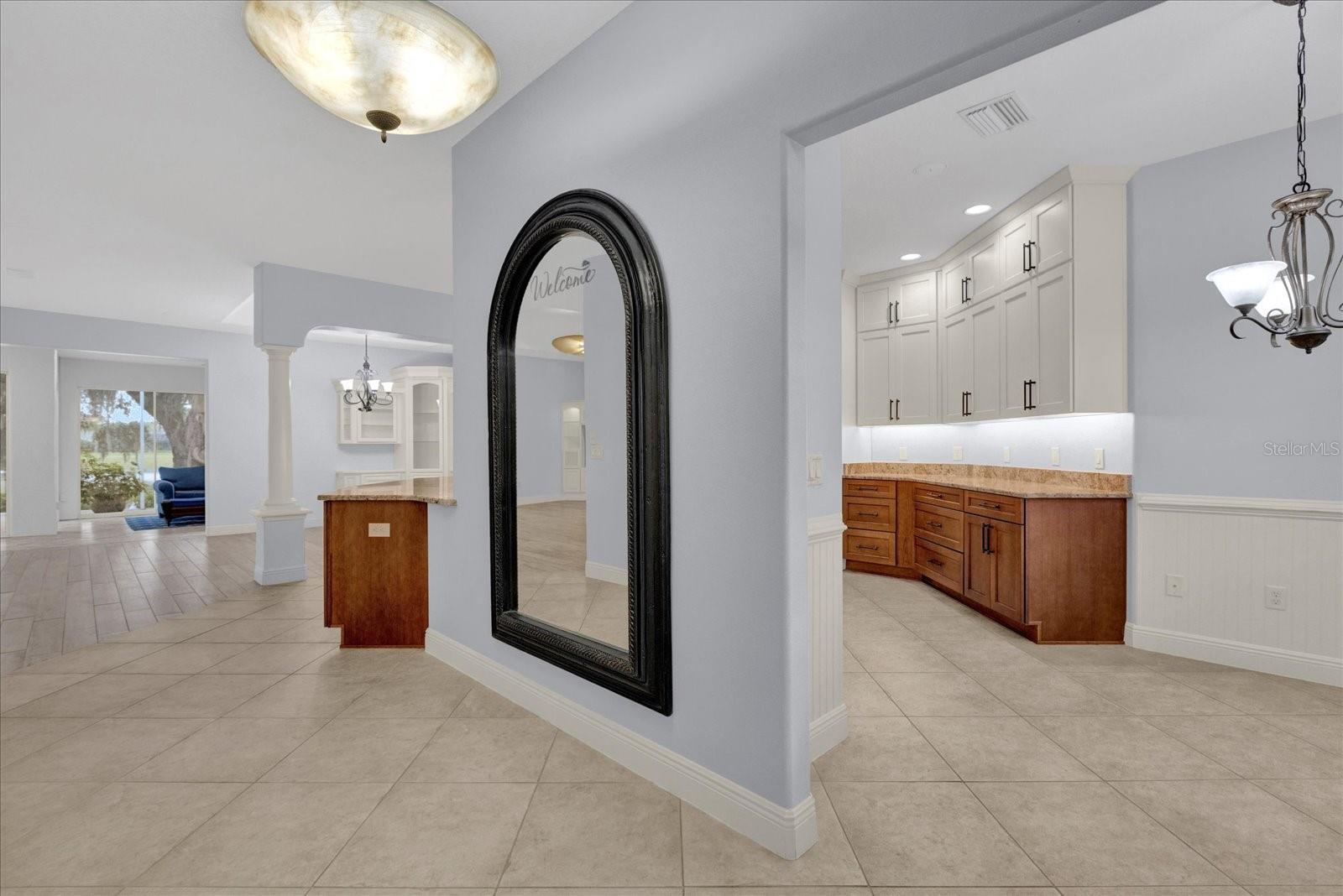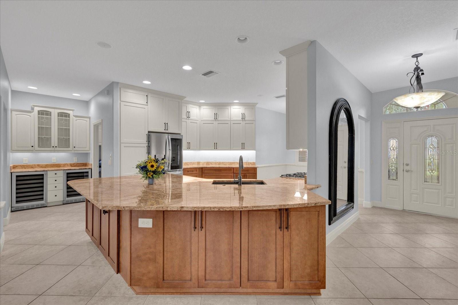 Uma ou mais fotos foram virtualmente encenadas. Esta casa expandida com vista ampla é carregada com atributos especiais, incluindo delícias óbvias e surpresas escondidas. Ele fica no fairway nº 1 do campo do Palmer Legends Championship, no final de um beco sem saída em uma grande área residencial na procurada vila de Winifred. Toda a casa recebeu um tratamento especial no ano passado, elevando-a a um novo patamar de conforto e luxo. A cozinha foi remodelada, com armários superiores White Bay e armários Cherry abaixo, adornados com ferragens de bronze. Lindas bancadas de granito tornam a culinária divertida. Há muito espaço de armazenamento para todos os seus gadgets e conjuntos de pratos. Os novos eletrodomésticos de aço inoxidável da LG incluem uma geladeira com porta francesa de duas gavetas, fogão a gás com forno a gás, micro-ondas e lava-louças. Ao lado está uma estação de bar embutida com dois refrigeradores de vinho e vitrines para copos e utensílios de servir. A sala tem lareira a gás e armários embutidos para televisão, livros e itens colecionáveis; a área de jantar vizinha possui armários de porcelana combinando. Este amplo espaço é adequado para entretenimento. As portas do celeiro se abrem para a sala da Flórida, oferecendo mais comodidades para se reunir com amigos ou apenas abraçar com um bom livro. Este quarto, com aquecimento e ar condicionado, tem uma cozinha de verão com churrasqueira embutida, muitos armários para seus materiais de entretenimento e uma agradável área de estar para assistir ao jogo na TV. Toda a parede externa de portas de vidro da sala Florida se abre para mostrar a piscina recém-aparecida com suas três cachoeiras. A varanda externa Mansard é cercada por palmeiras, um antigo carvalho e paisagismo tropical. Existe até um putting green. Caminhe por um caminho até um pátio escondido, perfeito para o café da manhã ou o vinho à noite. Do quarto Florida, há outra porta deslizante para a espaçosa suíte principal. Seu banheiro privativo tem chuveiro romano, lavatório privativo, armários de linho, pias para ele e para ela e penteadeira embutida para maquiagem. Dois grandes armários com novos sistemas California Closet estão entre o quarto e o banheiro. Do outro lado da casa há dois quartos espaçosos e um grande banheiro secundário com banheira de hidromassagem e chuveiro. Piso de cerâmica é usado em toda a casa, exceto carpete novo nos quartos. A casa tem tetos volumosos, incluindo um teto falso na sala de jantar e no quarto principal. Todo o interior foi recentemente repintado. As comodidades adicionais incluem persianas t/o, tetos desmontáveis, rodapés altos e cantos arredondados de drywall. A despensa possui lavadora e secadora de última geração com armários adicionais e uma grande pia. Há paisagismo aprimorado com detalhes em pavimentação e uma varanda com tela. A garagem para dois carros e carrinho de golfe foi equipada com armários de alta qualidade para guardar suas ferramentas e brinquedos. Uma nova escada mágica dá fácil acesso ao sótão com piso e isolamento. O ar condicionado de três zonas instalado em 2021 inclui luz ultravioleta para matar germes e bactérias. Um aquecedor de água de 75 galões e um novo telhado foram instalados em 2022. Recursos adicionais incluem alto-falantes Bose embutidos t/o, termostatos Nest, claraboias tubulares e um gerador Generac para toda a casa. Esta casa de designer expandida possui 2.864 pés quadrados, MAIS a grande sala fechada da Flórida, elevando a área de estar para 3.717 pés quadrados. Esta é a sua oportunidade de possuir um pedaço do paraíso de The Villages!