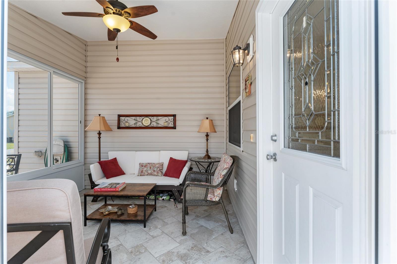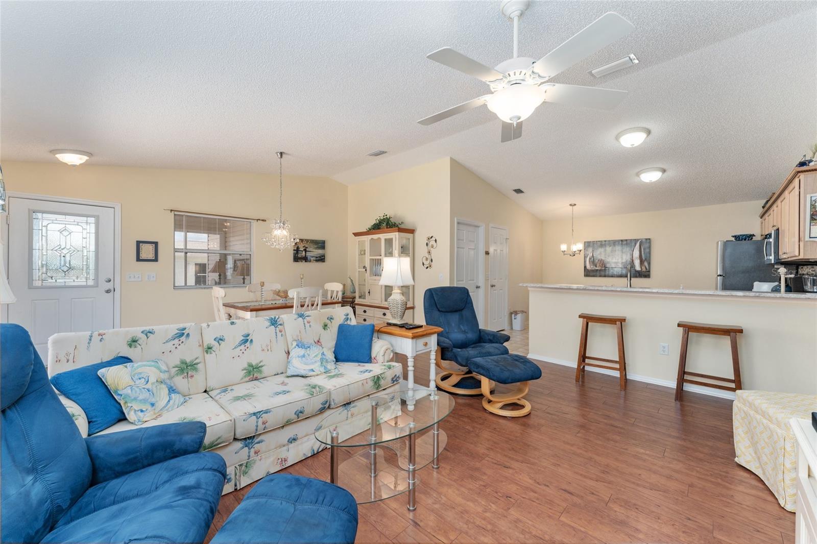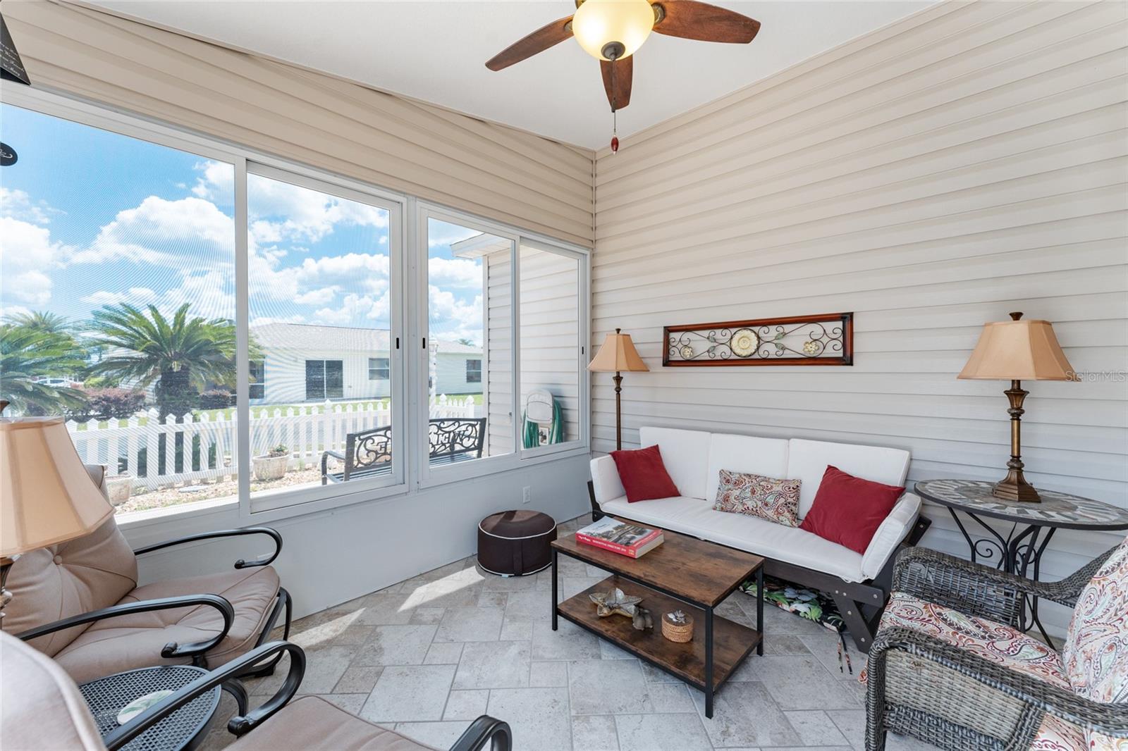 BOND PAGO nesta adorável villa com pátio de 2 quartos e 2 banheiros, chave na mão, na muito procurada vila de Lynnhaven. Sinta-se em casa no espaçoso design de conceito aberto deste modelo Colony, oferecendo tetos abobadados, lindo piso laminado nas áreas principais, combinação de sala de estar/jantar e ventiladores de teto. A elegante cozinha inclui fogão a gás, eletrodomésticos de aço inoxidável, lindo backsplash, espaço para refeições, amplos armários, despensa e uma longa península adequada para bancos de bar. A suíte master tem um grande closet e a suíte tem um box amplo, enquanto o banheiro de hóspedes tem uma combinação banheira/chuveiro. Relaxe e divirta-se sentado em sua varanda fechada ou sente-se em seu amplo pátio lateral com amigos para um churrasco. O telhado é 2021. Traga sua escova de dentes e vá direto para esta casa pronta para uso lindamente mobiliada e comece o próximo capítulo de sua vida morando em The Villages. Temos centenas de clubes, Golfe, ténis, pickleball, shuffleboard, espectáculos, animação nocturna nas praças, lojas, restaurantes, igrejas e muito mais. Por favor, ligue hoje para uma exibição privada.