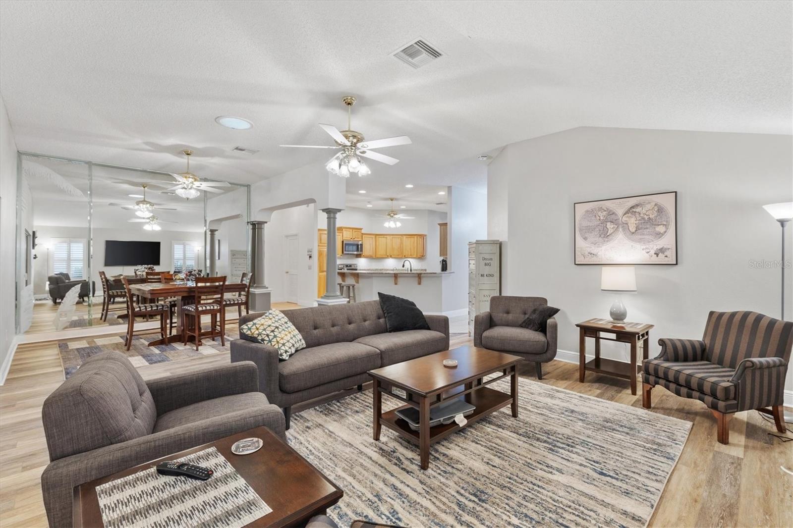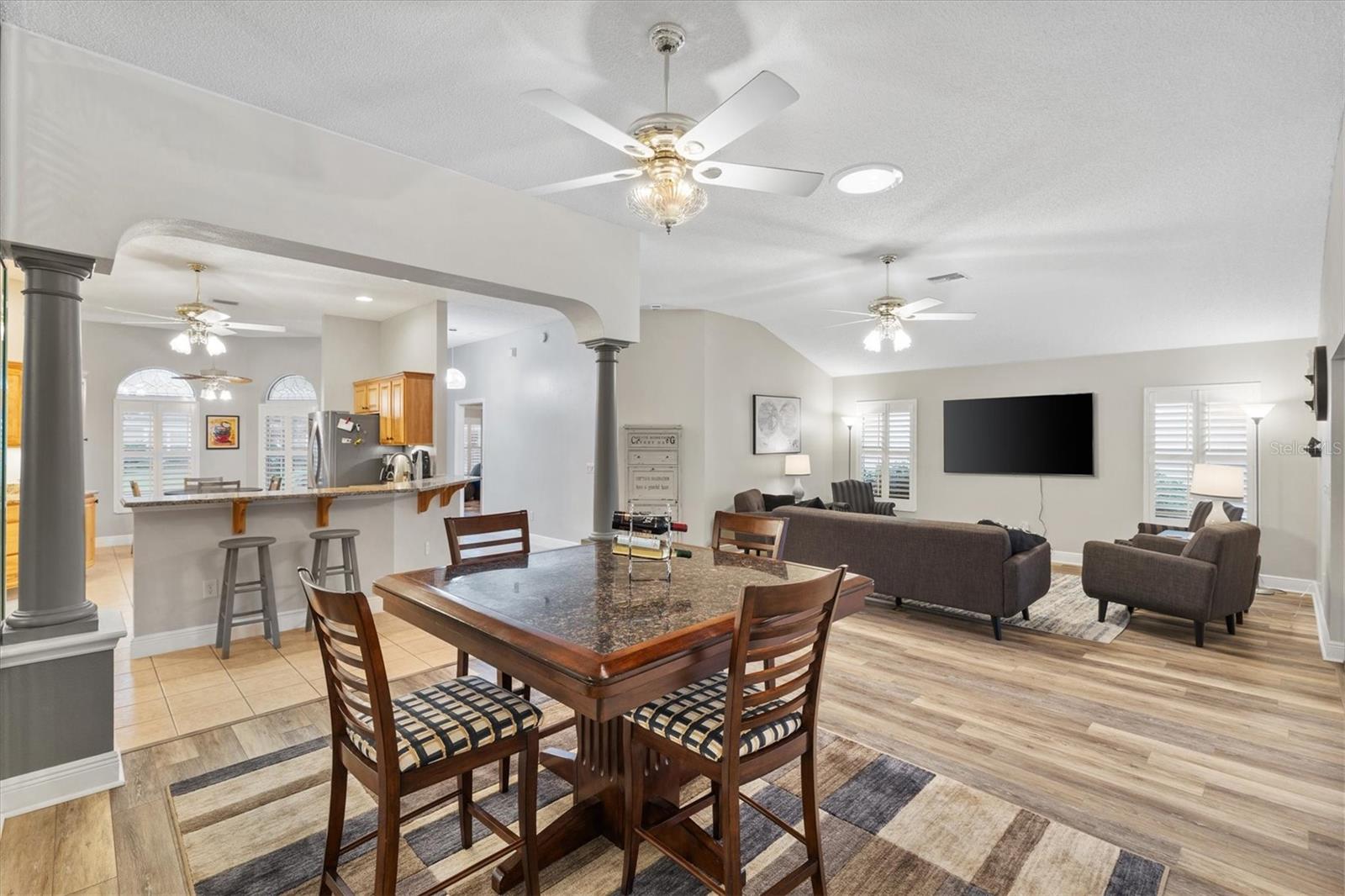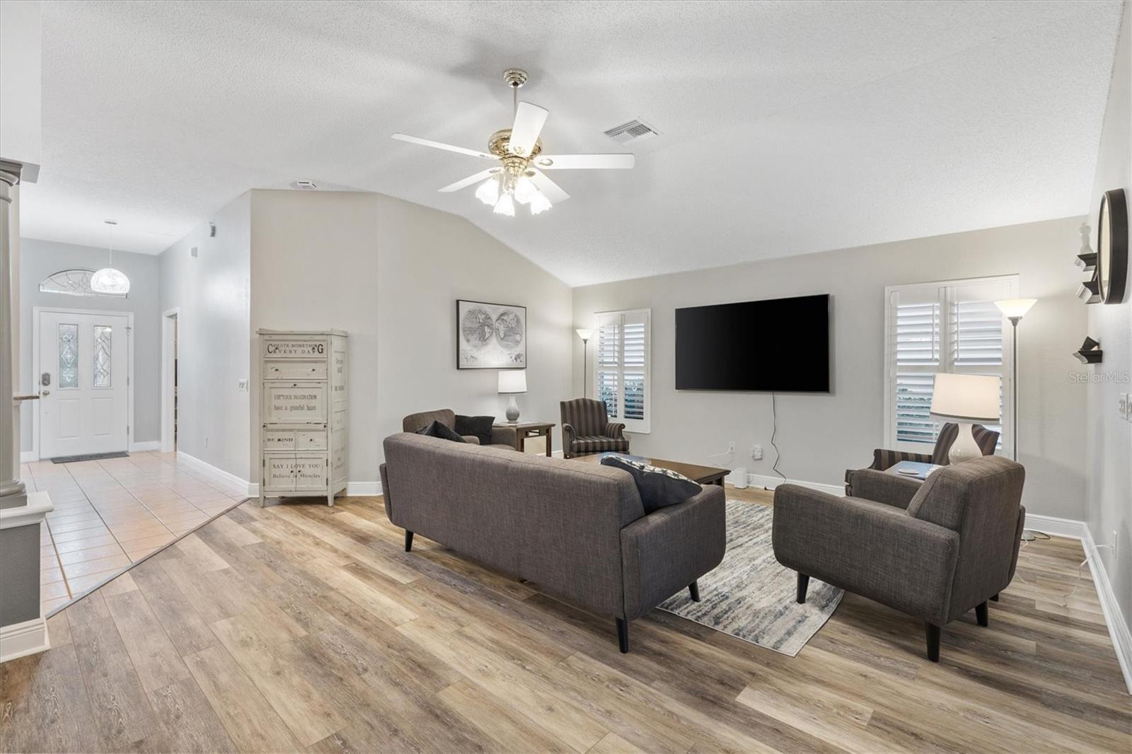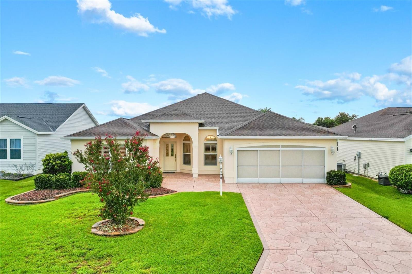 TÍTULO PAGO! TELHADO 2020. Gardênia esticada 3/2 na vila de Bonnybrook. HVAC 2021 HWH 2020. A bela entrada de concreto estampado atende ao seu paisagismo exuberante. Entrada sem chave. Planta aberta e dividida. A cozinha vem equipada com lindos armários Hickory Natural atualizados com iluminação embaixo dos armários, balcões de granito, novos eletrodomésticos em aço inox, dispensador de água filtrada, despensa e armários removíveis e copa. Interior pintado recentemente. Você vai adorar as venezianas, os azulejos e os luxuosos pisos de pranchas de vinil em toda a casa. A metragem quadrada NÃO INCLUI a sala adicional fechada de 392 pés quadrados na Flórida com novas cortinas suspensas e cozinha de verão com churrasqueira a gás, pia e armários para um clima total controlado de 2.517 pés quadrados. De lá há acesso a uma gaiola telada e coberta. A casa possui um trecho de 1,5 metro até o quarto principal para uma enorme suíte master e a garagem foi esticada 60 centímetros à frente e o lado dos hóspedes da casa foi esticado 90 centímetros. Recursos adicionais que você vai adorar são rodapés altos, piso de garagem pintado, escadas do sótão, porta de tela frontal fantasma, banheiro novo no banheiro principal, banheiro de hóspedes atualizado, ventiladores de teto com luzes por toda parte e tubos solares na lavanderia e na sala de estar. Teto abobadado no 3º (quarto da frente que não possui armário) e muito mais. Perto dos campos de golfe executivos Pimlico e Churchill Greens e a poucos minutos do centro da cidade de Sumter Landing. A cama embutida no quarto de hóspedes da frente está incluída. Ligue hoje para agendar sua exibição privada e comece a viver o sonho das Aldeias.