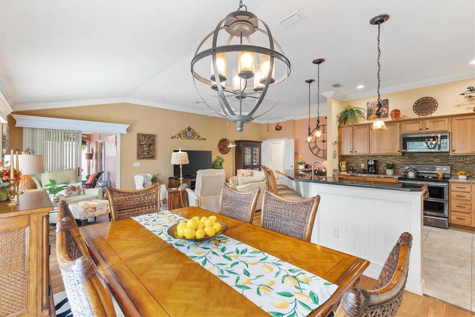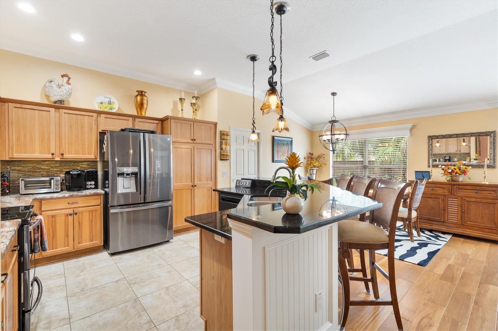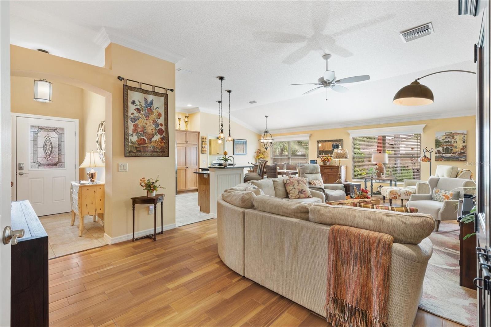 3/2 Vila Arlington na vila de Sanibel. Esta unidade final possui um pátio espaçoso, perfeito para uma banheira de hidromassagem ou piscina. SEM VÍNCULO! Aproveite para visitar os vizinhos em sua varanda coberta e entre pela deslumbrante porta de vitral em uma área de estar aconchegante. A ilha de cozinha com balcão cria um fluxo contínuo nas áreas públicas, ideal para entretenimento. Persianas e cornijas enfeitam as janelas, enquanto o porcelanato realça o piso. Portas deslizantes levam a Lanai fechado e com temperatura controlada, perfeito para diversão durante todo o ano. Beneficie-se de um sistema de ar condicionado mini-split, janelas do chão ao teto e pisos de pedra de rio, além de acesso direto ao quarto principal e ao pátio paisagístico. Um toldo elétrico fornece sombra adicional, tornando o pátio da vila um refúgio perfeito. A cozinha possui eletrodomésticos de aço inoxidável escuro, bancadas de granito, backsplash de azulejos de metrô, iluminação sob os armários, iluminação embutida, despensa e ilha. A barra de café da manhã Granite é expandida 6” em todos os lados. Os quartos de hóspedes são acarpetados, possuem ventiladores de teto, venezianas e compartilham um banheiro com banheira e chuveiro. A suíte Primária possui closet com prateleiras personalizadas e banheiro privativo com pia dupla, armário de roupa de cama e chuveiro com box de vidro. A suíte principal e 1 quarto de hóspedes têm tetos de bandeja. A lavanderia fica convenientemente interna, com pia de lama, armários de armazenamento e uma prateleira suspensa. A Garagem alberga bancada de trabalho, armário de arrumação com prateleiras embutidas, kit de escadas de sótão e espaço para carro e carrinho de golfe. As características adicionais desta casa são: sanca, prateleiras removíveis na cozinha e nos banheiros, tubo solar no banheiro principal, tela elétrica na garagem, porta frontal com tela fantasma e piso de garagem e garagem em epóxi. A apenas 1,6 km do Colony Recreational Center, lojas e restaurantes no Colony Plaza e entre os centros Sumter Landing e Brownwood Town para restaurantes e entretenimento Saboreie a vida com tudo o que The Villages e arredores têm a oferecer. Não deixe de assistir ao nosso tour virtual por esta maravilhosa casa e agende um horário para vê-la hoje mesmo!