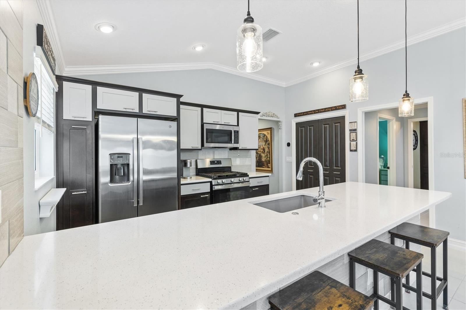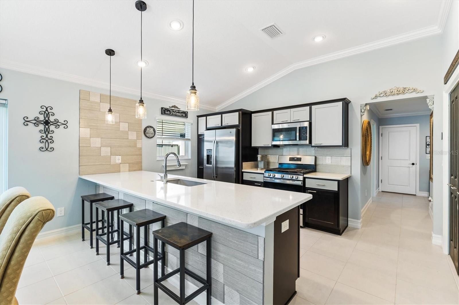 Sem vínculo! Completamente remodelado Belo Charlotte Bungalow Villa! Esta encantadora casa 3/2 está situada na vila de Deluna. Esta residência convidativa possui uma planta aberta brilhante, adornada com piso de ladrilho e tetos abobadados, conectando perfeitamente as áreas de estar a um lanai selecionado, pátio cercado e pátio privado através de portas deslizantes. Completo com pisos de ladrilhos, persianas e escurecimento da sala puxam tons para baixo nas portas deslizantes, molduras de coroa e molduras de rodapé e persianas externas. A cozinha bem equipada é o sonho de um chef, equipado com utensílios de aço inoxidável, uma faixa de gás, prateleiras e bancadas elegantes de quartzo. Aproveite a conveniência de uma barra de café da manhã e um armário de despensa, complementado por uma pia composta de granito profunda extra e uma torneira atualizada. A suíte master oferece um refúgio luxuoso com um closet com prateleiras personalizadas e um banho de banheiro privativo, com dupla vaidade, um chuveiro romano com vidro. E armário de água privado com bidê de luxo. O quarto de hóspedes, localizado na frente da casa, serve como um espaço ideal para um escritório ou sala de estar. O segundo quarto de hóspedes, acessível através de uma porta de bolso para obter uma privacidade aprimorada, complementa o banheiro de hóspedes com uma combinação de barra de banheira e um bidê de luxo. Além disso, a lavanderia está equipada com uma pia de lama e armários extras profundos, fornecendo armazenamento e funcionalidade. Recursos adicionais que tornam esta casa especiais são o amaciador de água Pegasus e o sistema de filtração, tubos solares na lavanderia e banheiro de hóspedes, portas isoladas de garagem, isolamento adicional do sótão escada no sótão do sótão, o sistema de sino de portas de anel, atingências completas de chuva, ventiladores de teto atualizados. Móveis negociáveis separadamente! O Del Luna Recreation Center e a Postal Station estão a apenas 0,4 km de distância e você estará apenas 5 minutos para o Finney Recreation Center e as trilhas. Fácil acesso a todas as aldeias tem a fornecer! Certifique -se de assistir ao nosso vídeo desta excelente casa. Ligue hoje para agendar sua exibição particular e começar a viver o sonho das aldeias.