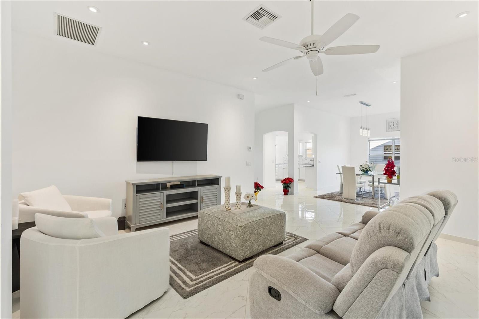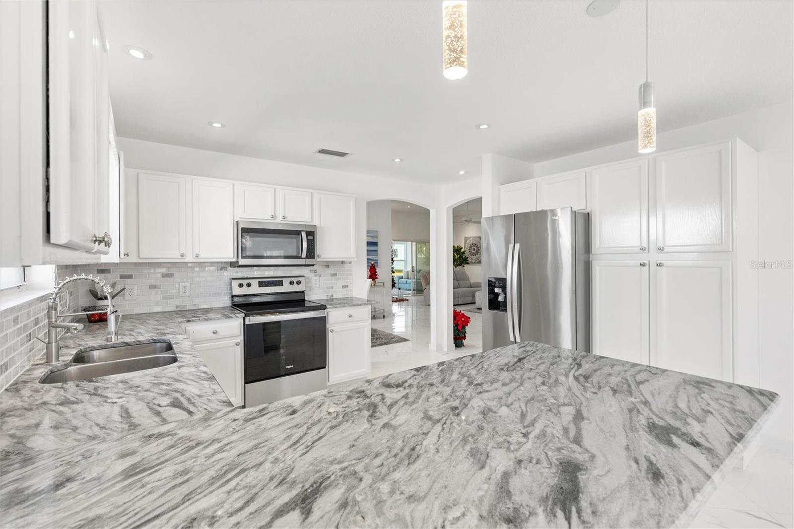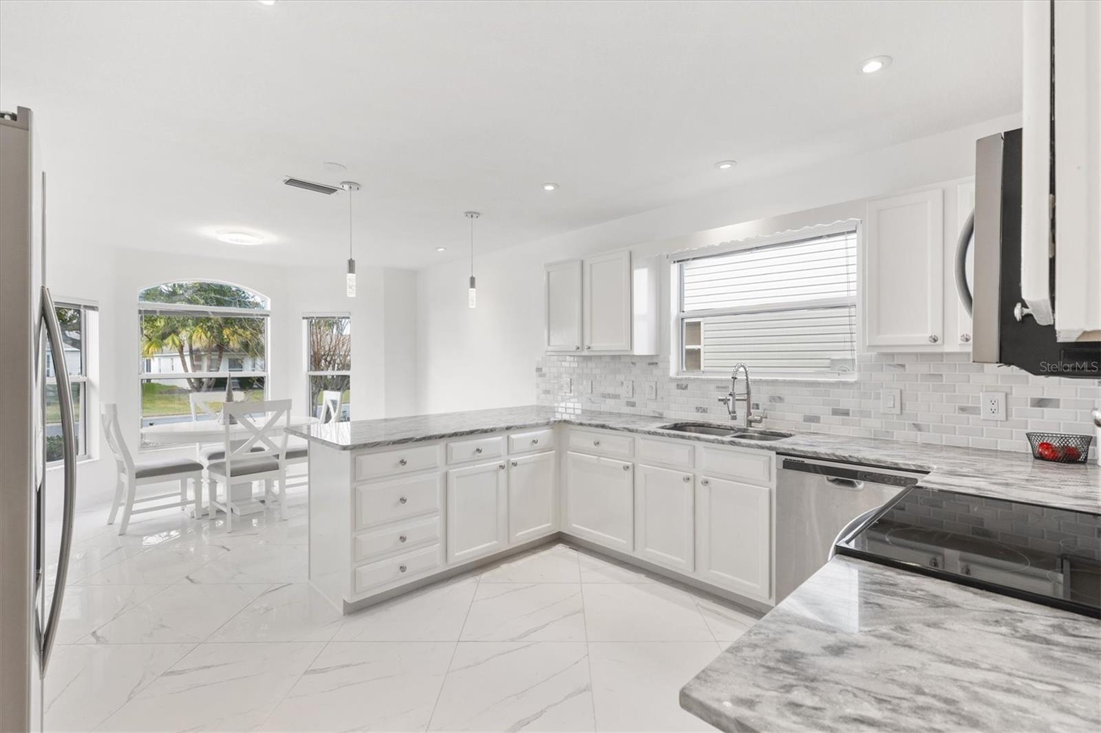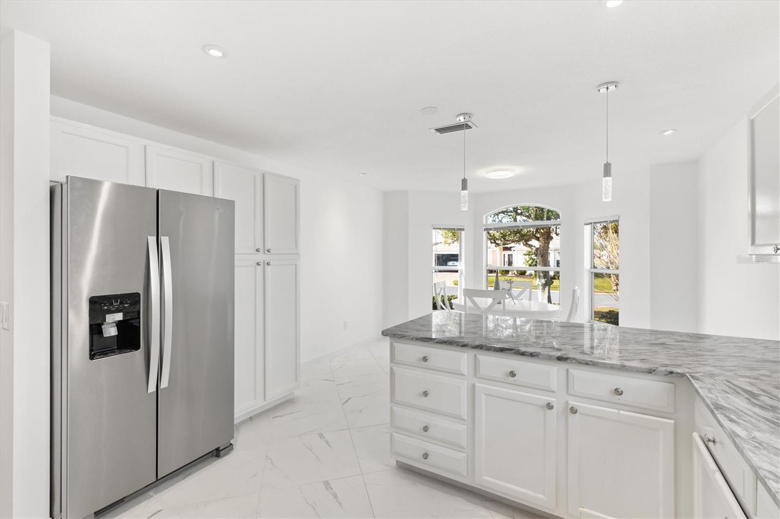 Este modelo Vera Cruz de 1.908 pés quadrados completamente remodelado com 3 quartos e 2 banheiros é IMPERDÍVEL! Esta casa foi atualizada de cima a baixo sem nada ser poupado. Abrir a porta da frente é como entrar no céu com o piso de porcelanato grande e luxuoso instalado em ângulo em toda a casa - sem carpete. Paredes, acabamentos e armários em tons de nuvem em cada esquina. A moderna iluminação LED embutida adiciona ambiente a todos os ambientes com dimmers que podem ser ajustados para combinar com o clima. A cozinha possui eletrodomésticos mais novos de aço inoxidável e bancadas de granito com muito espaço para uma mesa de jantar com vista para as janelas salientes. As áreas de estar e jantar oferecem amplo espaço para entretenimento e relaxamento. O grande quarto principal e o banheiro privativo oferecem o refúgio perfeito com armários flutuantes, um chuveiro de luxo personalizado com um verdadeiro chuveiro de floresta tropical, varinha de mão e um painel de chuveiro de 6 jatos. O quarto principal possui dois closets com bastante espaço para roupas e armazenamento adicional. O Vera Cruz é uma planta dividida. No lado oposto da casa há dois quartos espaçosos e um banheiro de hóspedes que também possui uma penteadeira flutuante e um luxuoso chuveiro personalizado. Mas espere, tem mais! A sala Florida de 13 'x 10' acabada, ao lado da sala de estar, é um lugar perfeito para um escritório, sala de artesanato ou uma sala adicional para entretenimento de TV. A casa está localizada a menos de 800 metros do Tierra del Sol Country Club - com centro recreativo, quadras de tênis, piscina, pistas de bocha e estúdio de teatro. Esta localização central é o coração de The Villages - você desfrutará de viajar menos de 10 minutos de carrinho de golfe até Sumter Landing e Spanish Springs Town Squares, além de muitas lojas e restaurantes nas proximidades. O título está pago. O HVAC e o aquecedor de água foram substituídos em 2022, e o telhado foi substituído em 2016. Entre em contato e agende hoje mesmo seu tour privado por esta casa lindamente remodelada!