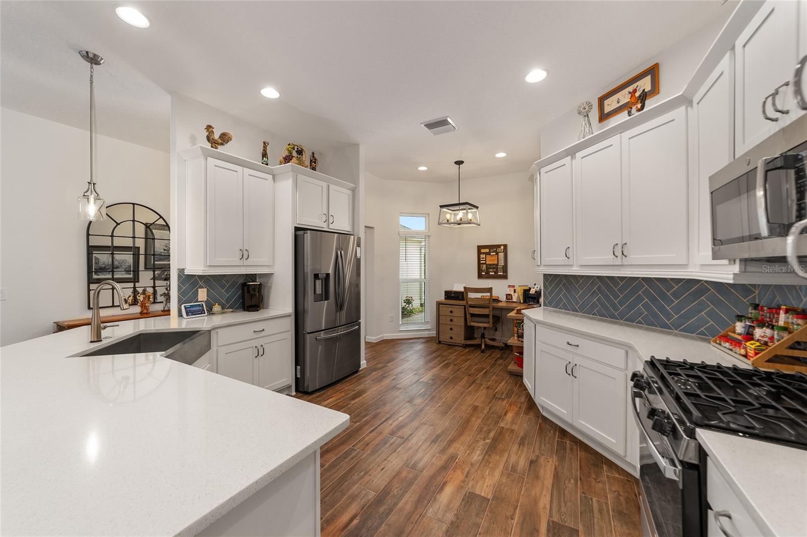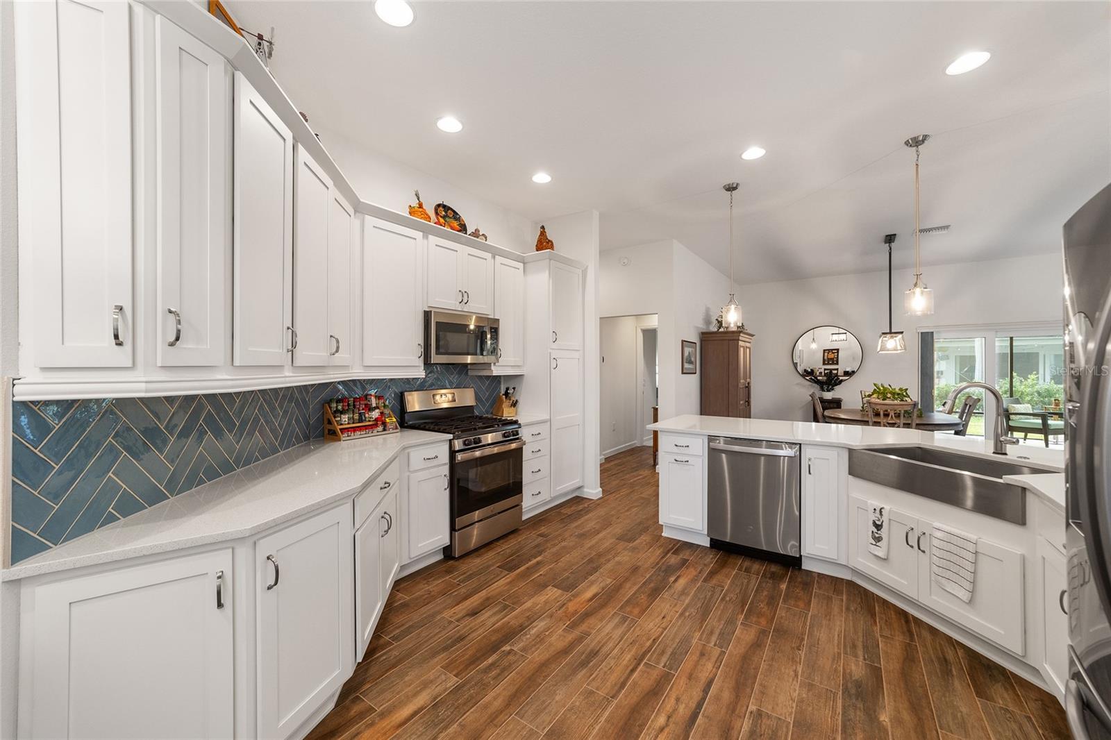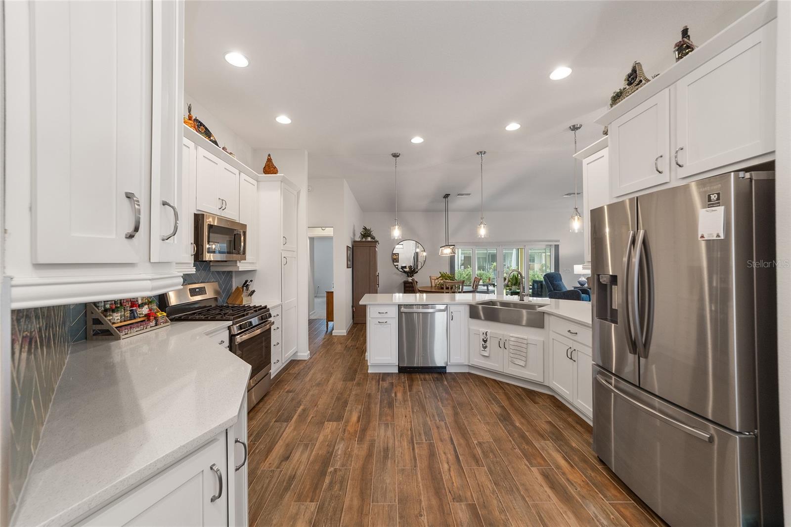 Novo preço !!! Bem-vindo para casa nesta impressionante begônia expandida de 3 banheiros de 3 quartos, localizada na vila de Hammock em Fenney! O exterior paisagístico profissionalmente apresenta camas de pedra e palmeiras com enquadramento de pedra, criando um impressionante apelo ao meio-fio, levando você à linda entrada de porta de vidro com chumbo, onde pisos de ladrilhos de cerâmica deslumbrantes fluem através da cozinha, sala de estar, sala de jantar e banheiros. A espaçosa cozinha oferece muitos armários brancos, bancadas de quartzo, backsplash de ladrilhos de metrô, utensílios de aço inoxidável, incluindo um fogão a gás e renovado recanto da cozinha. As áreas de jantar e de estar são espaçosas e centralmente localizadas, com portas de vidro deslizantes de bolso que levam ao lanai exibido, perfeito para relaxar e divertir. O quarto principal é um verdadeiro retiro, com tetos de bandeja, dois armários e um luxuoso banheiro privativo, com vaidades duplas separadas, chuveiro romano com assento e banheiro dedicado. Os hóspedes se sentirão em casa nos 2 quartos adicionais que incluem uma porta de bolso para maior privacidade, enquanto o banheiro completo adjacente apresenta uma combinação de chuveiro. Para maior conveniência e adjacente à cozinha, há uma lavanderia interna com pia e armários superiores para armazenamento extra. Você vai adorar todo o espaço na garagem do carrinho de 2 carros+ golfe! Outras características incluem iluminação pendente, gavetas e armários de fechamento suaves, calçadas pintadas e tratamentos de janela de Douglas Hunter Douglas. A decoração nesta casa é linda e perfeita para você começar seus sonhos de aldeias! Programe sua exibição particular hoje.