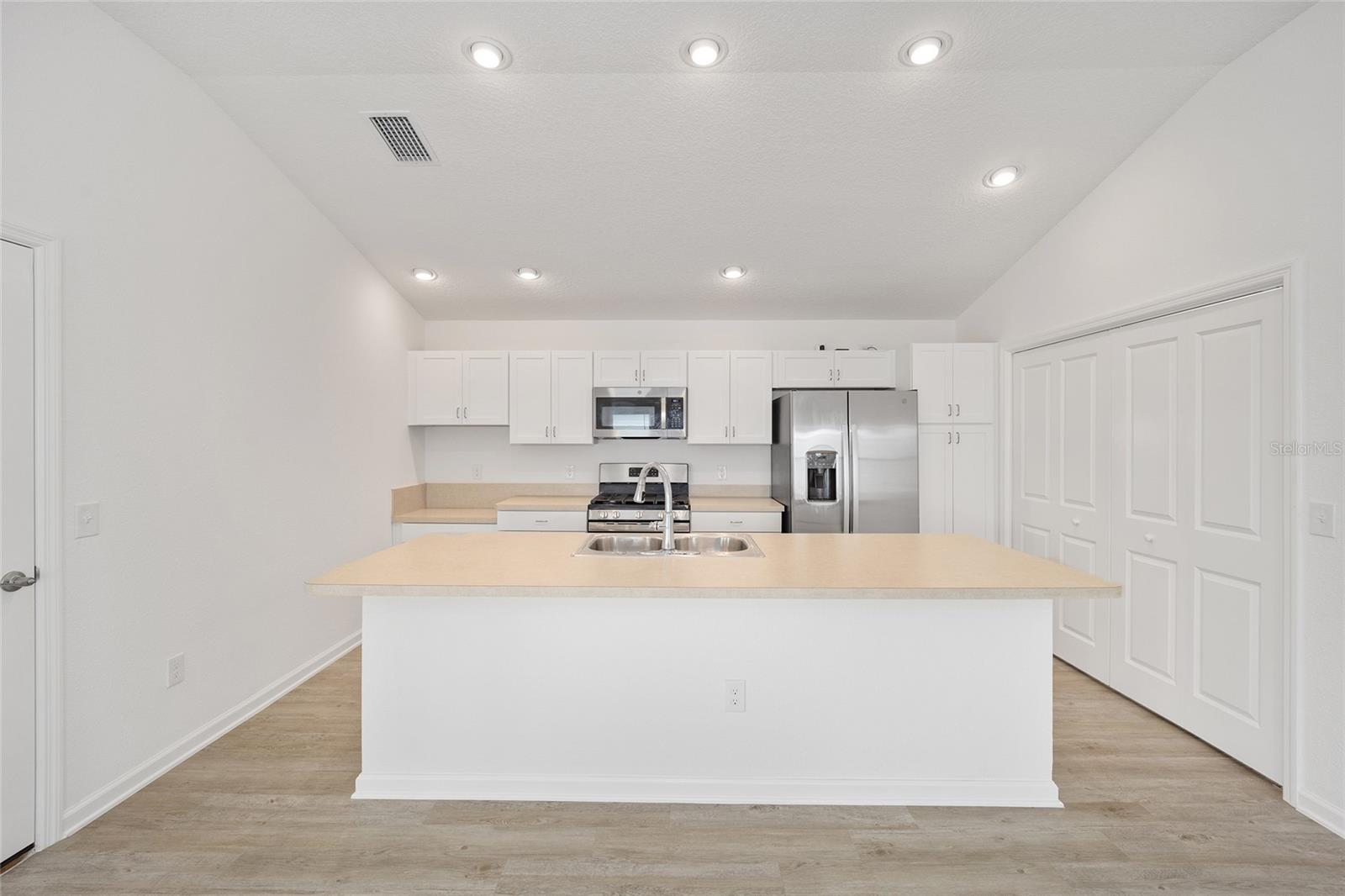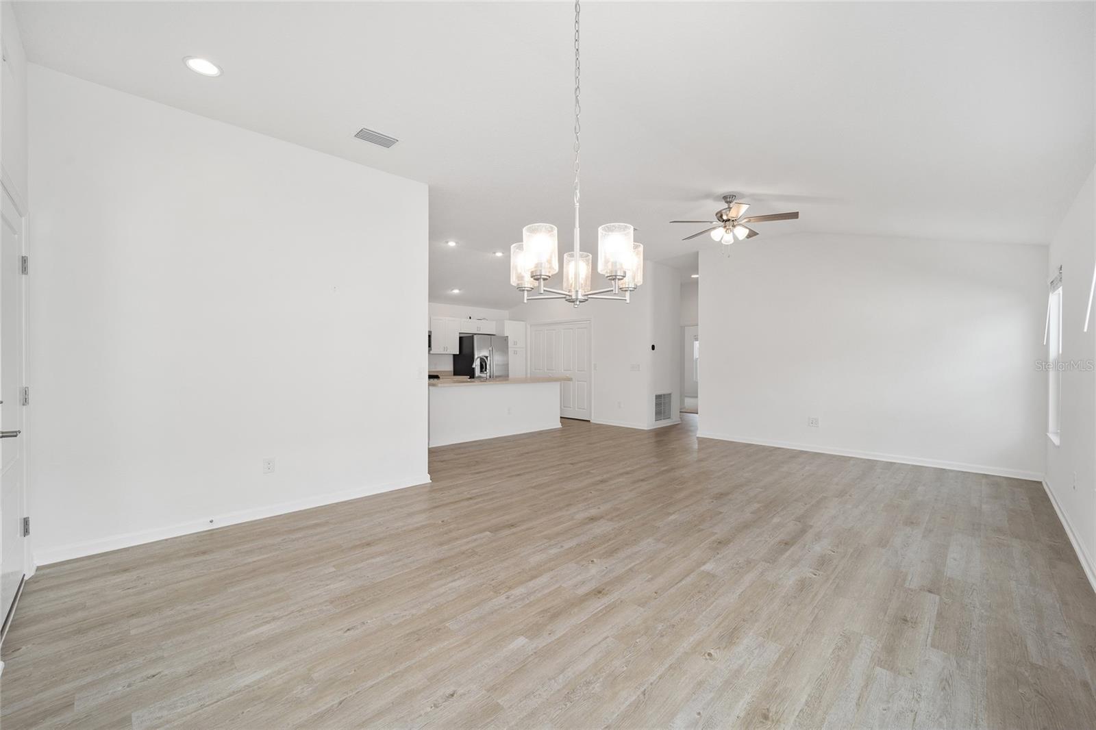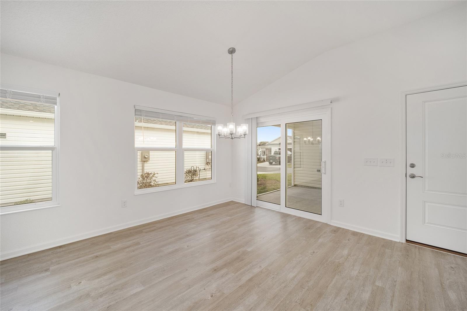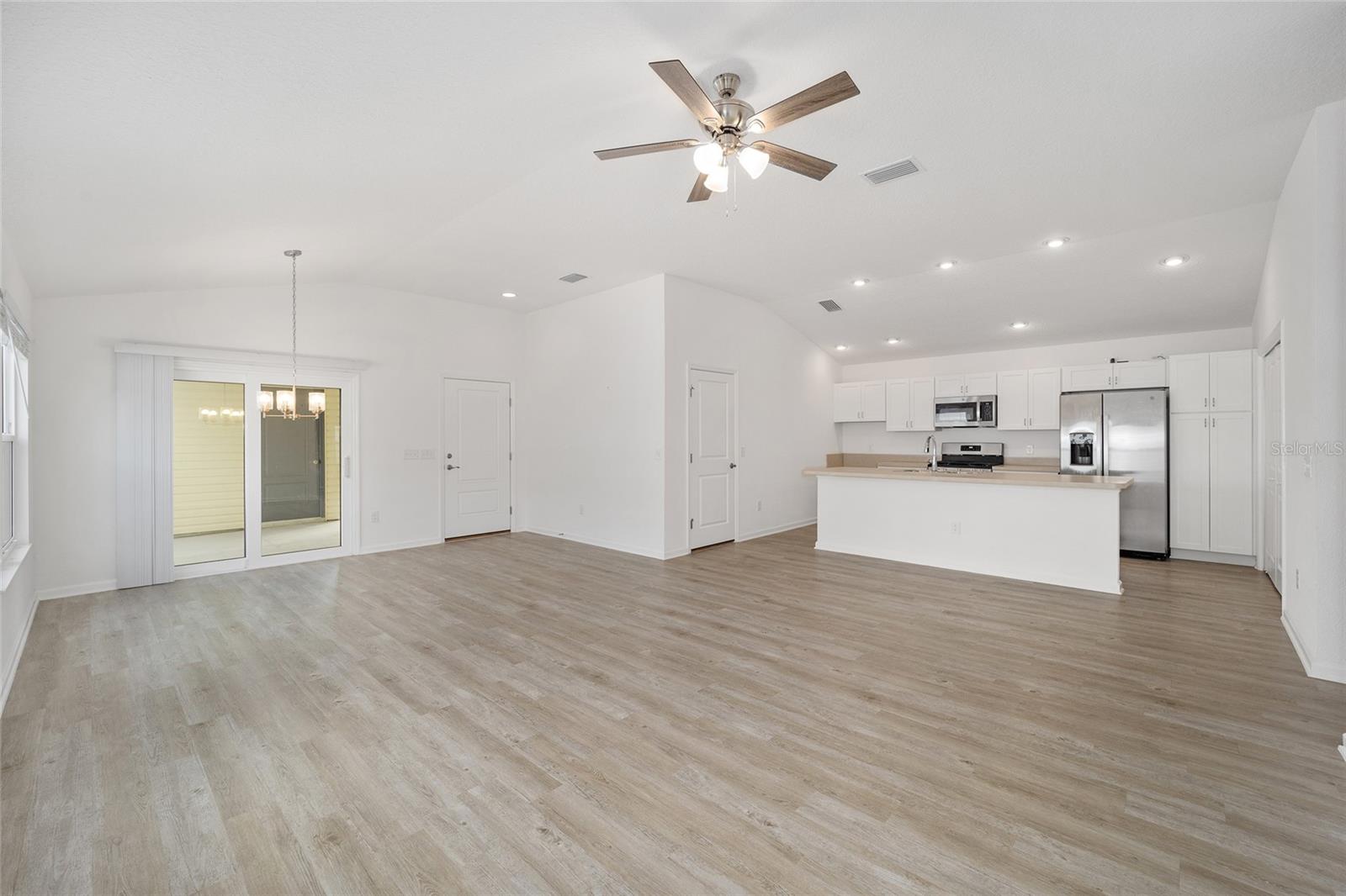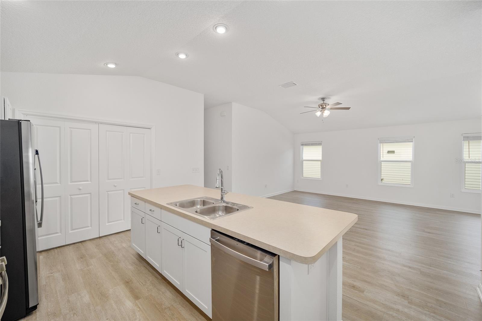 A vila de Lake Denham - Annison Villas - Emerald Patio Villa construída em 2023 - a poucos minutos do carrinho de golfe para Sawgrass Grove ® Entertainment Complex & Market, com instalações de recreação e campos de golfe próximos !! Um parque de cães e as almofadas de visualização de astronomia do Allingrages® estão próximas no Homestead Recreation Center, também são o Franklin Recreation Center e o Mickylee Pitch & Putt! -2 quartos, 2 banheiros, lanai coberto de tela, pátio lateral, garagem para um carro e uma garagem para carrinho de golfe separada de carga lateral !! - Casa a gás, aquecedor de água sem tanque, sistema de irrigação, casa pronta de fibra óptica, persianas nas janelas, piso de vinil de luxo nas principais áreas de estar e carpete (fevereiro de 2025, limpo profissionalmente) nos quartos! -O espaçoso quarto primário possui um teto abobadado com um banheiro privativo, grande closet com prateleiras extras, chuveiro passo a passo, privado privado, vaidade alta e duas pias-o quarto de hóspedes tem um interno embutido Armário. Banheiro de hóspedes do Hall também com uma vaidade alta, pia única, combinação de banheira/chuveiro com chuveiro de chuva. -A cozinha possui armários brancos de estilo shaker com puxadores e gavetas de maconha, há uma grande ilha com saliência de café da manhã, área de mesa embutida, despensa de armário, aparelhos de aço inoxidável, gama de gás e armário de lavanderia (lavadora Samsung & Secador a gás) - Esta planta baixa facilita o entretenimento! O Lanai exibido está fora da sala de jantar e tem duas portas de saída, além de porta de entrada para a garagem do carrinho de golfe de carga lateral, o que lhe dá privacidade para apreciar o clima da Flórida. Não perca esta jóia nas aldeias, FL!