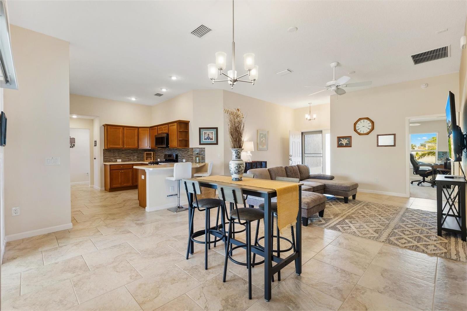 A impressionante casa de designer de tamarindo 3/2 com piscina de água salgada na vila de Monarch Grove, a poucos minutos, para os centros da Central de Sawgrass e Eastport. Desfrute do impressionante apelo do meio -fio com paisagismo de rochas aprimoradas e uma entrada de carros de concreto estampado. Aninhado em um beco sem saída sereno, a planta aberta e dividida oferece uma espaçosa área de estar e jantar que se conecta perfeitamente a um lanchonete expandido, perfeito para entretenimento ao ar livre. O Lanai é um verdadeiro destaque, com uma tela de privacidade, piso de pedra pavimentada e uma piscina personalizada que é totalmente fechada na tela. A cozinha possui um fogão a gás de 5 queimador, utensílios de aço inoxidável, prateleiras de pega, backsplash de telha de vidro elegante, barra de café da manhã e janela com vista para o lanai. Retire-se para a suíte master, completa com um teto de bandeja, iluminação embutida personalizada com dimmer e um banho de banheiro com duplas, um chuveiro e um generoso closet. Os dois quartos de hóspedes, cuidadosamente posicionados na frente da casa, apresentam uma expansão de dois metros de frente e compartilham um banho bem equipado com uma combinação de barra de banheira, oferecendo espaço confortável para a família ou os visitantes. A garagem é igualmente impressionante, com uma expansão de dois pés de frente, entrada sem chave, piso epóxi para facilitar a manutenção e as escadas puxadas no sótão. Esta casa é aprimorada ainda mais por uma lavanderia interior com pia e armário de utilidade, utilitários de gás natural, um aquecedor de água quente sem tanque e prontidão para casa inteligente, tornando -a uma mistura perfeita de luxo e conveniência. E você será apenas um carro de golfe de 5 minutos até os centros de recreação Riverbend e Everglades. Certifique -se de assistir ao nosso vídeo desta casa e agendar sua exibição para que você possa começar a viver o sonho das aldeias. Móveis disponíveis separadamente.