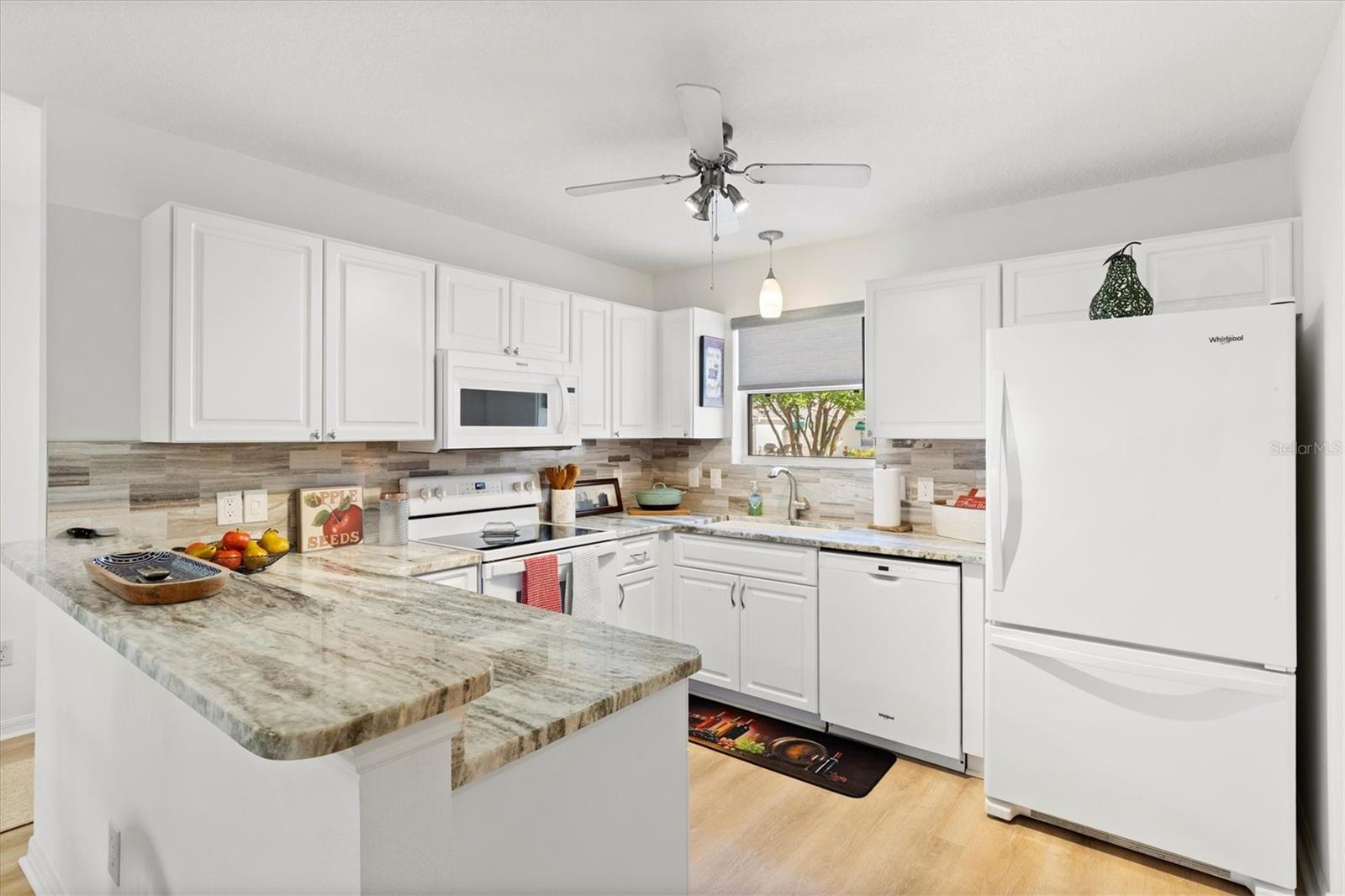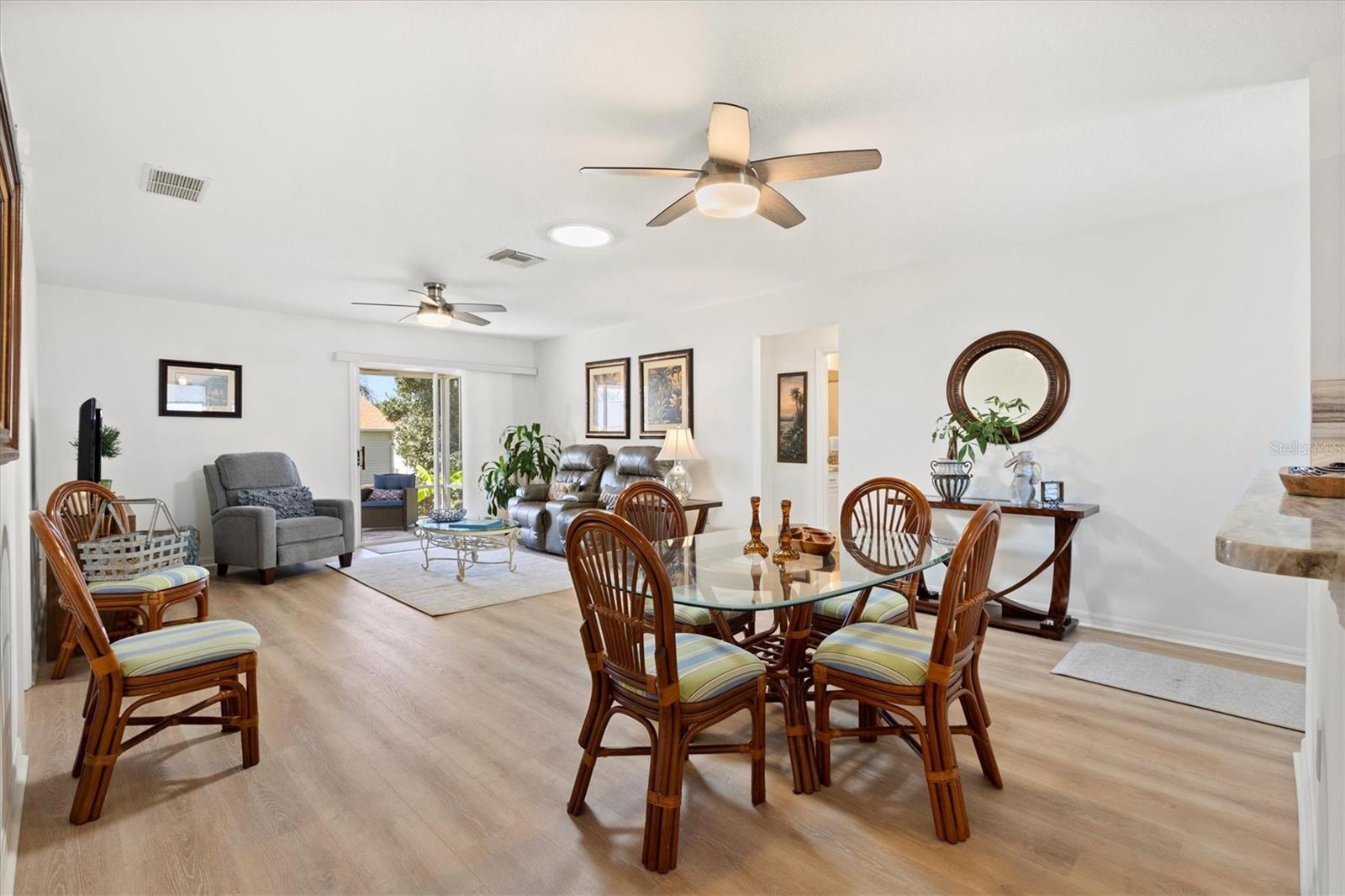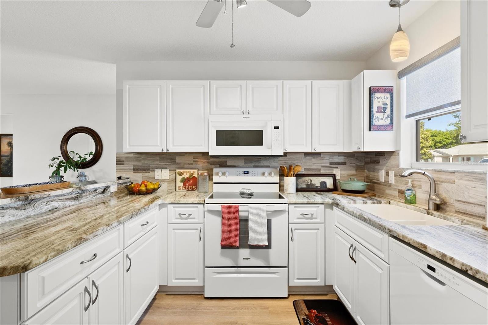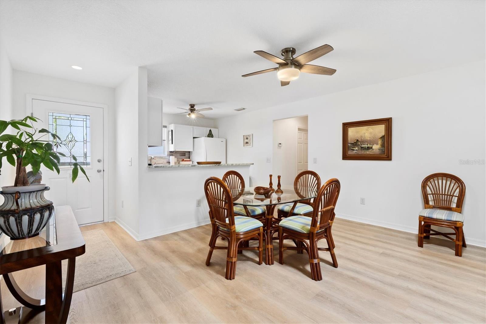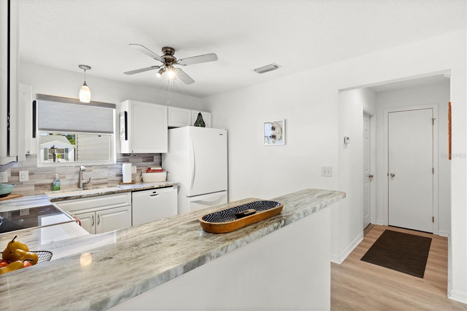 Casa modelo de corpus Christi, com 3 quartos, com 3 quartos, na vila de Woodbury, com belos pisos laminados com aparência de madeira que fluem perfeitamente por toda parte, criando uma atmosfera quente e convidativa. A planta de piso aberta e dividida é perfeita para a vida divertida e cotidiana. A cozinha está equipada com bancadas elegantes de granito, muito armazenamento e prateleiras convenientes, complementadas por uma barra de café da manhã que incentiva refeições casuais. O quarto principal é um verdadeiro retiro, completo com um banheiro privativo, com um chuveiro atualizado com um banco e um generoso closet. Dois quartos de hóspedes compartilham um banheiro bem equipado com uma combinação de chuveiro, um dos quartos não tem um armário. O telhado tem 7 anos de idade, a garagem possui uma porta rastreada que permite a privacidade com a porta da garagem aberta. Aprecie o ar livre sereno com portas deslizantes, levando a um lanai selecionado e, a um passo de um pátio de grelhados, perfeito para churrascos de fim de semana. Destaques adicionais incluem ventiladores de teto com kits leves para maior conforto, tons de todas as janelas para privacidade, um tubo solar adicionando brilho à área de estar e uma garagem de um carro com espaço para um carrinho de golfe, juntamente com instalações de lavanderia convenientemente localizadas na garagem. Os móveis são opcionais, permitindo que você personalize seu novo espaço para o seu gosto. Perto do Springdale Recreation Center and Pool, do Mulberry Regional Rec Center e dos campos de golfe. Mulberry Grove Plaza Shopping Center para atividades, restaurantes e compras estão a poucos minutos. Ligue hoje para agendar sua exibição particular e começar a viver o sonho das aldeias.