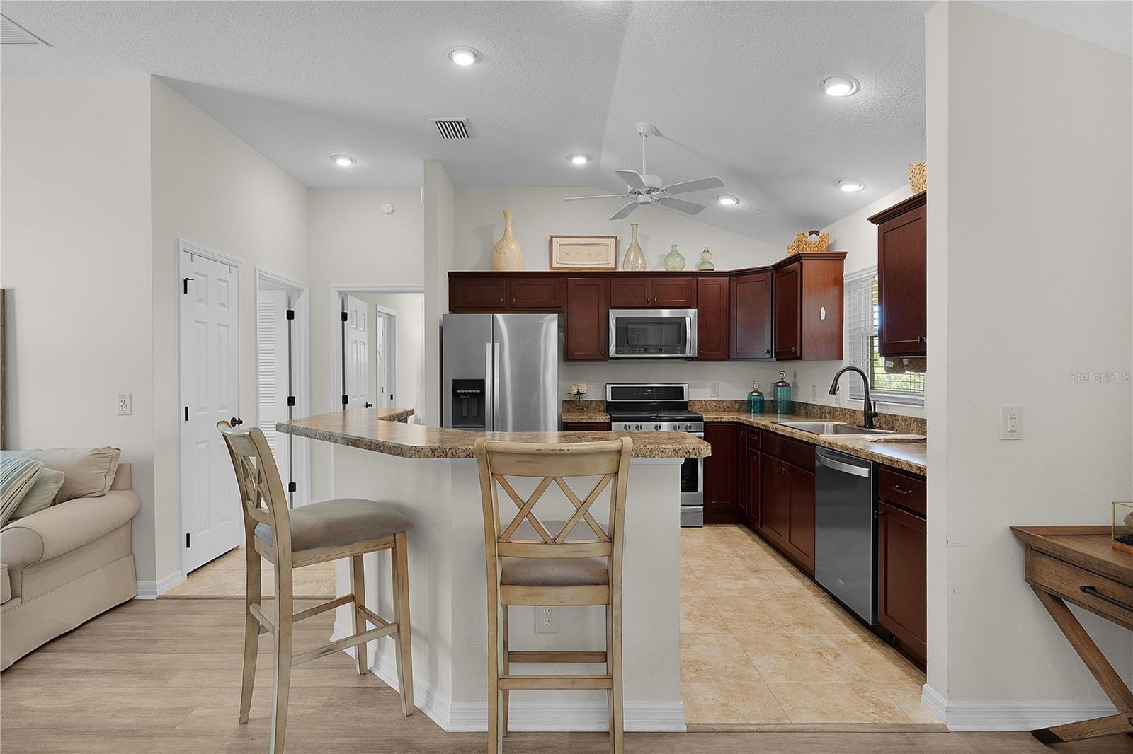 Mova -se direto e comece a desfrutar do estilo de vida das aldeias imediatamente! Preço fabuloso nesta bela casa de designers de bloco/estuque de 3/2, com uma sala ensolarada da Flórida ... e está pronto para a ocupação imediata. Recebendo a chave na chave com móveis de qualidade, você deseja tornar esta casa maravilhosa a sua. À medida que você se aproxima, você será recebido com atraente apelo de meio -fio e uma acolhedora varanda da frente coberta de norte - muito acolhedora! No interior, você se sentirá imediatamente em casa com uma espaçosa área de estar com tetos de knockdown abobadados e tapas de vinil de luxo na área de estar principal, quarto da Flórida e quarto de hóspedes. Você vai adorar o conceito aberto deste modelo muito popular que possui 3 quartos (armários no total), 2 banheiros espaçosos, quarto da Flórida, lavanderia dentro de armários extras e uma garagem de 2 carros de grandes dimensões. Ideal para entretenimento, a cozinha aberta oferece aparelhos inoxidáveis com uma linha de gás natural, muitos armários com prateleiras, uma despensa de armário, ventilador de teto e a barra de café da manhã contribui para um maravilhoso local de encontro. A convidativa Sala da Flórida leva ao lanai coberto e rastreado para o sul, para apreciar o ar fresco sem os elementos, e o hedge estrategicamente colocado oferece um pouco de privacidade. O pátio ao ar livre é um local perfeito para grelhar. A grande suíte primária possui um banho de suíte com pias duplas, 2 armários, chuveiro de barraca de azulejos personalizados, ventilador de teto e vaso de privacidade. Você e seus convidados apreciarão a privacidade oferecida por uma porta de bolso para os 2 quartos de hóspedes e um banheiro completo que oferece uma banheira de imersão/chuveiro profunda! As características adicionais incluem um sistema de filtragem de água da Nova House Nova, aquecedor de água a gás sem tanque, calhas, persianas, tratamentos de janelas, banheira de utilidade e o armário de armazenamento extra na garagem serão apreciados. Convenientemente localizado na vila de Fenney, você pode acessar facilmente todas as suas atividades favoritas pelo carrinho de golfe -campos de golfe, piscinas, centros de recreação, refeições, compras, serviços médicos e muito, muito mais! Certifique -se de assistir à turnê de vídeo! A linha de impostos reflete os impostos sobre a propriedade e a linha do CDD inclui o título, a manutenção e o distrito de bombeiros. Balanço de títulos: US $ 21.225,36. Então ... o que você está esperando? Se não agora, quando? Ligue para reservar sua exibição particular hoje antes que seja tarde demais!