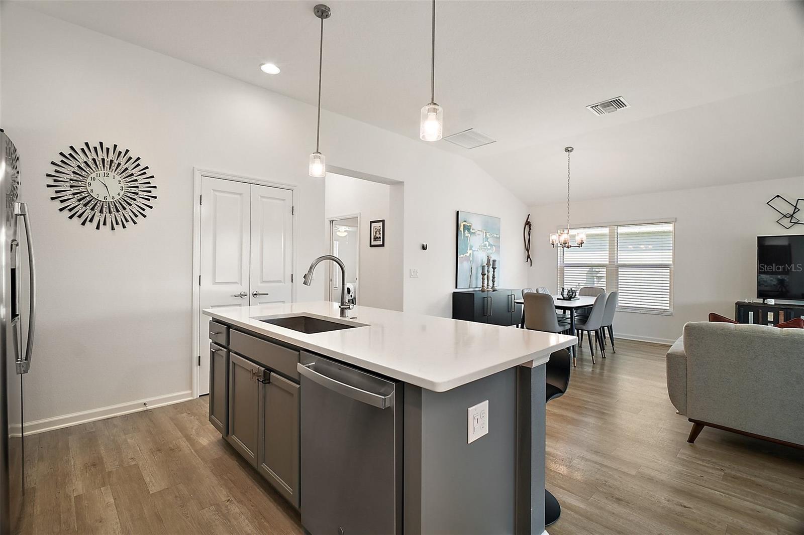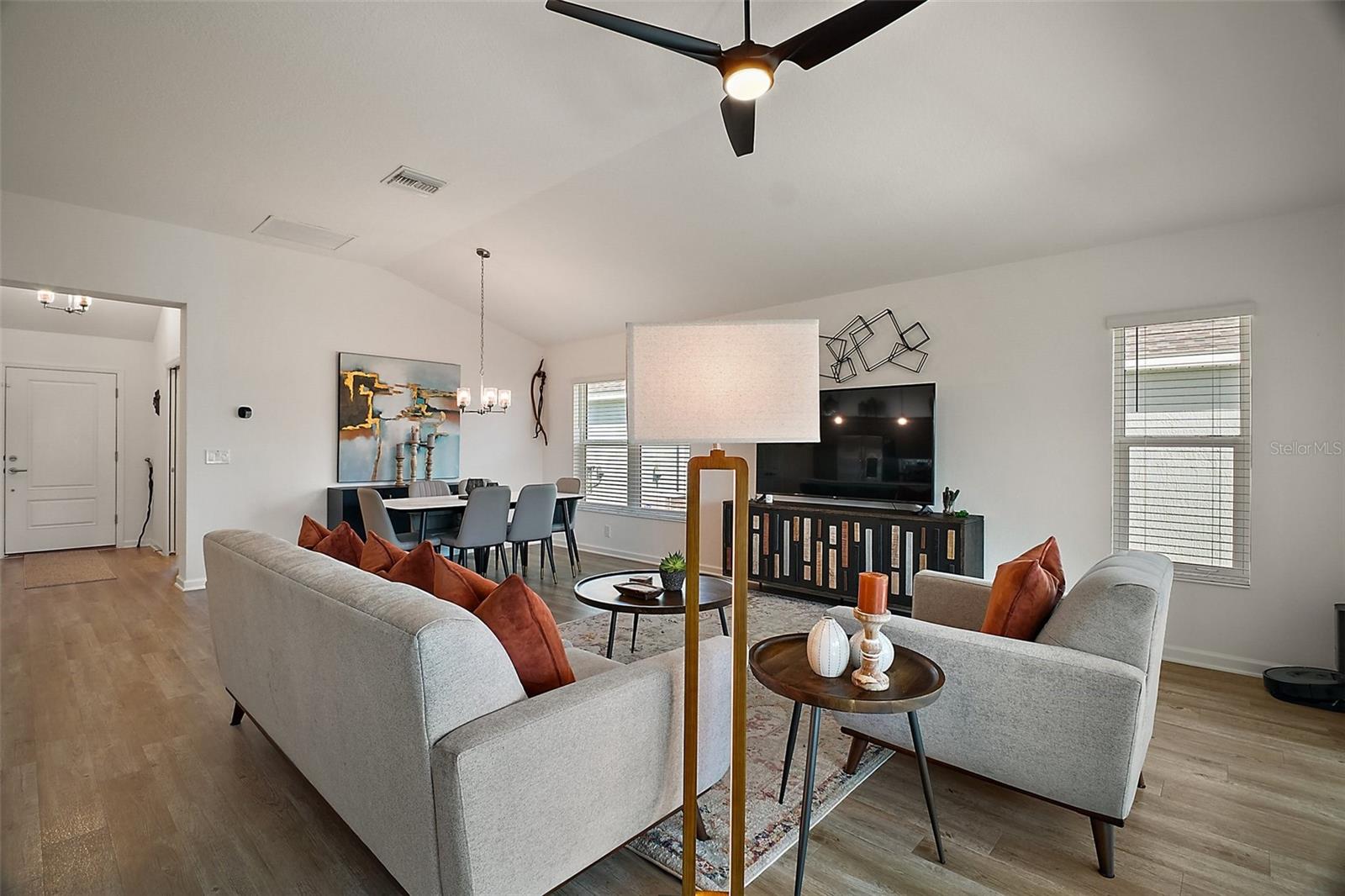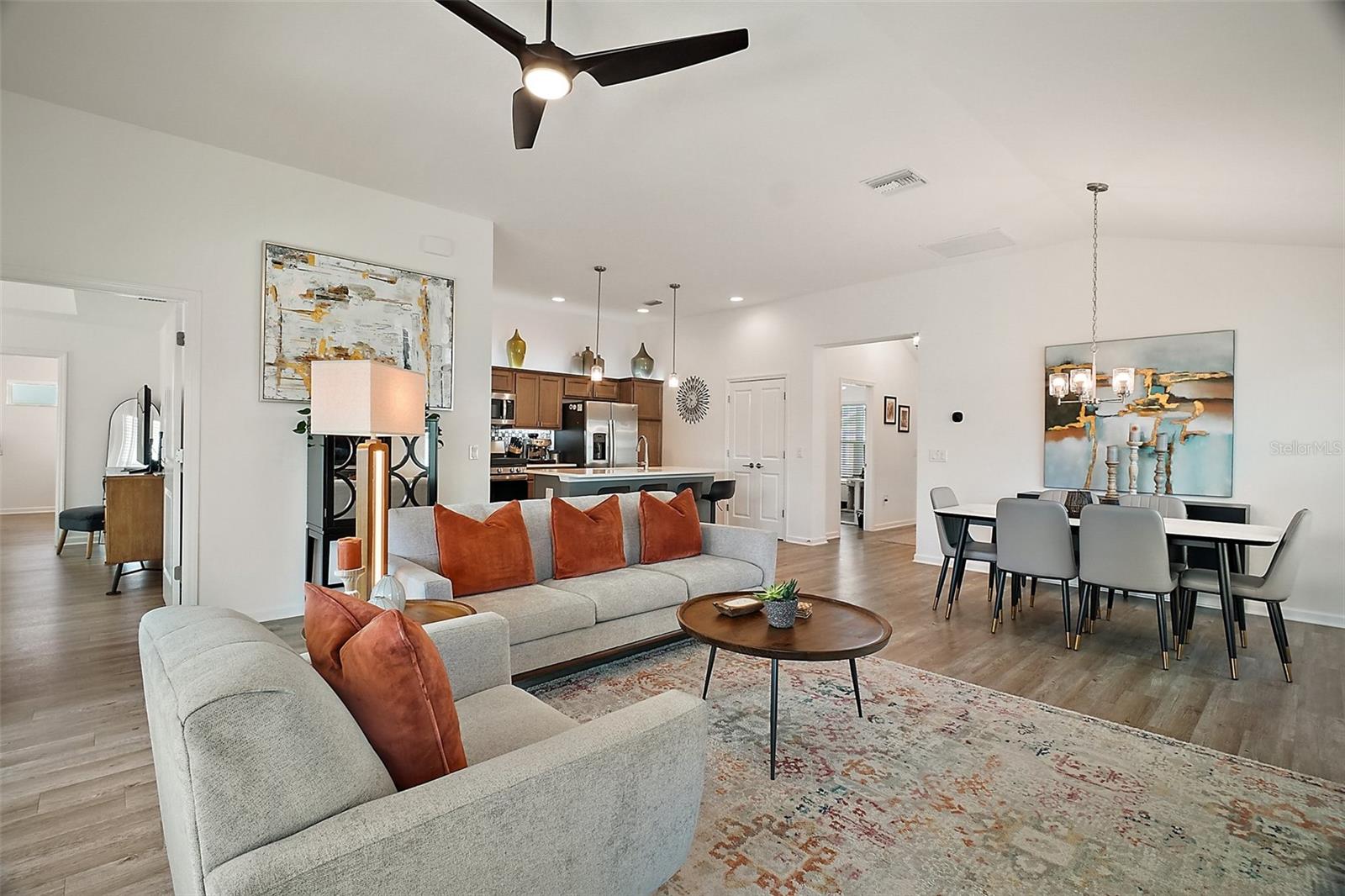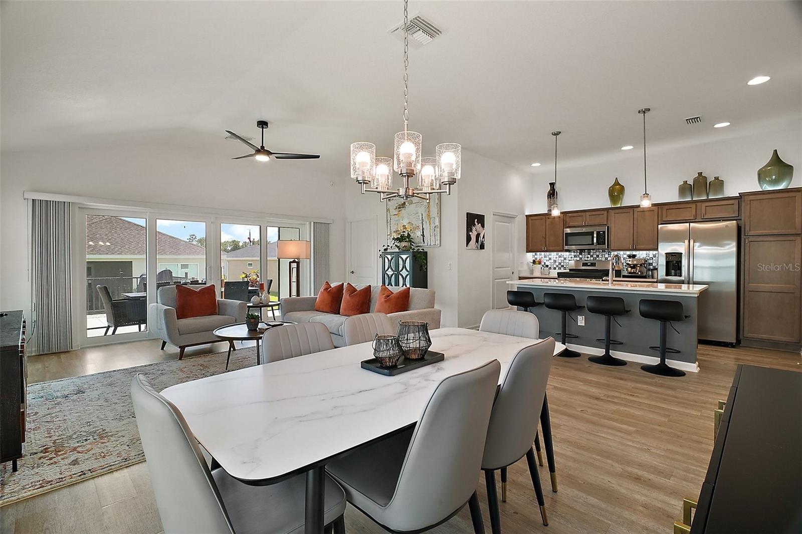 Bem -vindo a esta impressionante casa de modelos de gaivota de 2023, localizada na desejável vila de Denham. Desde o momento em que você chega, você apreciará o apelo do meio-fio, destacado por uma entrada de calçada de concreto estampada de 40 pés e paisagismo lindamente bem cuidado que define o tom da qualidade em toda a casa. Entre em um piso plano aberto e brilhante, com pisos de vinil de luxo por toda parte - nenhum tapete à vista. Os tetos são finalizados com textura knockdown para uma aparência limpa e moderna. A cozinha espaçosa foi projetada para impressionar, oferecendo bancadas de quartzo, utensílios de aço inoxidável, um backsplash de ladrilhos, iluminação atualizada e um fluxo contínuo na área de jantar, com tetos altos. A sala de estar é igualmente convidativa, com um ventilador de teto atualizado e fácil acesso à Lanai exibida - perfeita para relaxar ou divertir. A suíte primária oferece conforto e função, com dois armários walk-in, um teto de bandeja, um ventilador de teto e um banho de suíte em forma de spa com chuveiro de azulejos, pias duplas e bancadas de quartzo. Os quartos de hóspedes têm armários embutidos e são finalizados com pisos de vinil de luxo, enquanto o banho de hóspedes inclui uma combinação de banheira/chuveiro com balcões de granito. Esta casa também oferece uma lavanderia dedicada com lavadora e secadora de ponta, e uma garagem de dois carros terminada com piso de epóxi. Instalações próximas, como o Ezell Recreation Center, oferecem piscinas, quadras esportivas, aulas de fitness e clubes sociais. As aldeias, Flórida