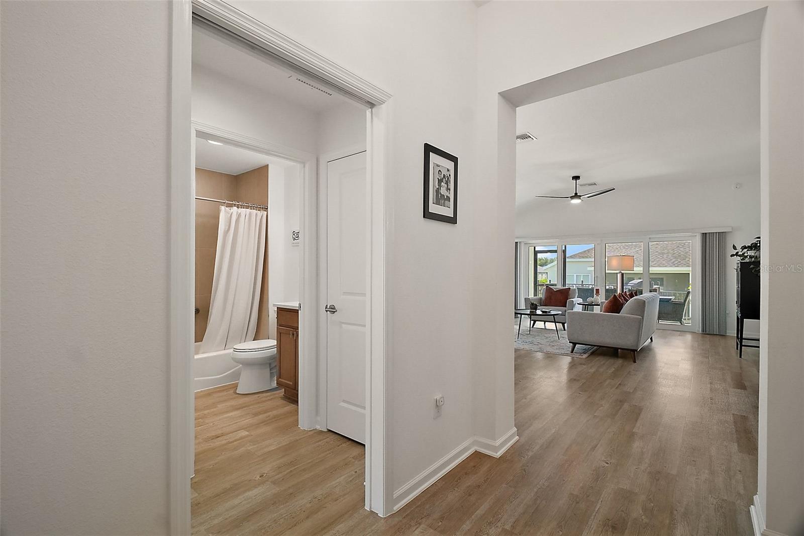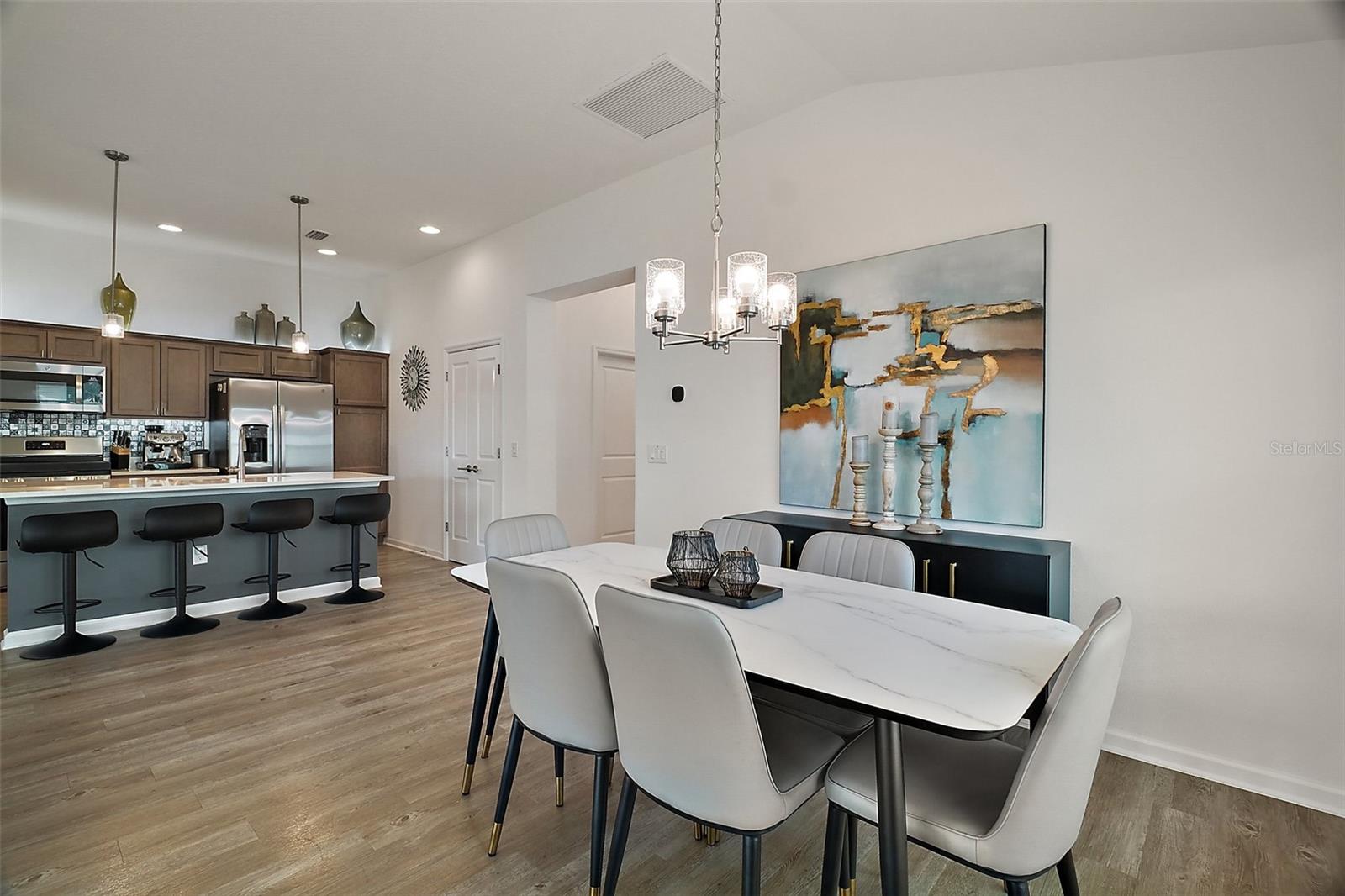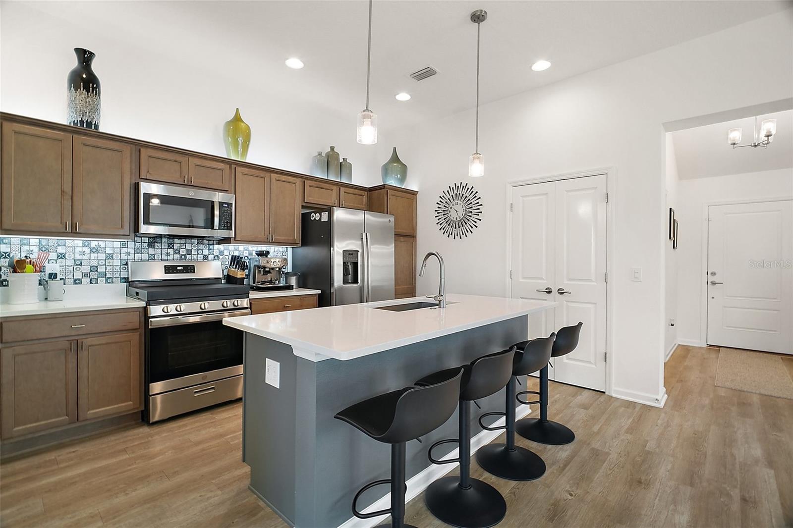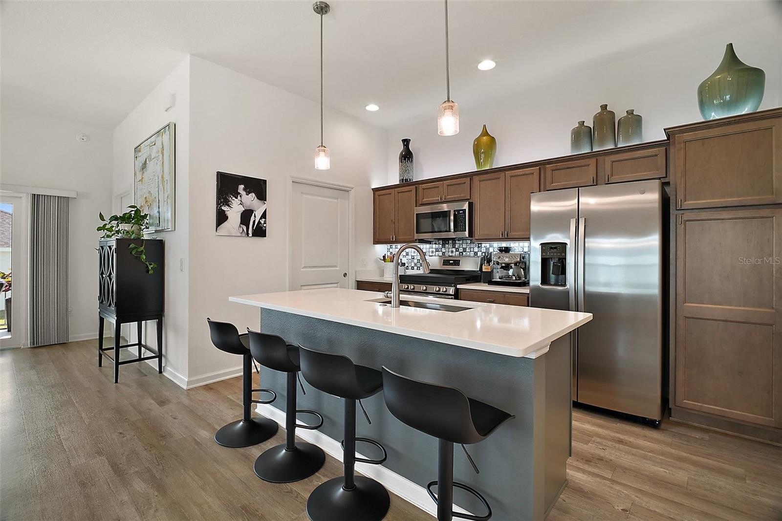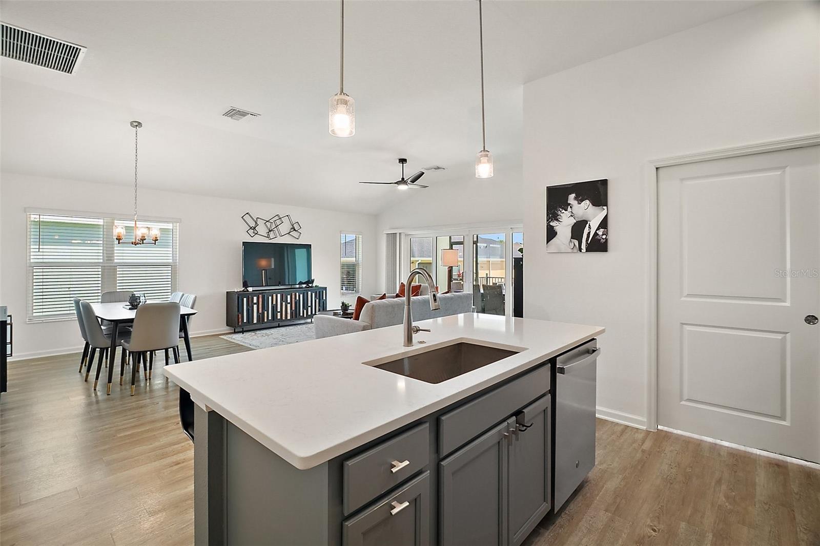 Bem -vindo a esta impressionante casa de modelos de gaivota de 2023, localizada na desejável vila de Denham. Desde o momento em que você chega, você apreciará o apelo do meio-fio, destacado por uma entrada de calçada de concreto estampada de 40 pés e paisagismo lindamente bem cuidado que define o tom da qualidade em toda a casa. Entre em um piso plano aberto e brilhante, com pisos de vinil de luxo por toda parte - nenhum tapete à vista. Os tetos são finalizados com textura knockdown para uma aparência limpa e moderna. A cozinha espaçosa foi projetada para impressionar, oferecendo bancadas de quartzo, utensílios de aço inoxidável, um backsplash de ladrilhos, iluminação atualizada e um fluxo contínuo na área de jantar, com tetos altos. A sala de estar é igualmente convidativa, com um ventilador de teto atualizado e fácil acesso à Lanai exibida - perfeita para relaxar ou divertir. A suíte primária oferece conforto e função, com dois armários walk-in, um teto de bandeja, um ventilador de teto e um banho de suíte em forma de spa com chuveiro de azulejos, pias duplas e bancadas de quartzo. Os quartos de hóspedes têm armários embutidos e são finalizados com pisos de vinil de luxo, enquanto o banho de hóspedes inclui uma combinação de banheira/chuveiro com balcões de granito. Esta casa também oferece uma lavanderia dedicada com lavadora e secadora de ponta, e uma garagem de dois carros terminada com piso de epóxi. Instalações próximas, como o Ezell Recreation Center, oferecem piscinas, quadras esportivas, aulas de fitness e clubes sociais. As aldeias, Flórida